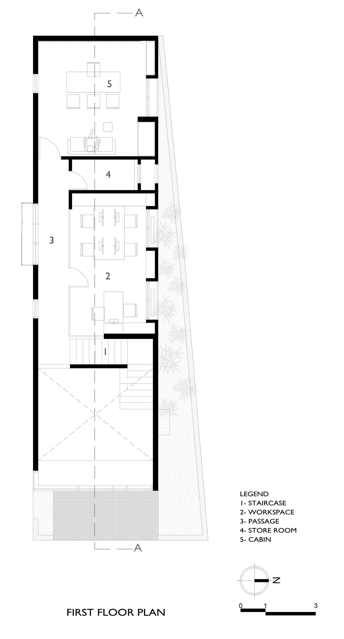 The idea of the building was to take in maximum east light through the double-height lobby and cut off the harsh southern sunlight. All the work area openings face north to ensure perfect daylighting. The ground floor cabins are extended outside into small courtyards to create a soothing ambiance.