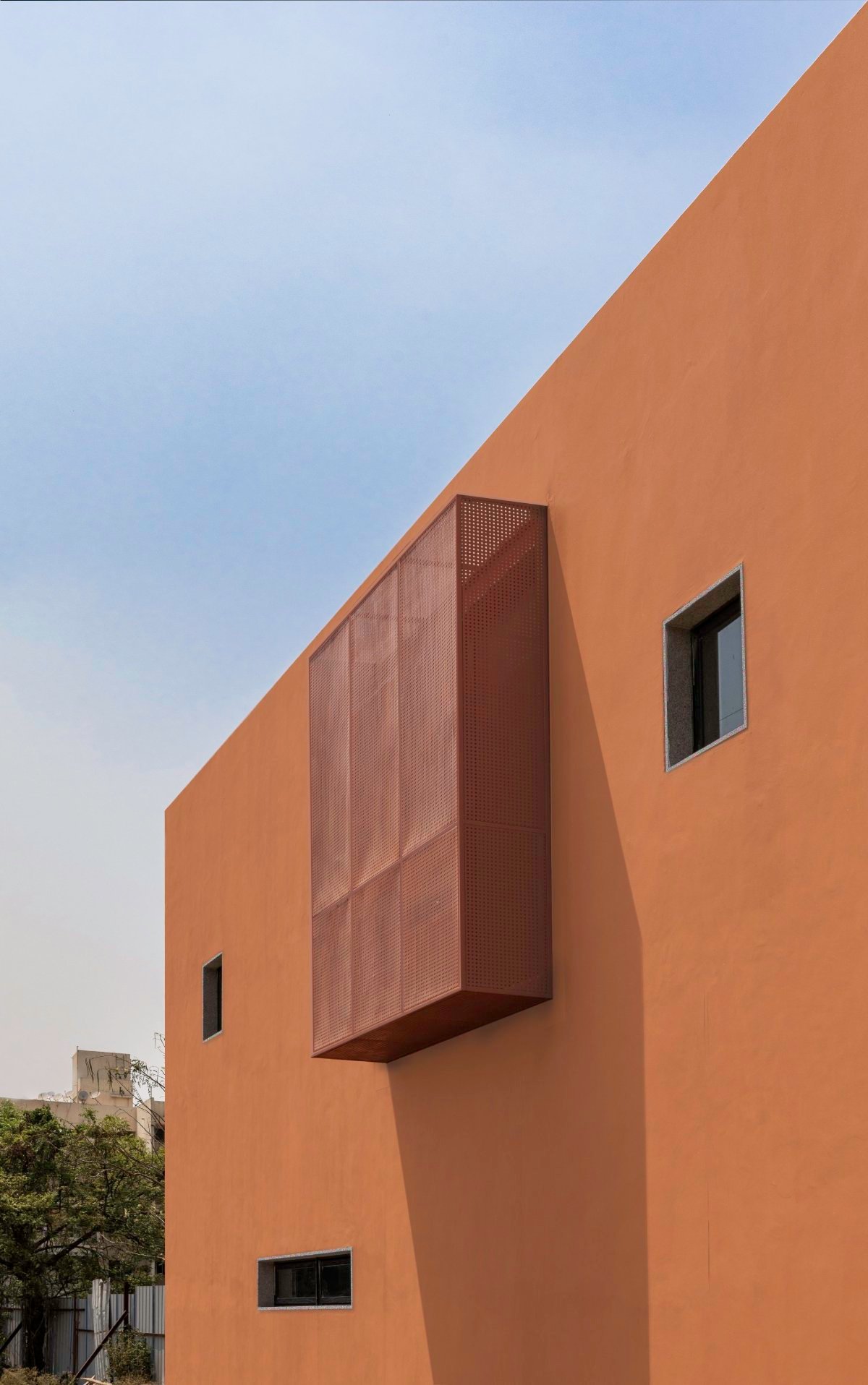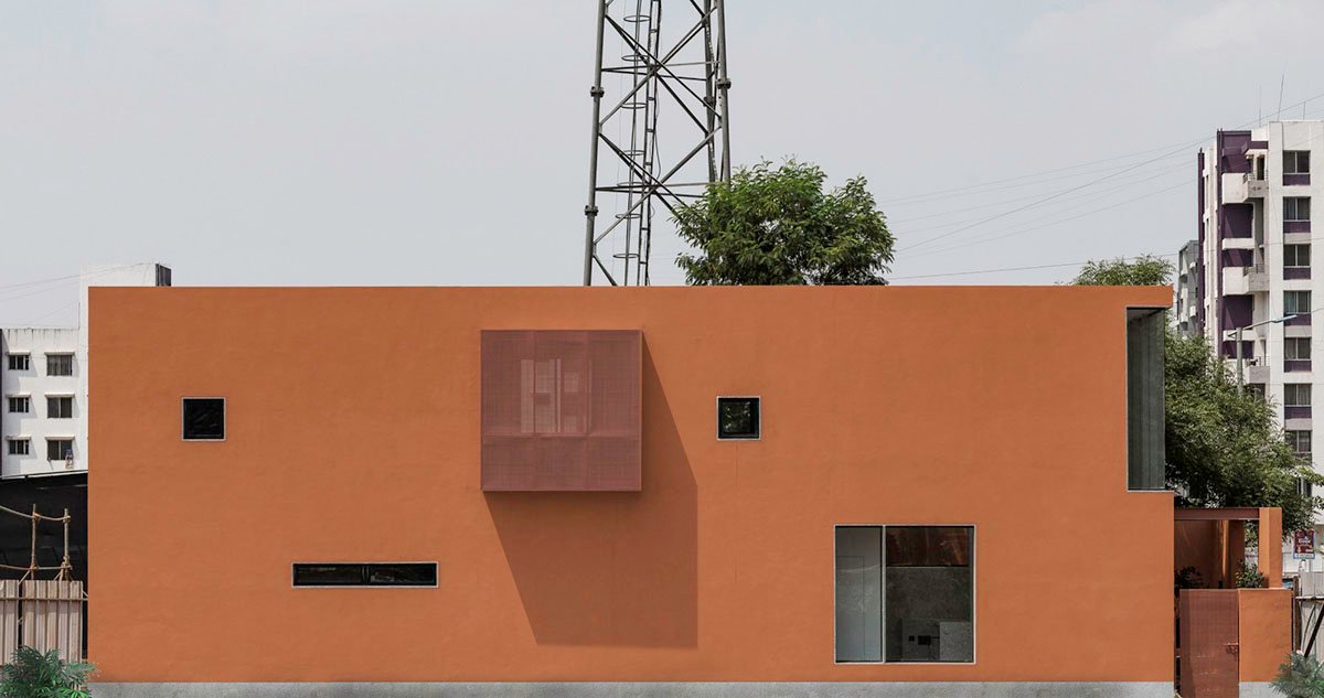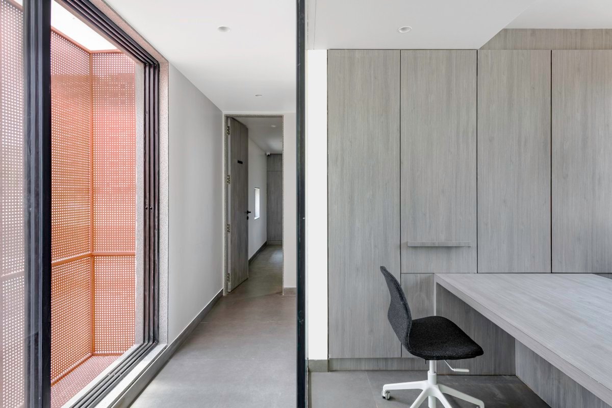The exterior of the building is textured with terracotta red pigmented sand to stand out in the nearby context. At the same time, the interiors were kept primarily white. The minimalist approach and integral design create a serene and relaxing atmosphere for the working staff members.