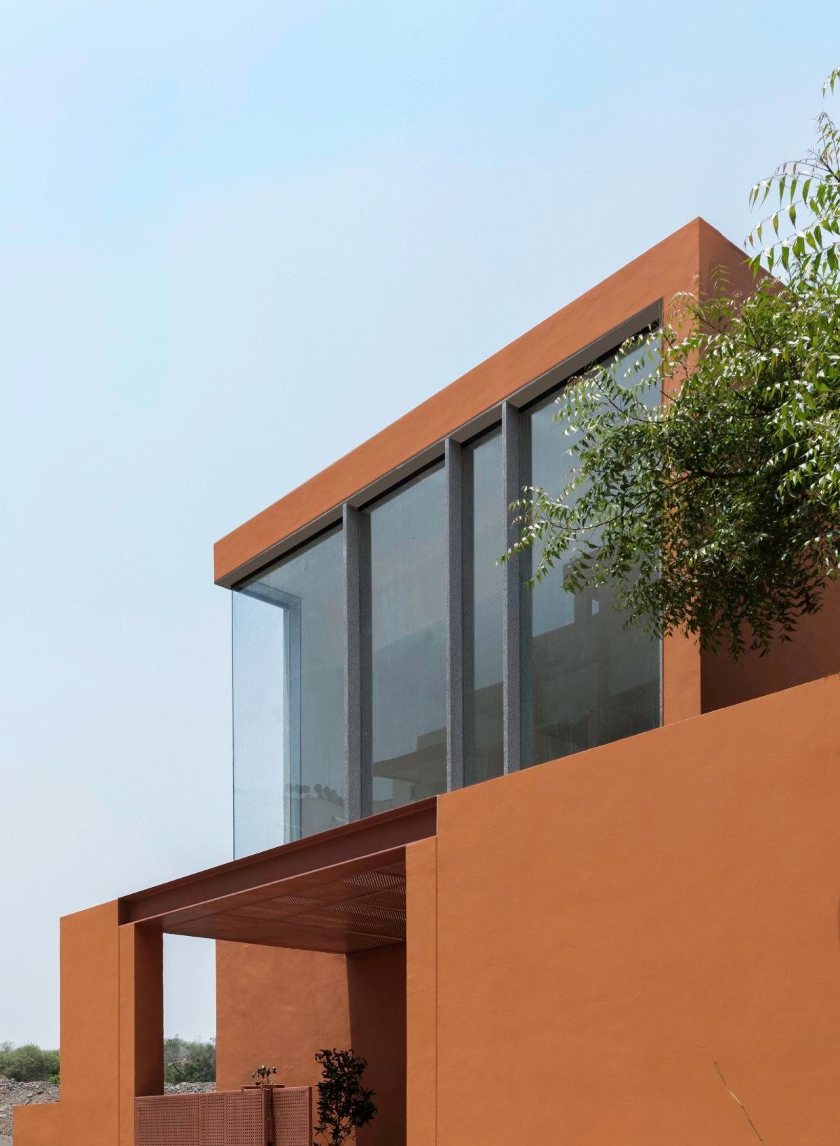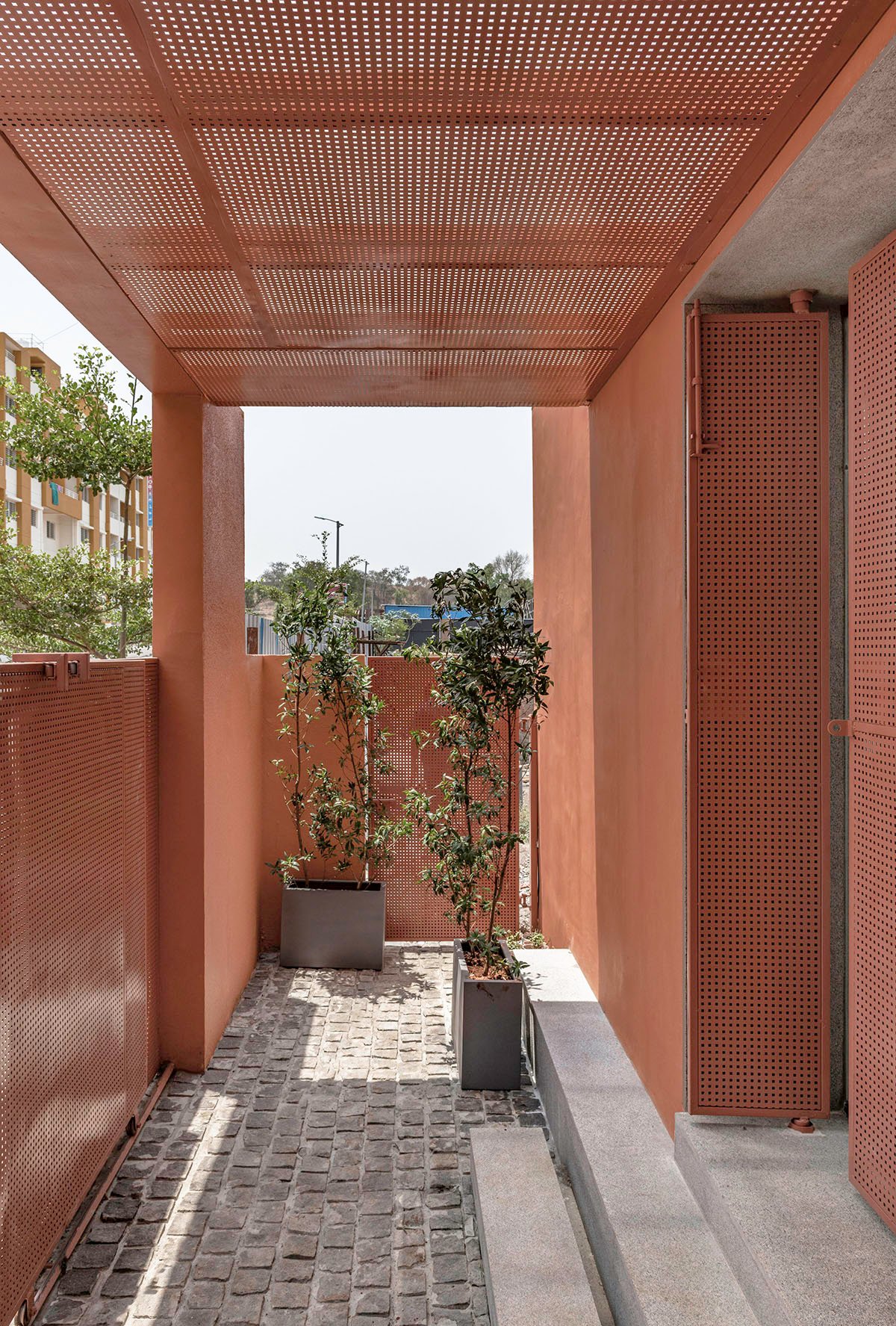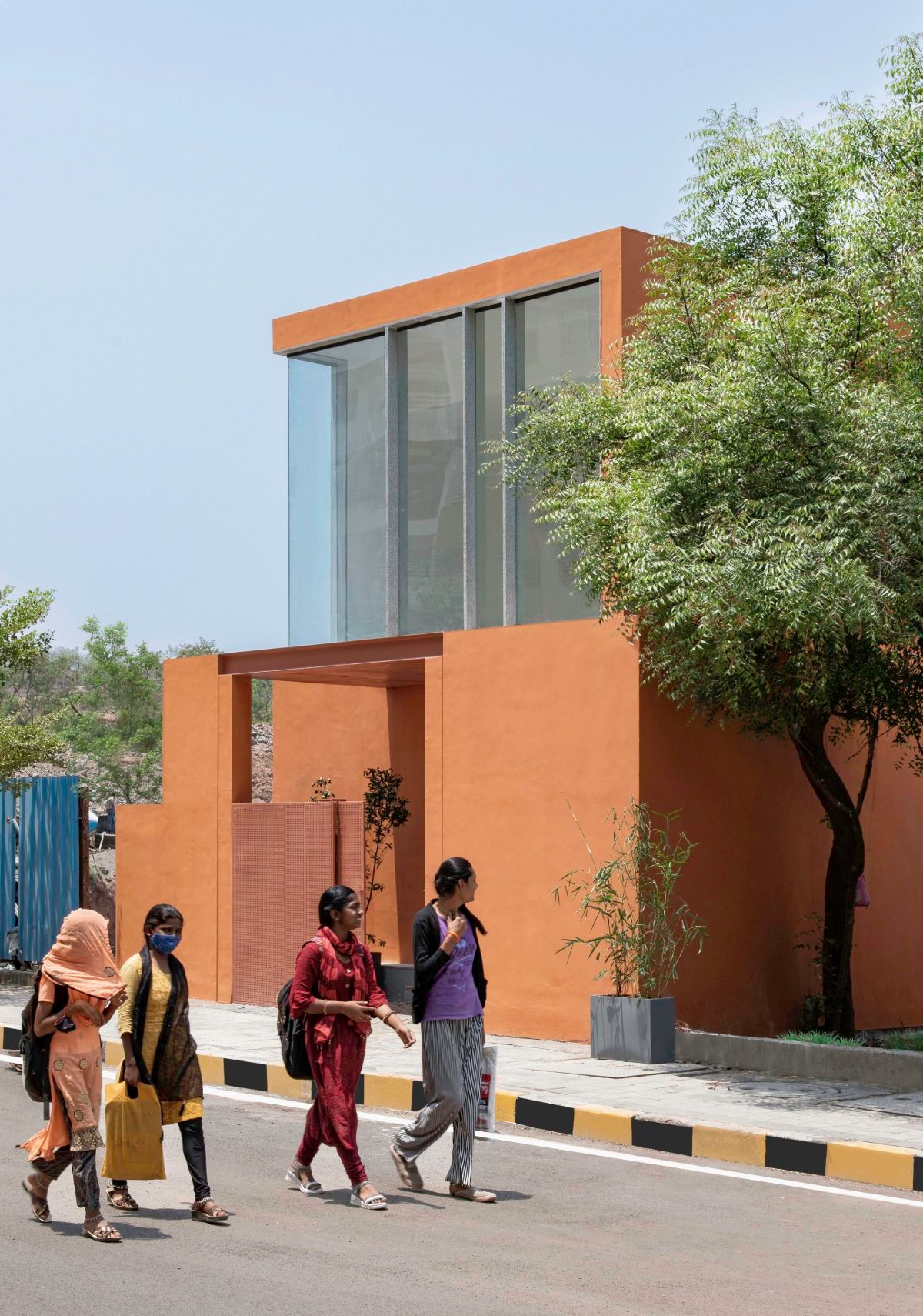 The exterior of the building is textured with terracotta red pigmented sand to stand out in the nearby context. At the same time, the interiors were kept primarily white. The minimalist approach and integral design create a serene and relaxing atmosphere for the working staff members.