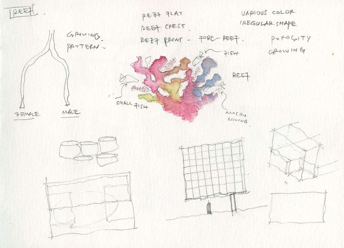 From an architectural theory point of view, Reef cannot be clearly classified as an organic building, however, the creation of spaces that can be organically integrated into the site is the core of the reef design concept. Emerging from a point at the entrance, the space follows the logic of an underlying grid, bringing the guest a rich permeable spatial experience of the interior and exterior, and the organic atmosphere of the reef gives rise to a social feeling that is rooted in the site. Moreover, guests often spend the afternoon in the entrance cafe after their haircut, talking with friends or the owner.