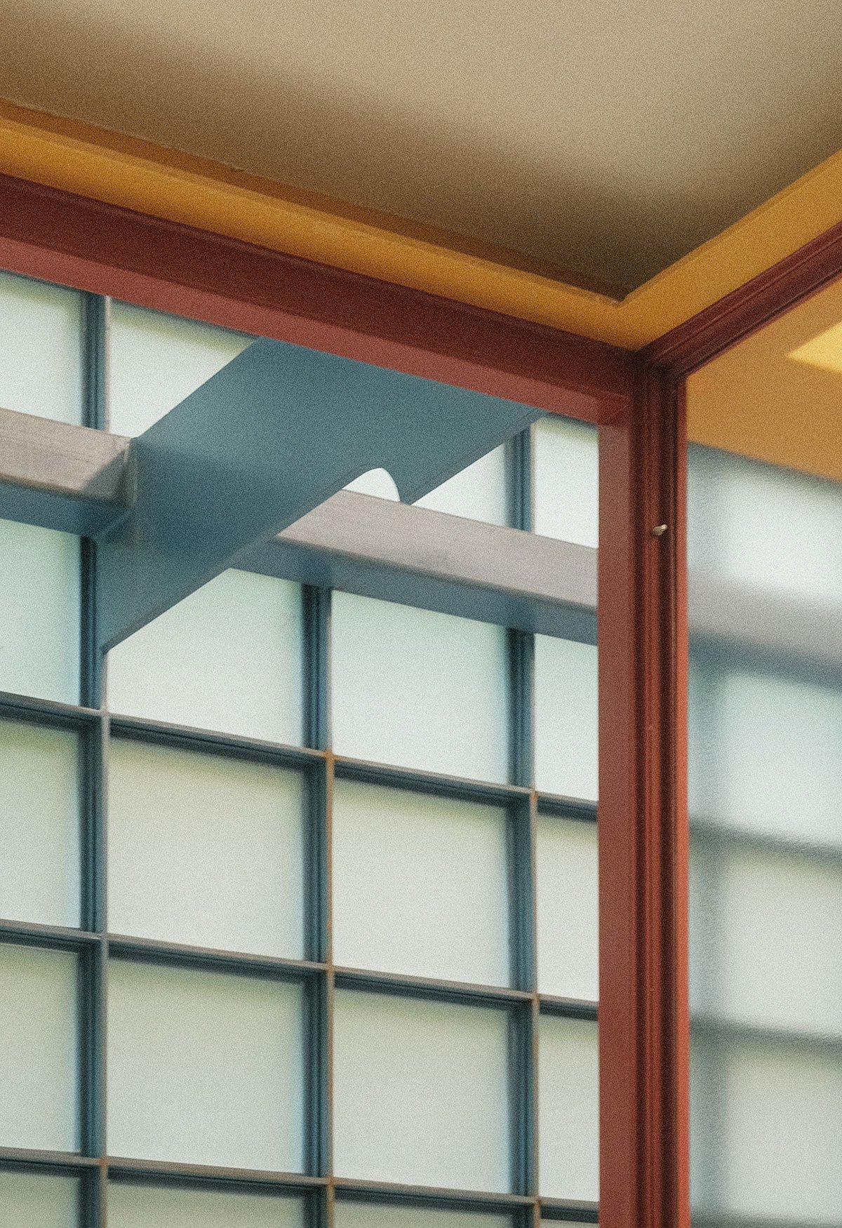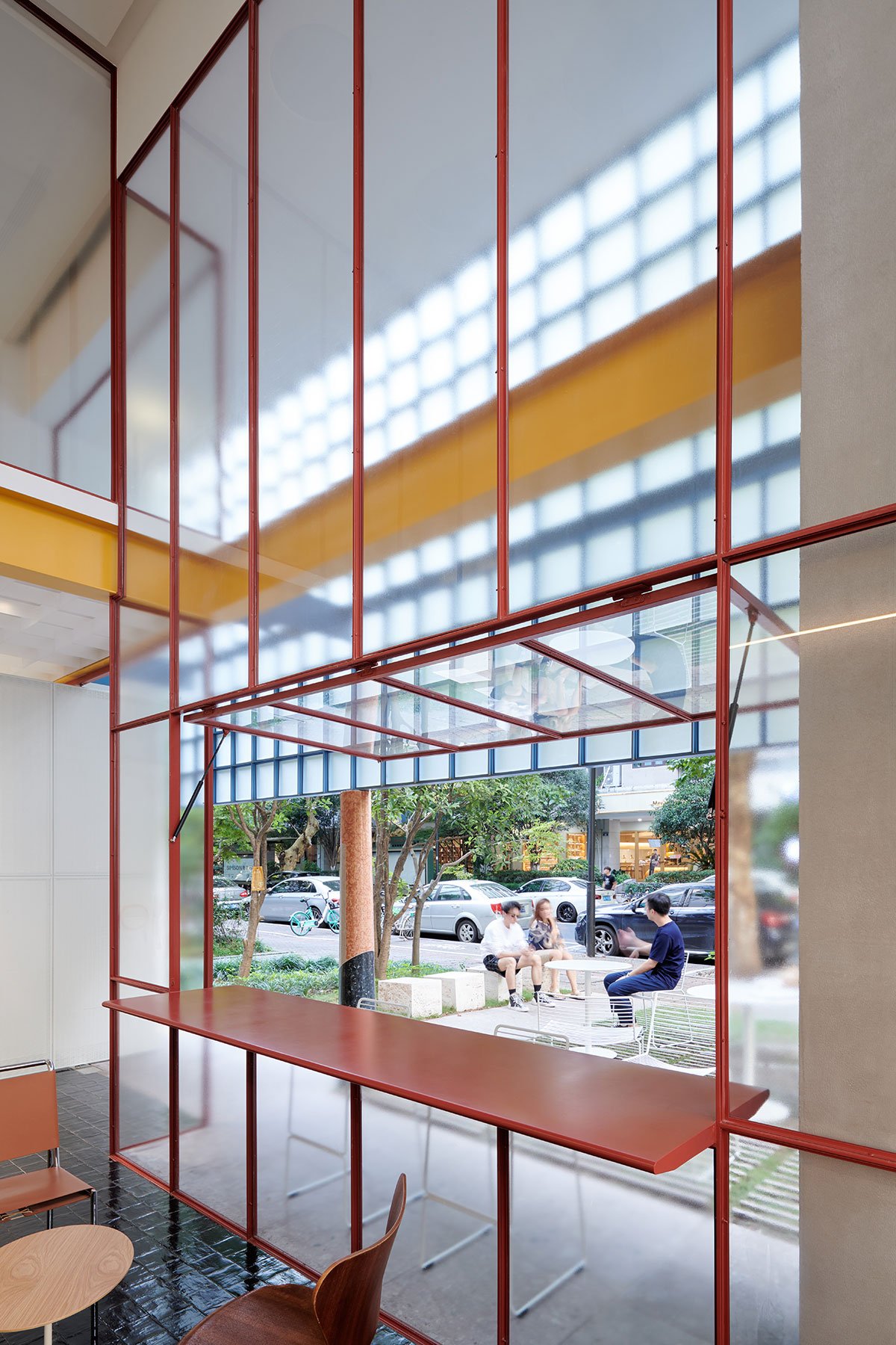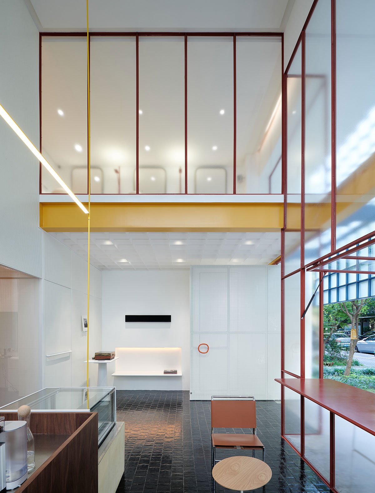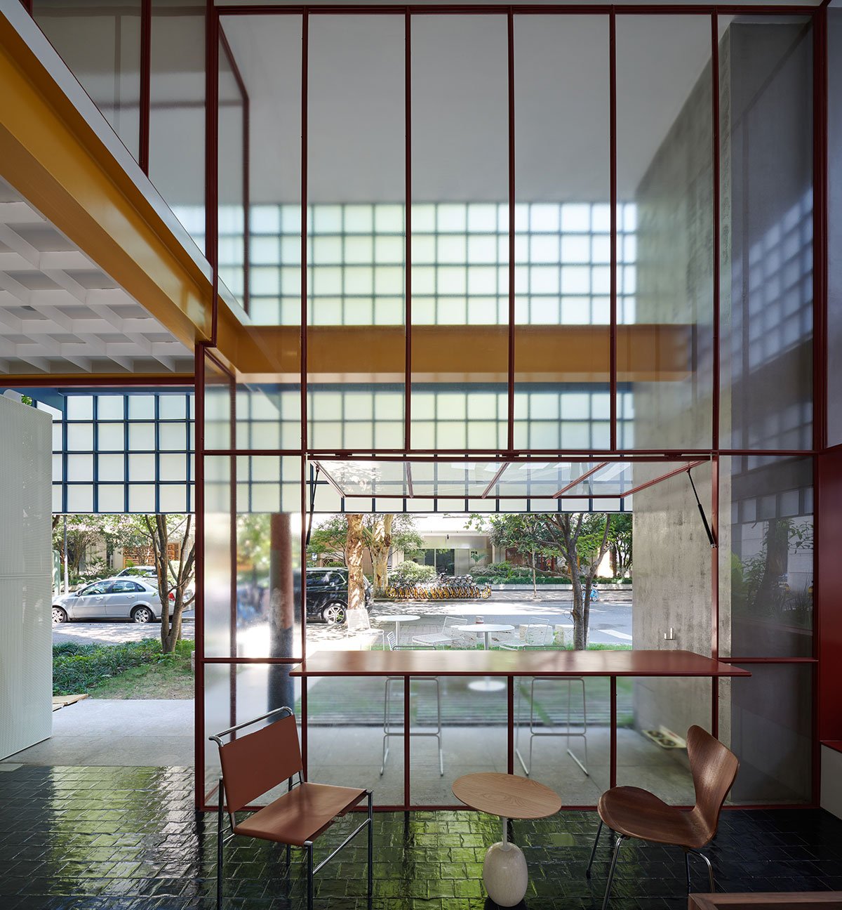 The blue façade grid grows out from the column ends, and the steel structure within the space is labeled yellow, with a T-shaped steel structure running through the doorway and extending to the end of the interior. The red window frames are wrapped around the yellow steel beams as if they were creatures. Standing indoors, the view of the exterior through layers of glass is obscured by the translucent façade above, so that the view is naturally focused on the street and the landscape.