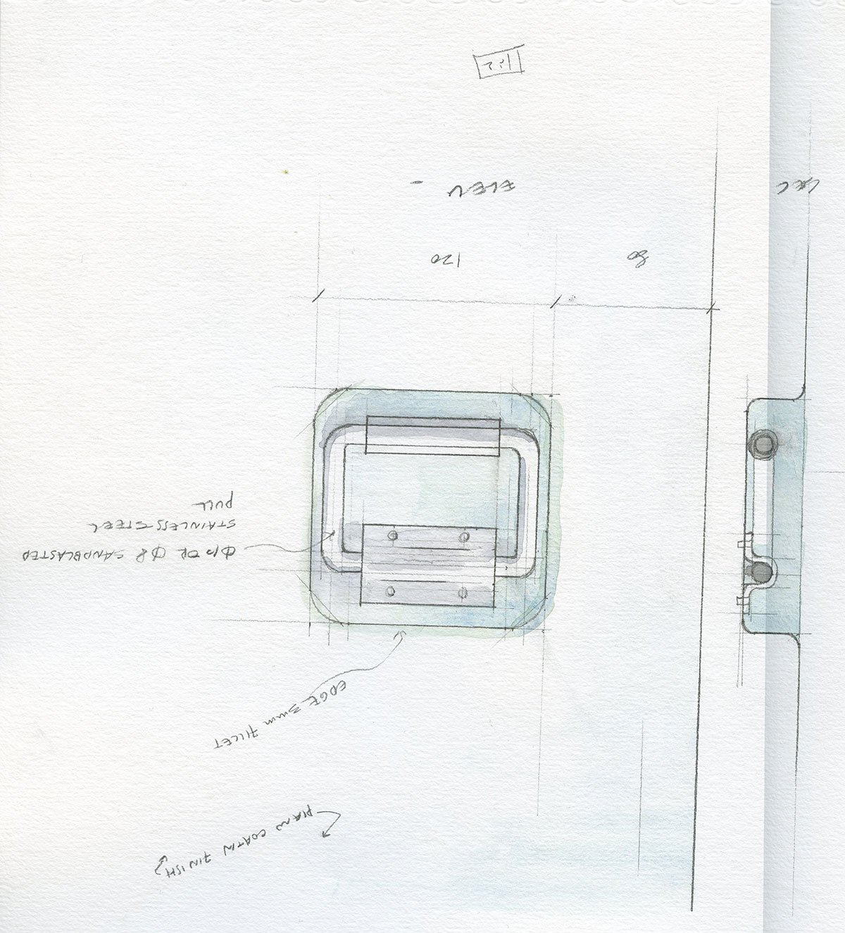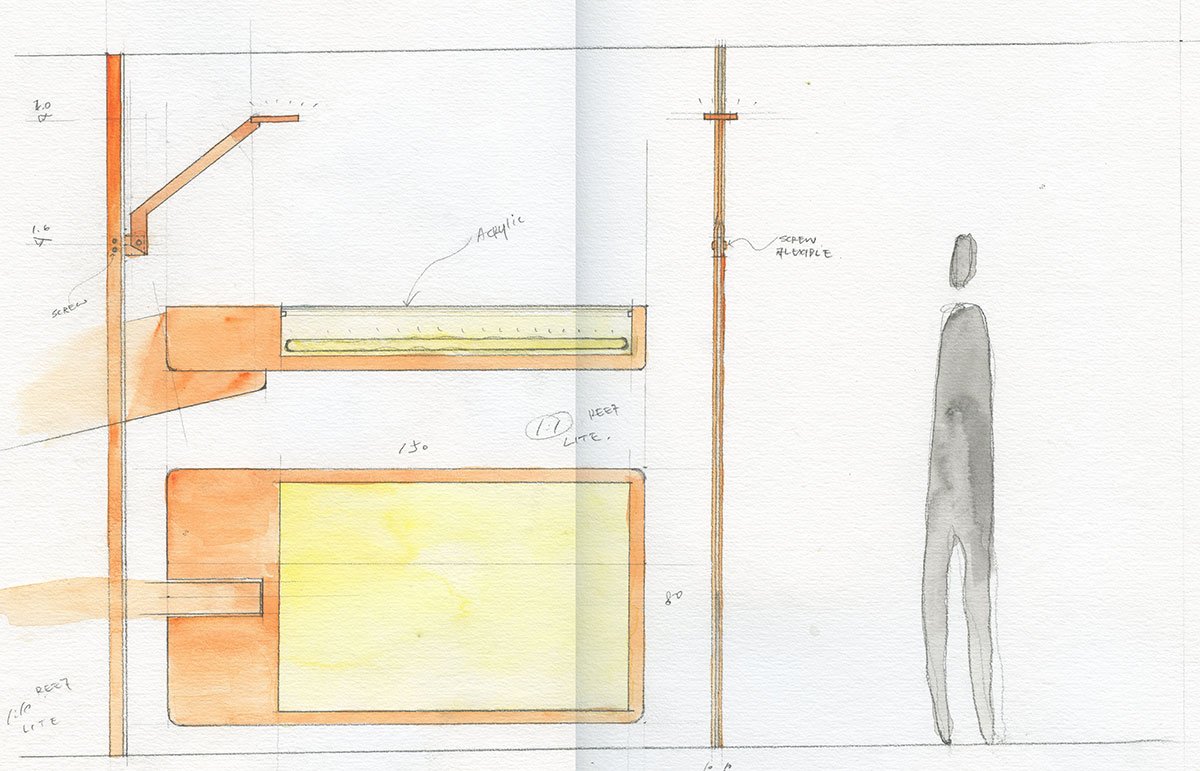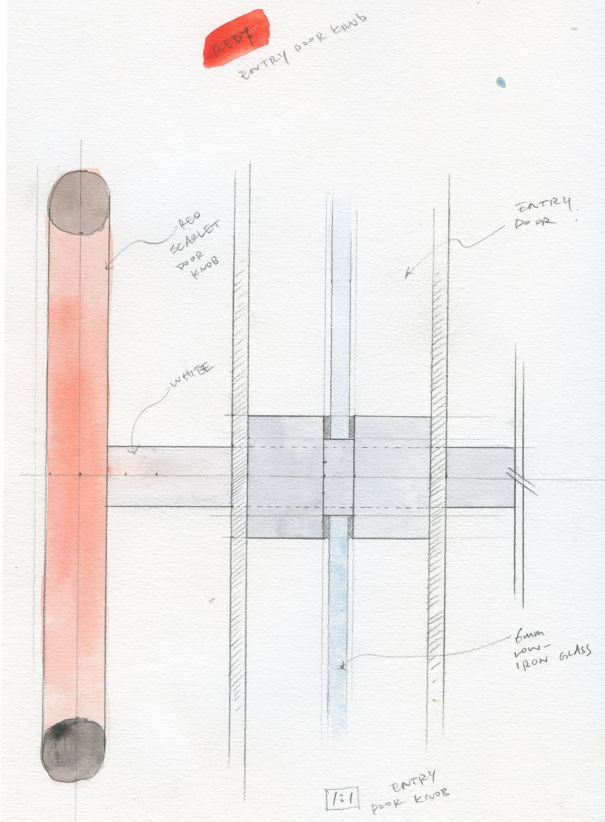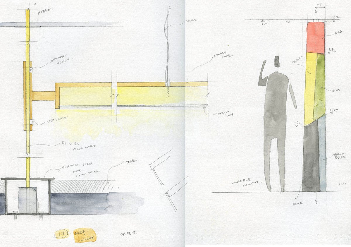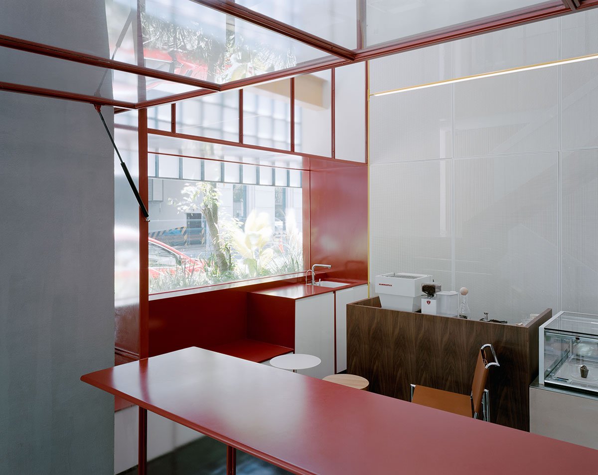 The blue façade grid grows out from the column ends, and the steel structure within the space is labeled yellow, with a T-shaped steel structure running through the doorway and extending to the end of the interior. The red window frames are wrapped around the yellow steel beams as if they were creatures. Standing indoors, the view of the exterior through layers of glass is obscured by the translucent façade above, so that the view is naturally focused on the street and the landscape.