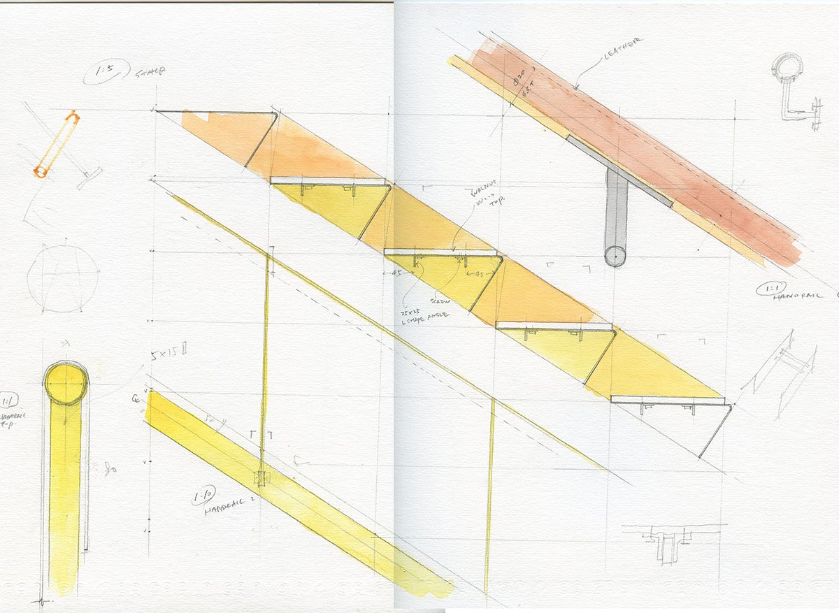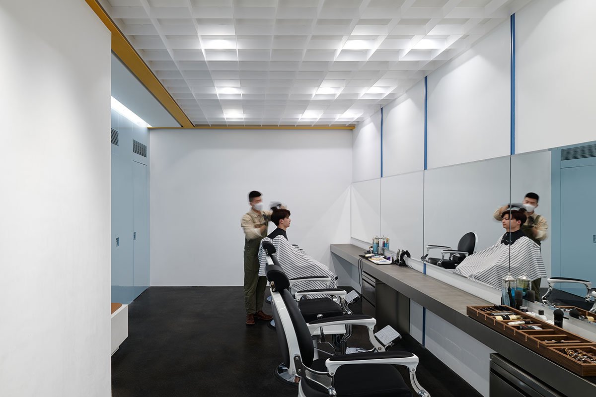 The yellow steel structure extends into the Barber area and terminates at the end of the space, the acrylic grid ceiling is modulo the same as the façade grid, and the blue vertical metal dividers behind the mirrors also follow the same potential modulo rule, corresponding to the acrylic grid of the ceiling. The blue piano lacquer walls reflect a sense of elegance and vintage in keeping with the men’s barber.