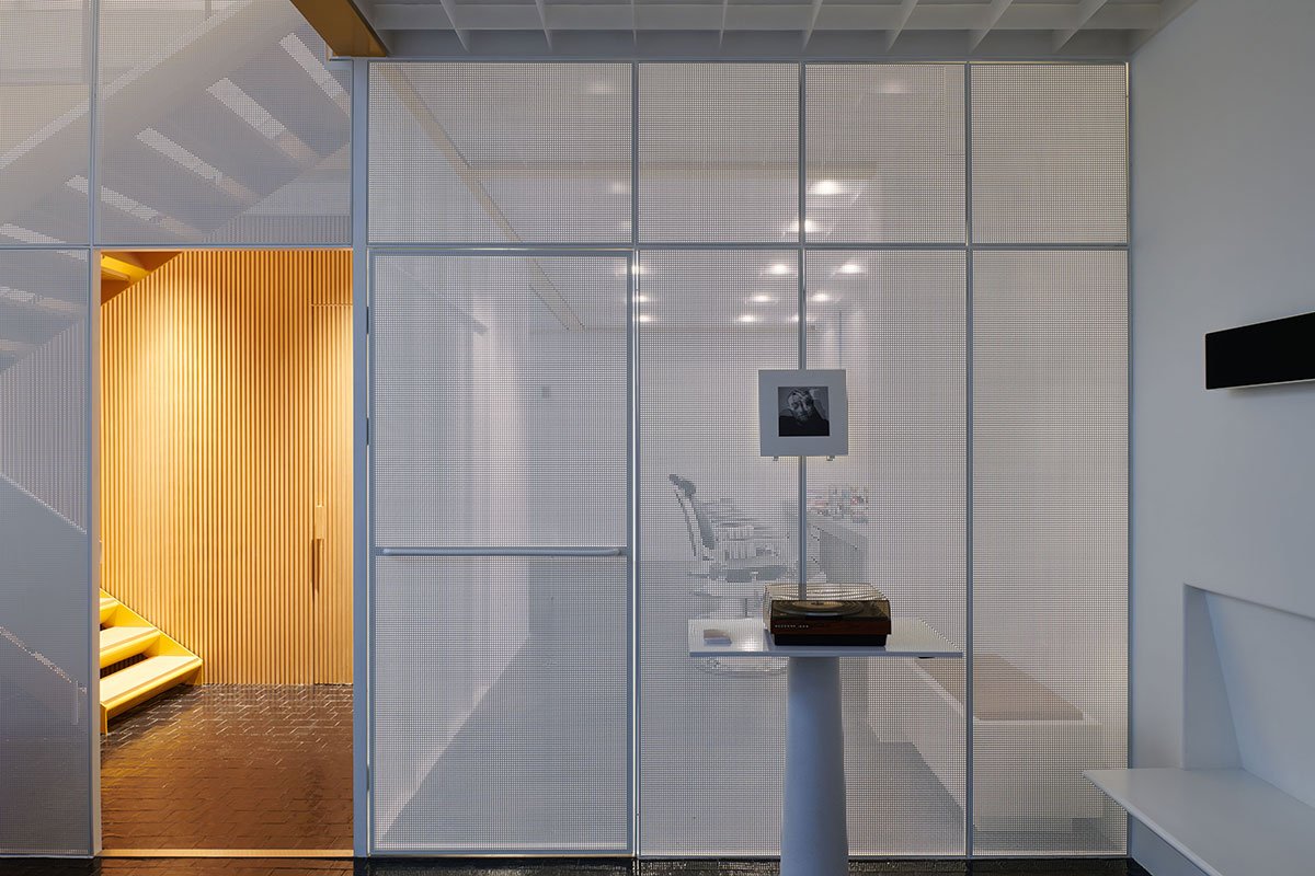 The massive grid facade is raised by 2.1m on stone columns, creating a striking contrast in volume, while the metal grid of the facade extends to the other side of the building facade, where there are no columns to support it, and the entire grid system seems to hover lightly on the outside of the building. The blue metal grid is filled with sand-blasted glass, and above 2.1m, the interior light becomes blurred and soft through the glass, while below 2.1m, the interior space can be seen directly through the windows.