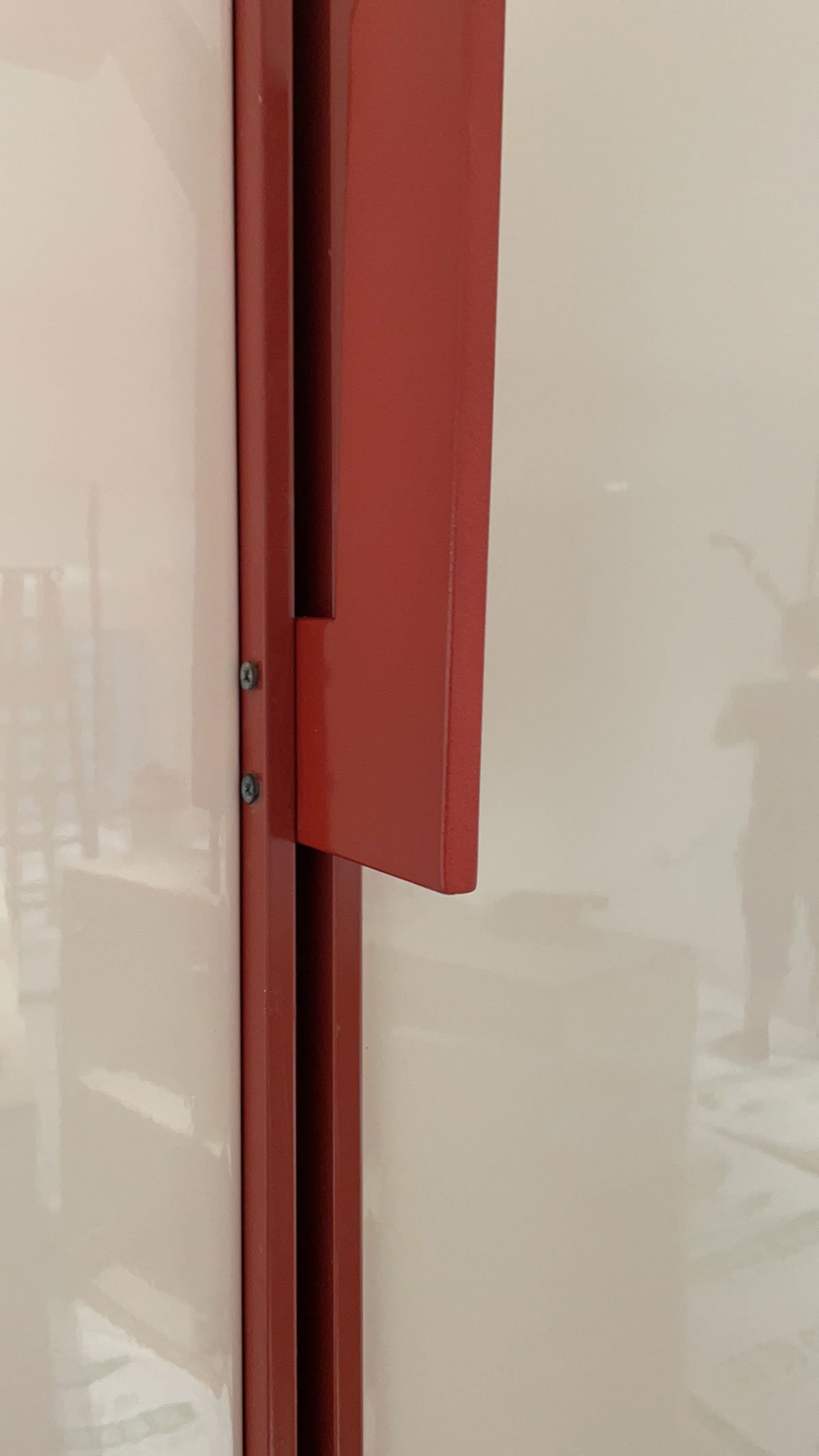 The blue façade grid is connected by metal elements to the yellow structure and red metal separations. All three adhere to the potential modalities of where each should be in the intended grid.