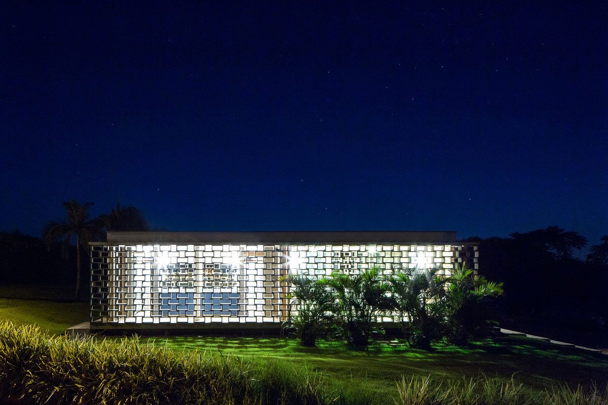 In the main elevations, the concrete block works as a hollowed-out element, creating a filter between interior and exterior, providing an interesting dynamic in the way the sunlight enters the room in different hours of the day. The hollowed-out element in the facades dissolves the limits, letting the surrounding colors, natural ventilation and illumination to enter the interior, still constituting a physical barrier. On the other hand, after dawn, the building is lit and emanates light through its hollowed-out walls.