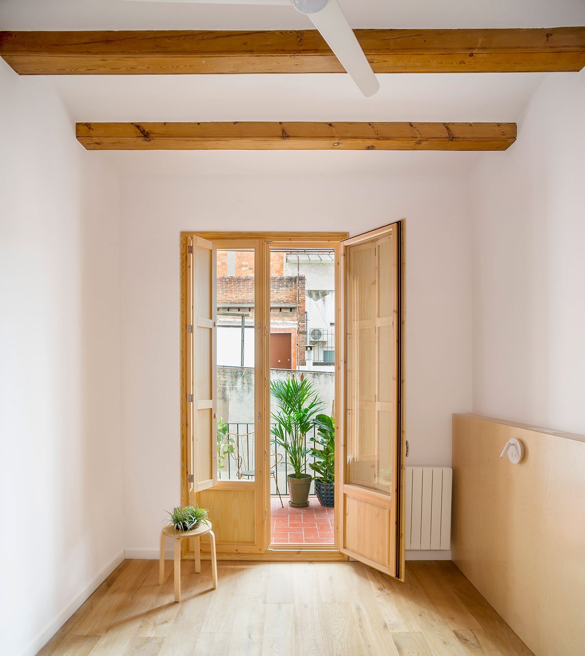 The original balcony windows of the main façade were recovered, stripping them and installing insulating glass. The aluminum windows of the rear facade are replaced by wooden ones, like the ones that should have existed originally. The fixed furniture is made to measure with light birch plywood. Both the kitchen furniture, as well as the bathroom furniture and the bedroom headboard.