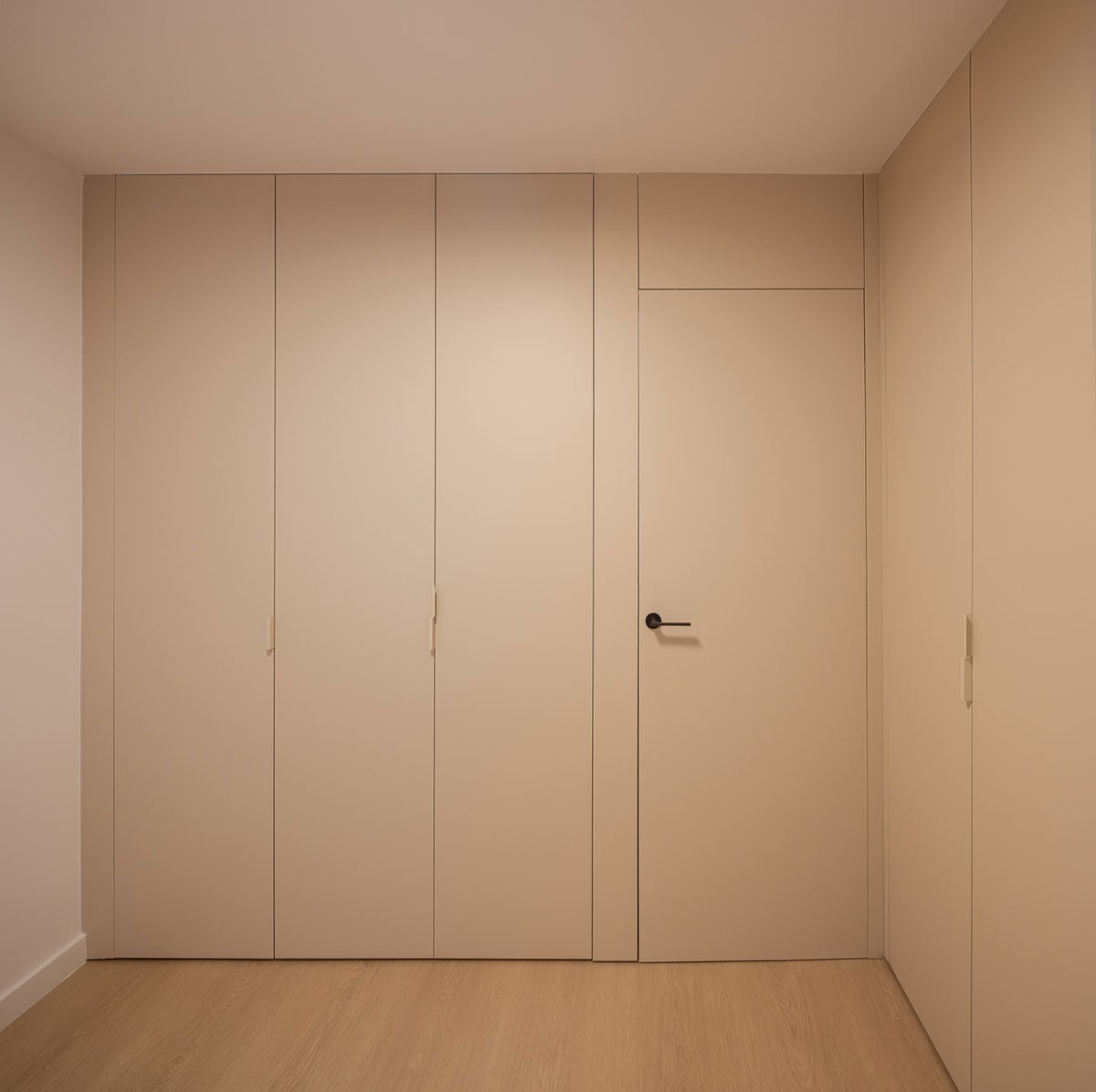 The furniture and doors are treated as large panels, within this palette of materials, understanding them as part of the walls. In this way, the doors are built flush with the covers and these reach the limits of the walls and the ceiling, giving the appearance of a smooth cladding.