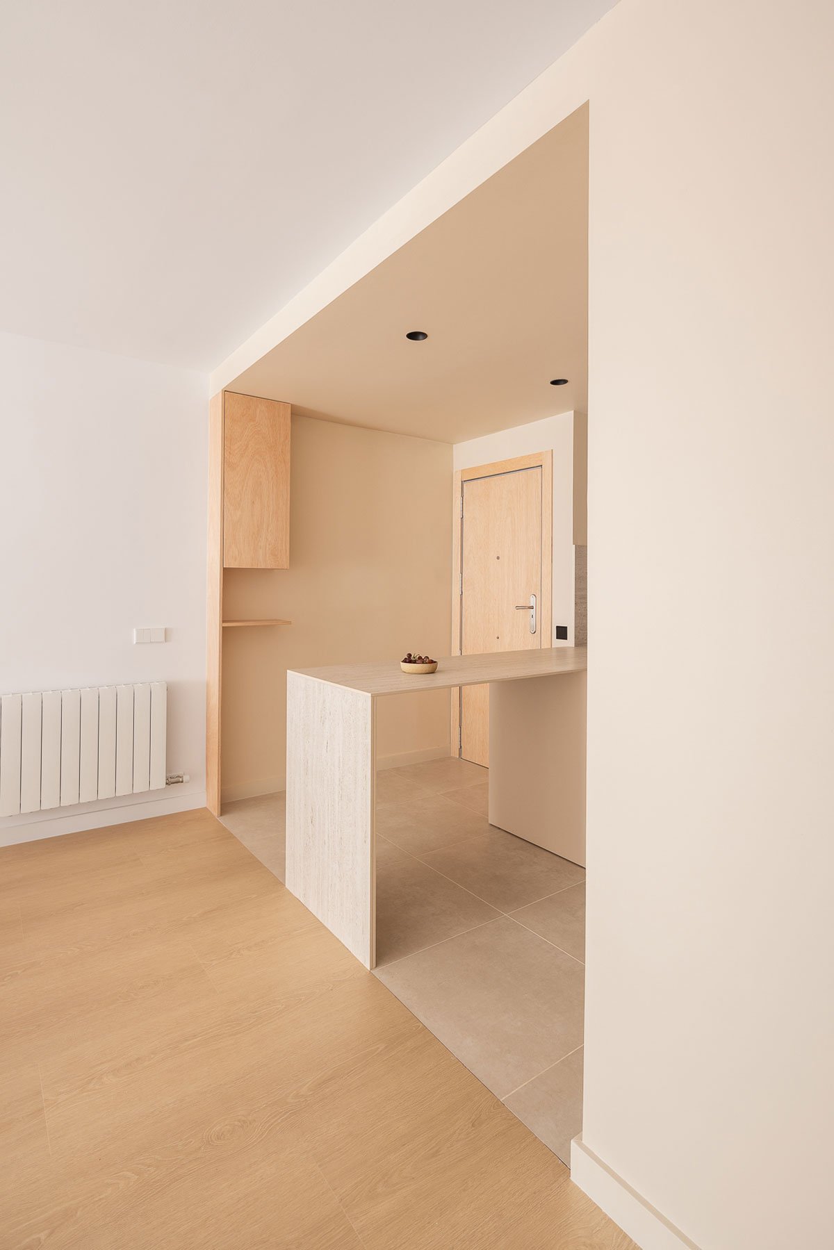 [Text as submitted by architect] The project comprises the renovation of a two-bedroom apartment within a large housing building in el Masnou, a coastal city near Barcelona. The dwelling featured a fragmented distribution, with a large entrance, a small kitchen and a narrow and enclosed corridor.
