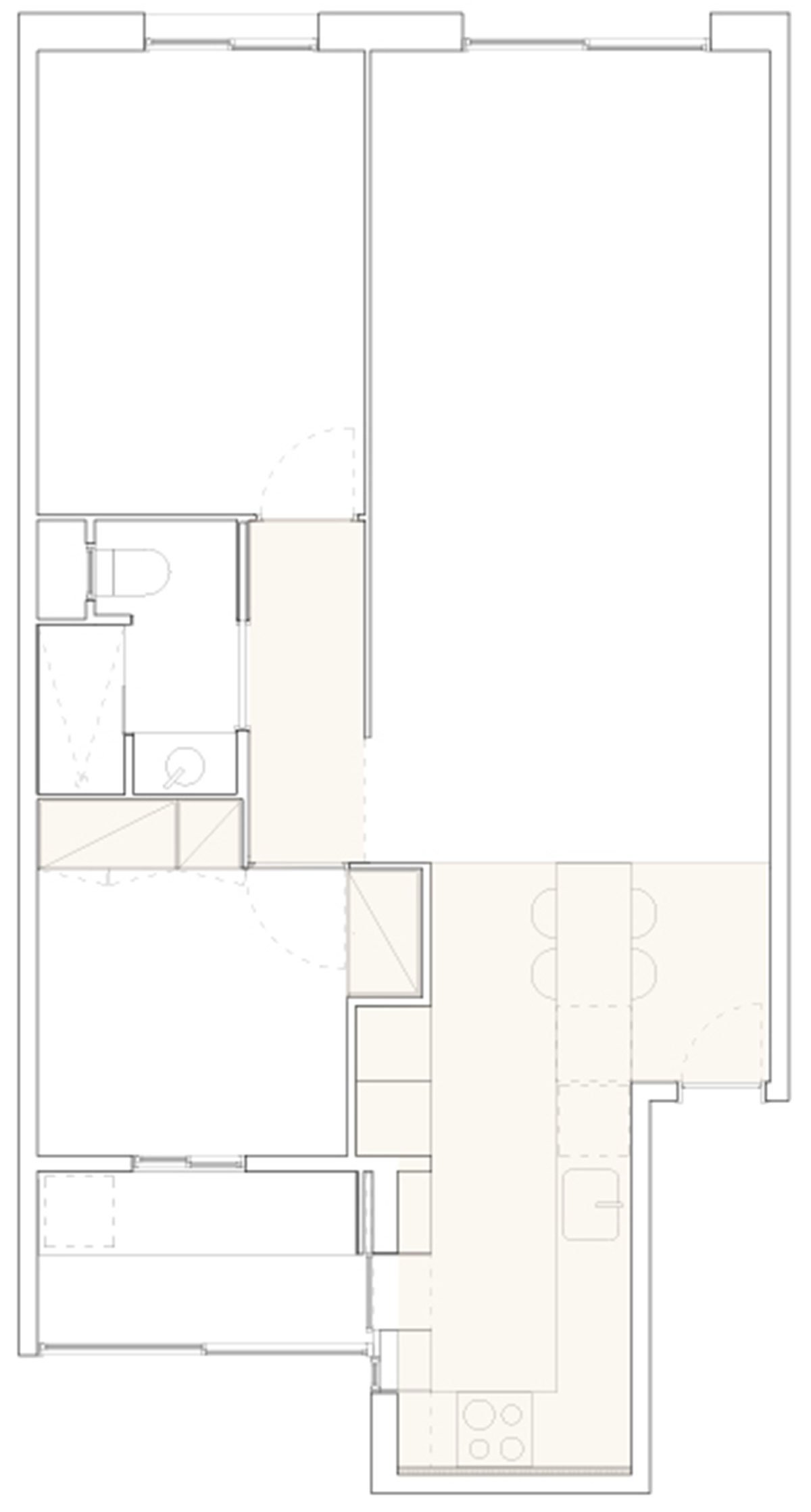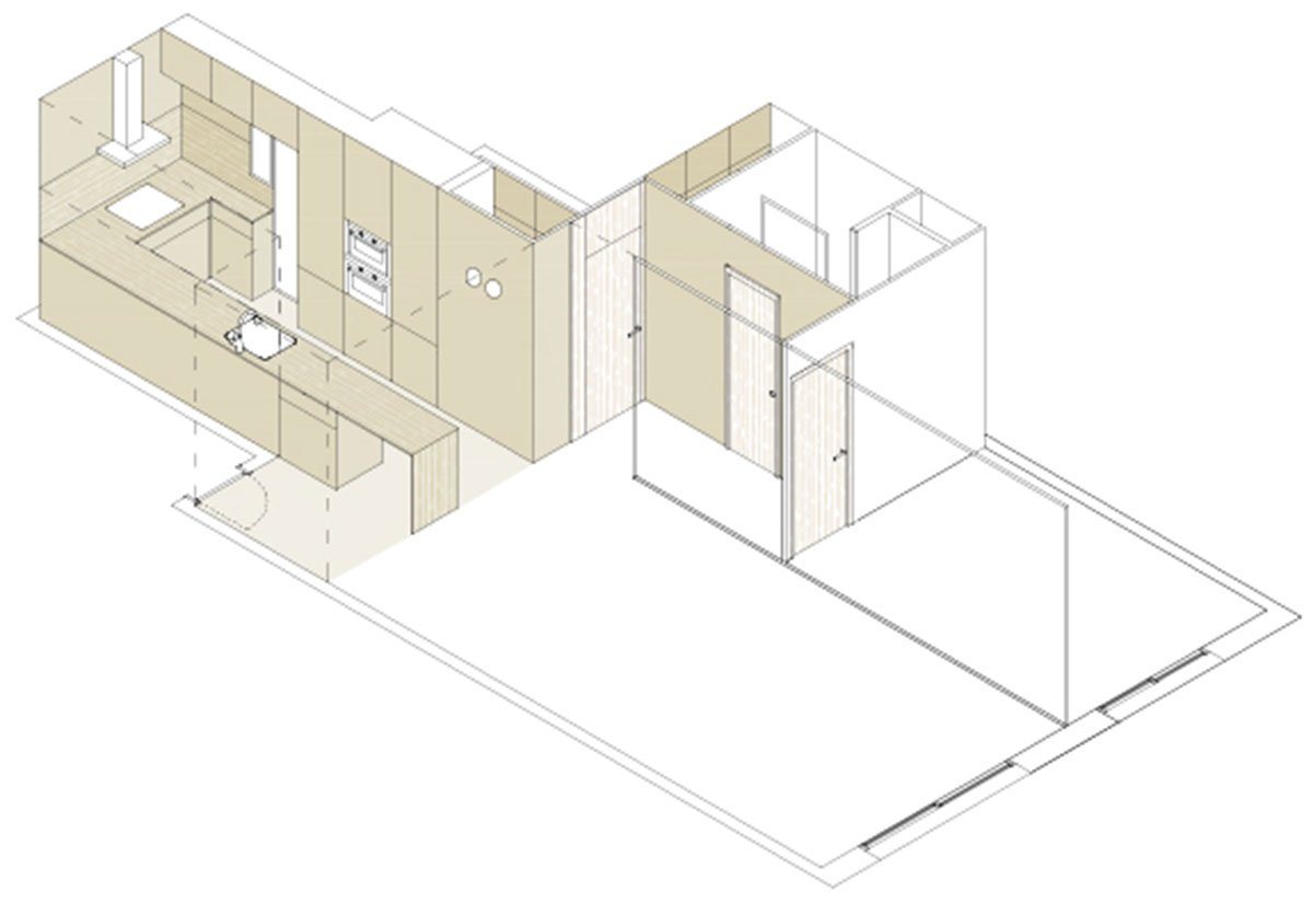 This area is extended until it is aligned with the corridor, whose doorway is widened to improve the connection and fluidity with the living space. Both rooms, understood as passage or transition spaces, are formally linked with the use of materials and color, singling out these areas, distinguishing them from the more static rooms, such as the living room or bedrooms. The designers opted for beige and ocher hues in different textures: solid color on walls, ceilings and furniture, stone on the countertop, and plywood for the doors.
