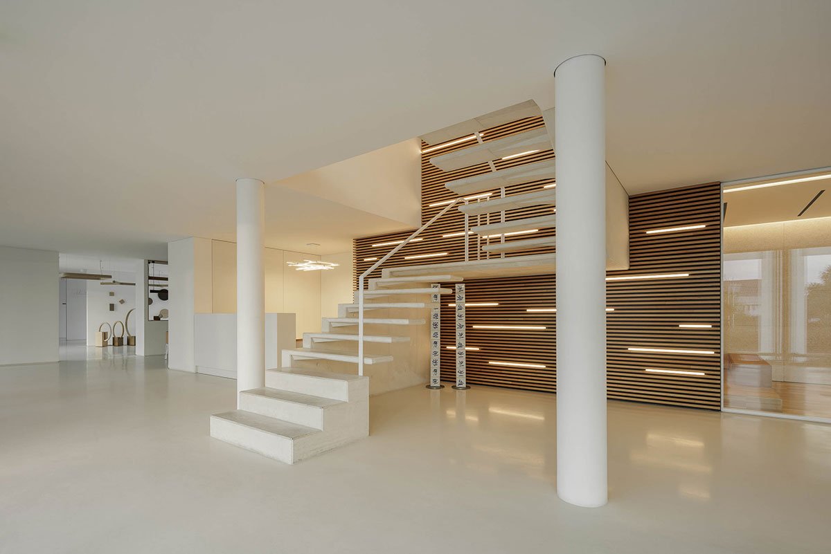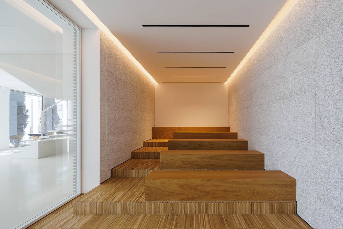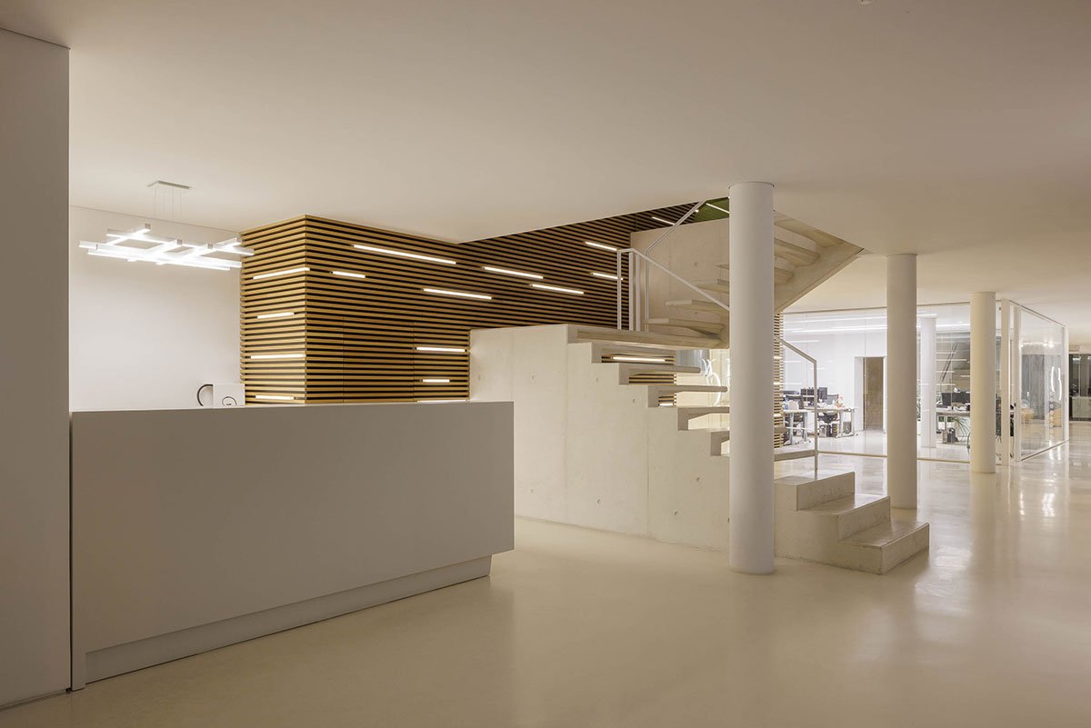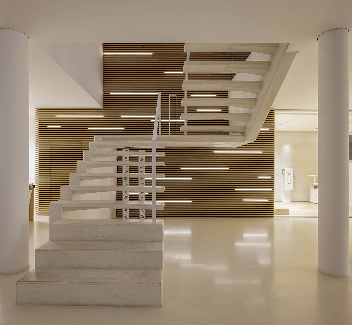 On the 1st floor, the showroom space was innovated and renewed with the introduction of new solutions for the display of lighting products manufactured and sold by this company, highlighting in the reception area the staircase leading to the 2nd floor, due to its differentiating shape in exposed white concrete and the horizontal wooden slat covering of the adjoining and continuous wall to the curved ceiling.