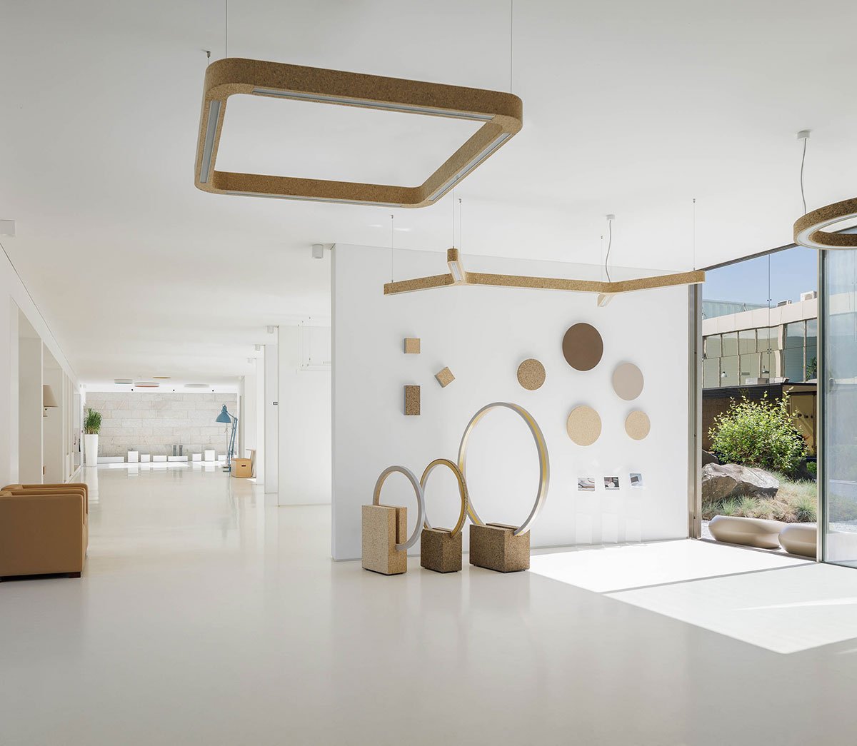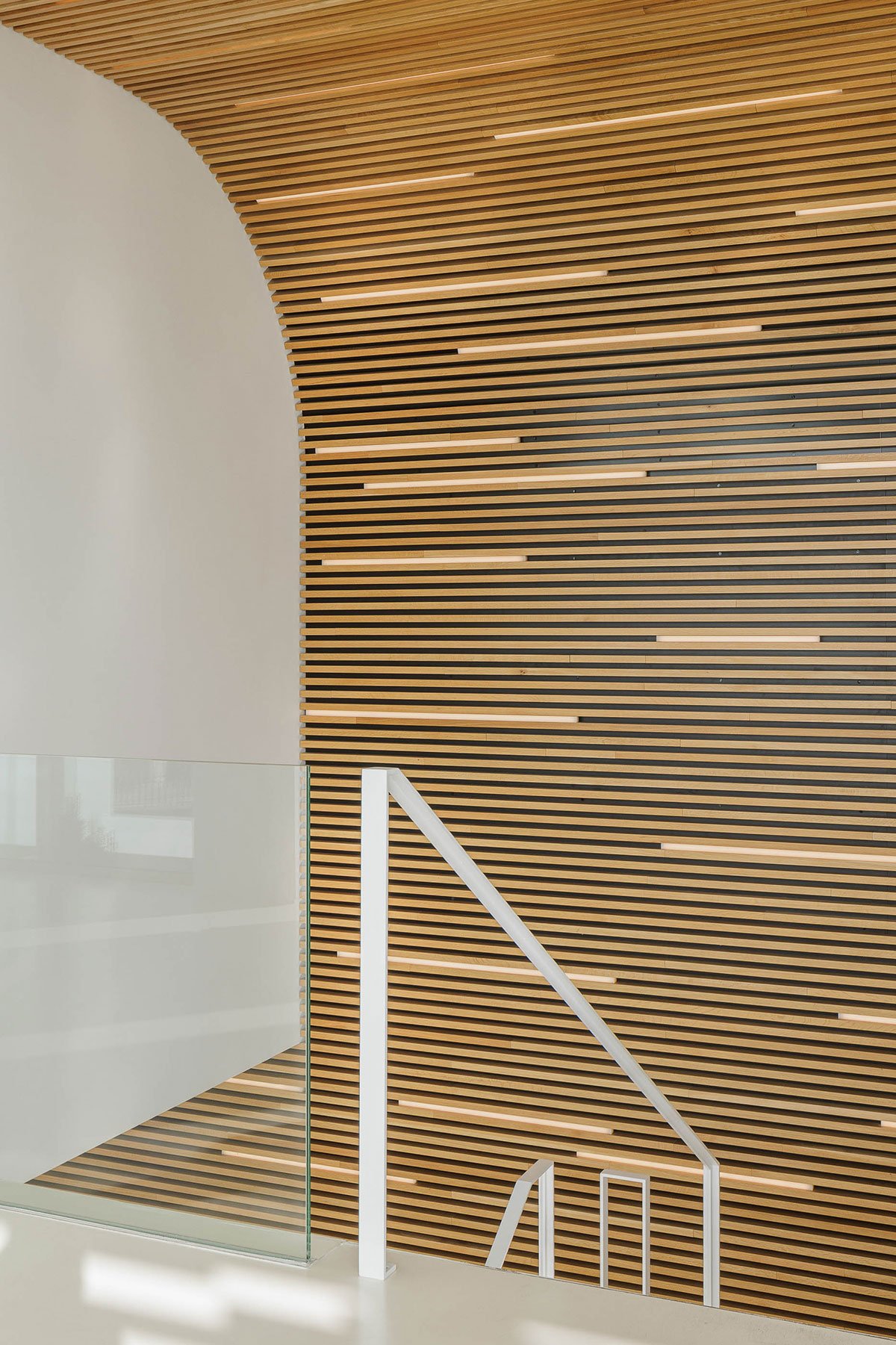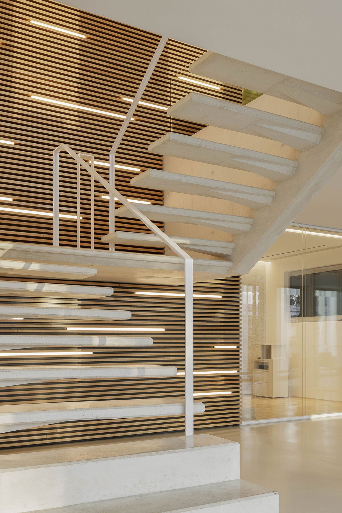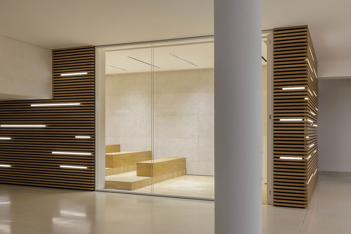 On the 1st floor, the showroom space was innovated and renewed with the introduction of new solutions for the display of lighting products manufactured and sold by this company, highlighting in the reception area the staircase leading to the 2nd floor, due to its differentiating shape in exposed white concrete and the horizontal wooden slat covering of the adjoining and continuous wall to the curved ceiling.