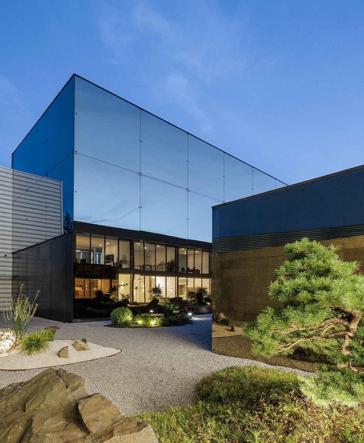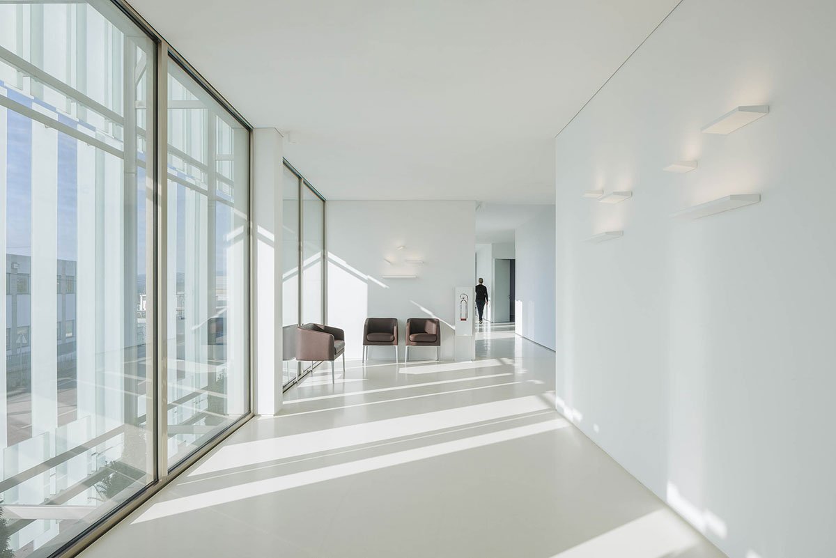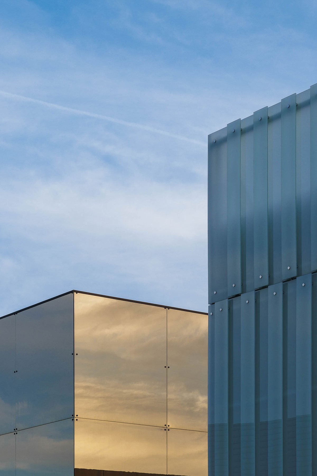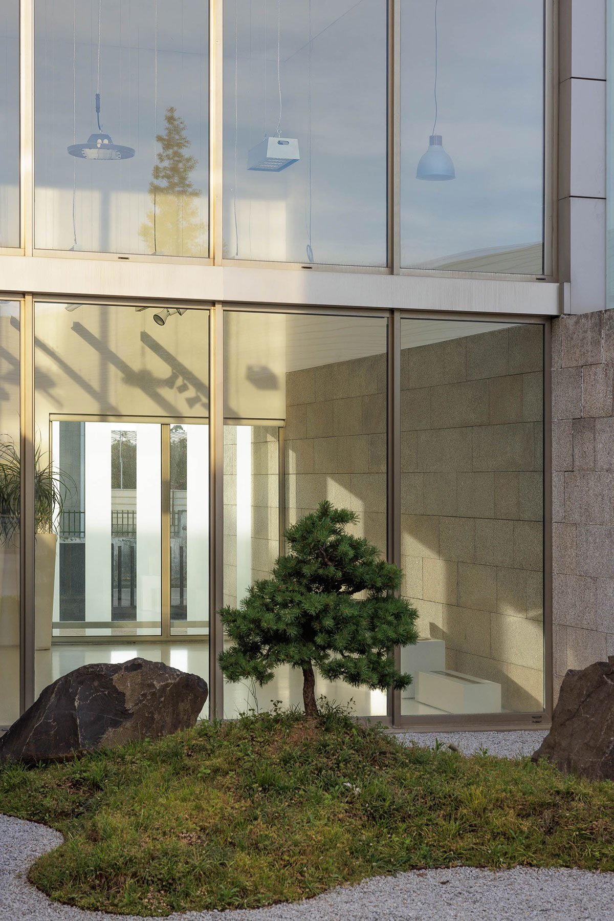 The showroom and cafeteria open and extend into a landscaped courtyard, a space that is reflected in the dark mirrored glass facades of the lighting laboratory building, providing images and environments depending on the variation in sunlight.