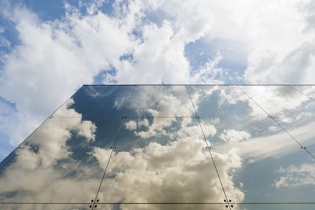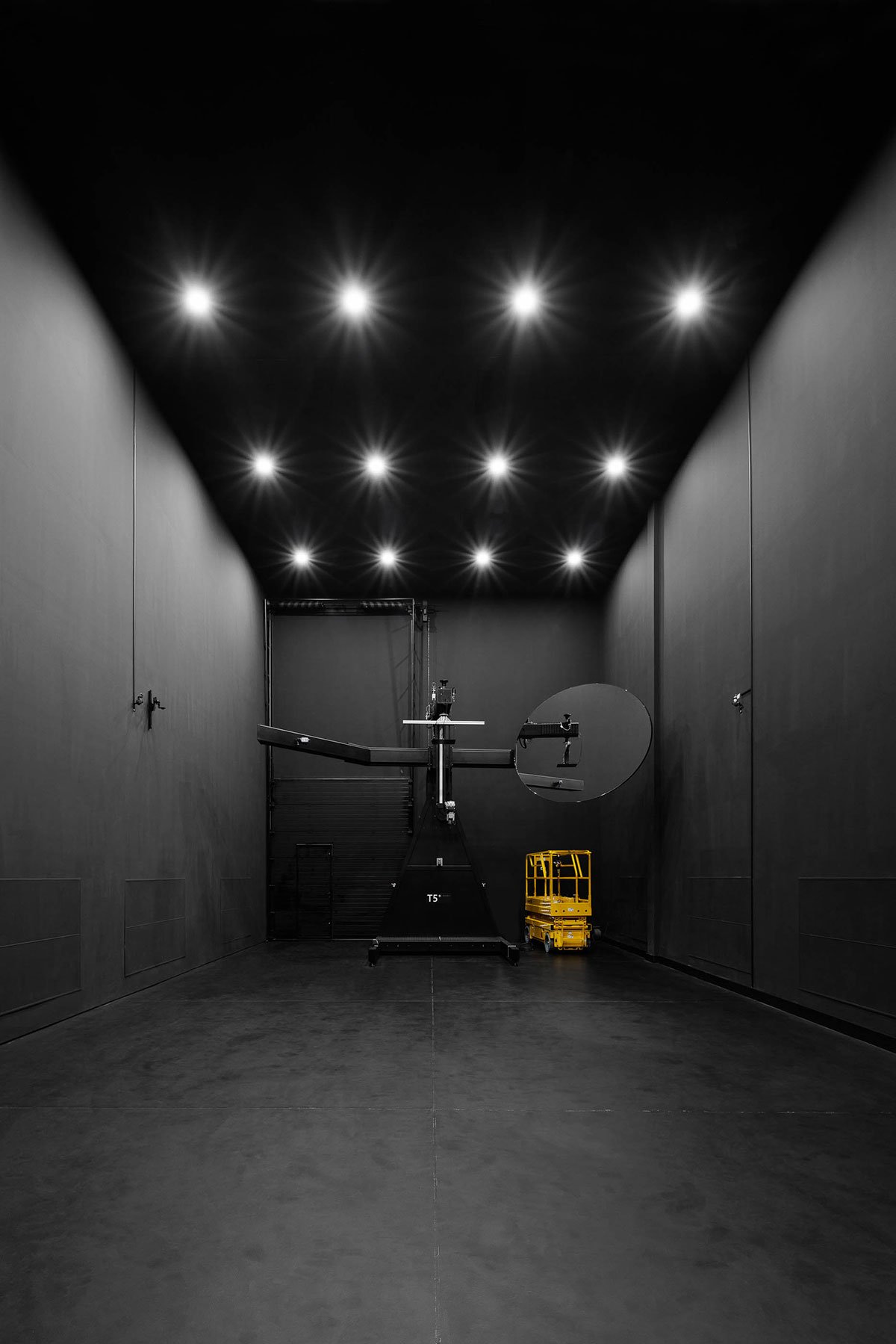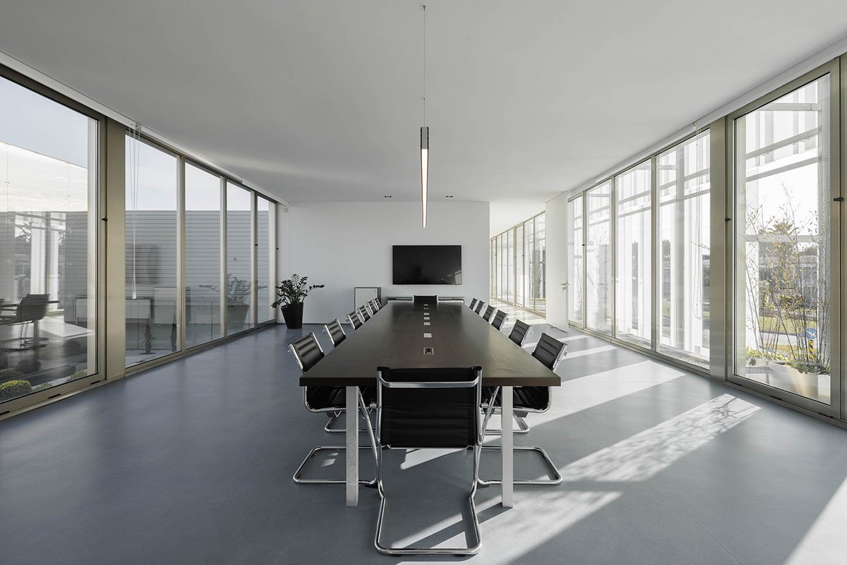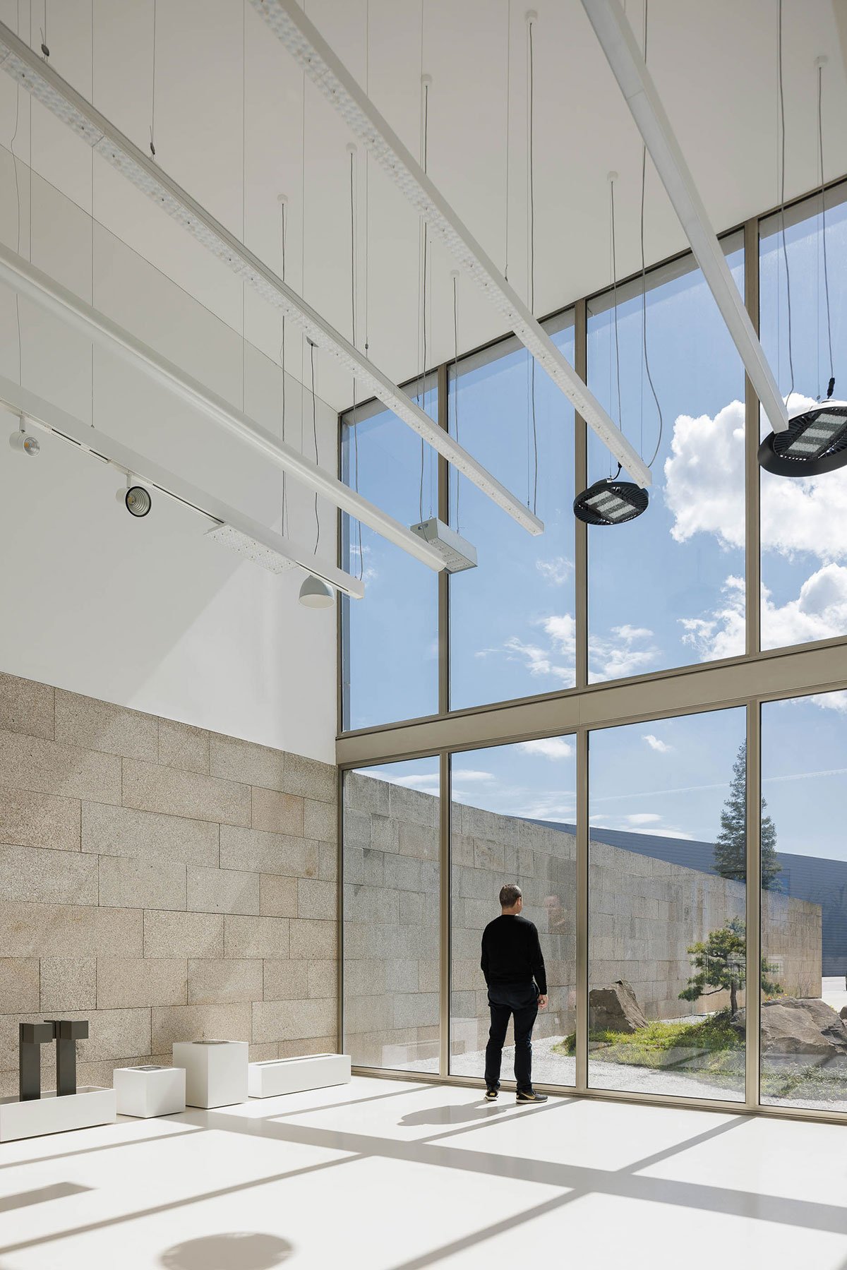 The showroom and cafeteria open and extend into a landscaped courtyard, a space that is reflected in the dark mirrored glass facades of the lighting laboratory building, providing images and environments depending on the variation in sunlight.