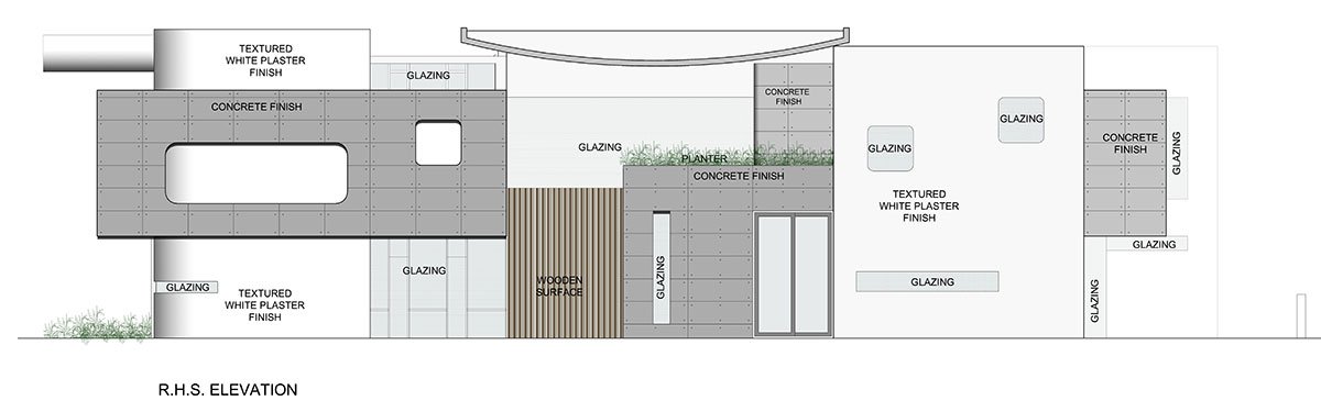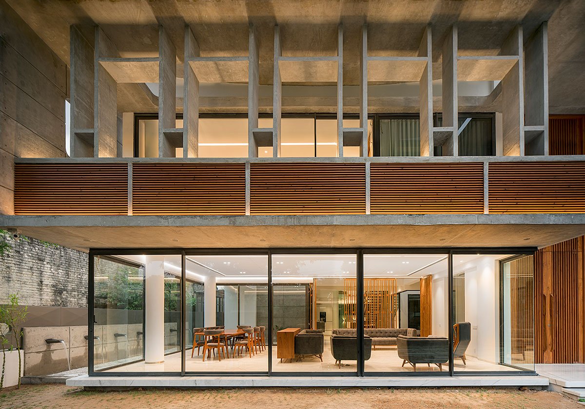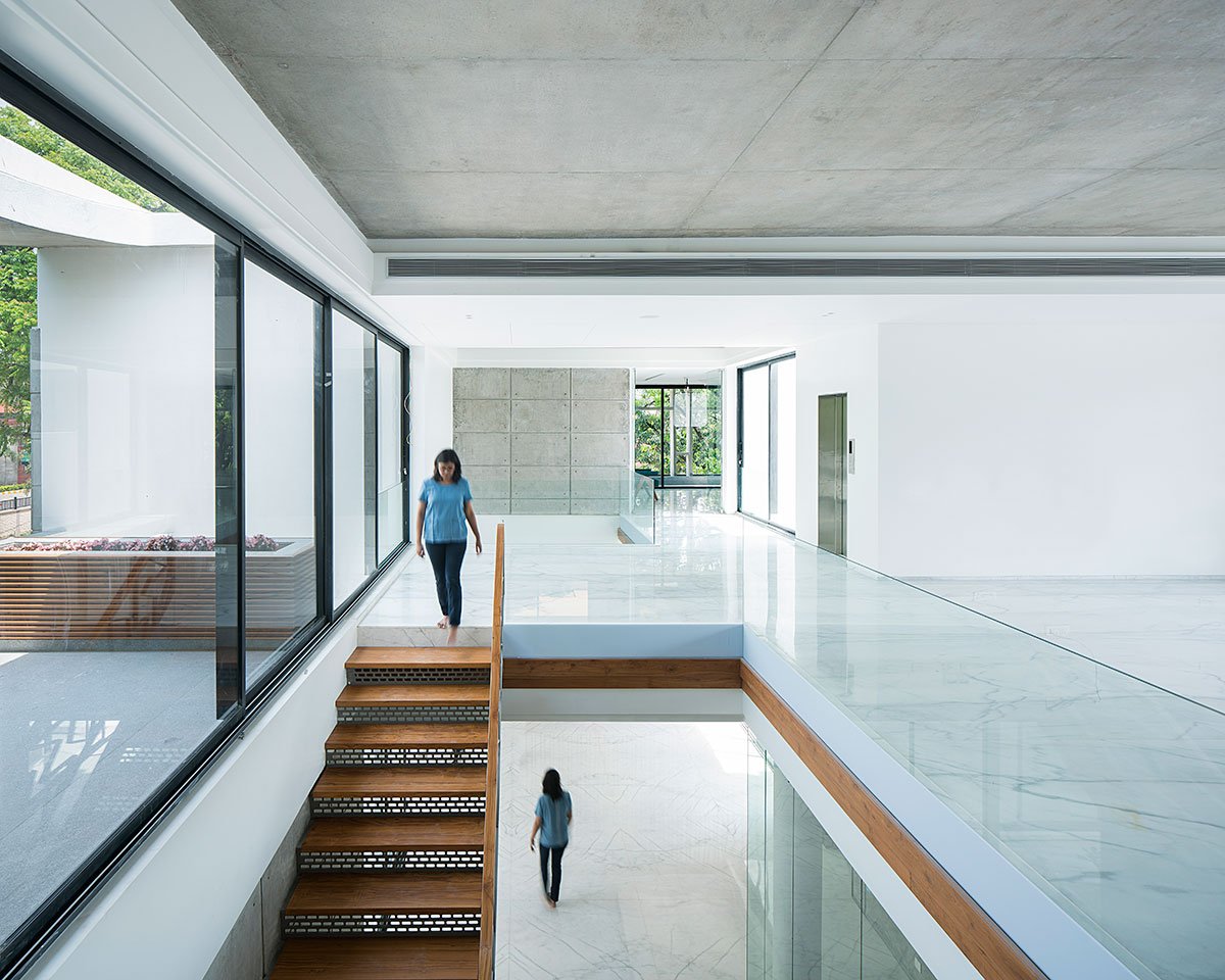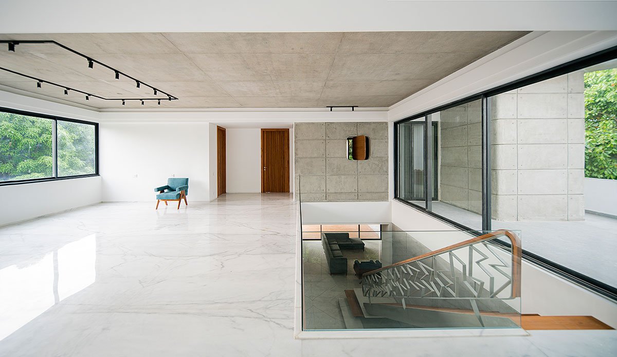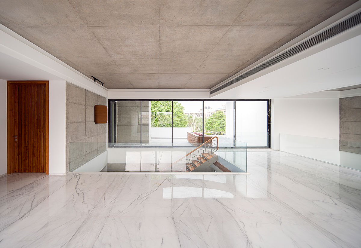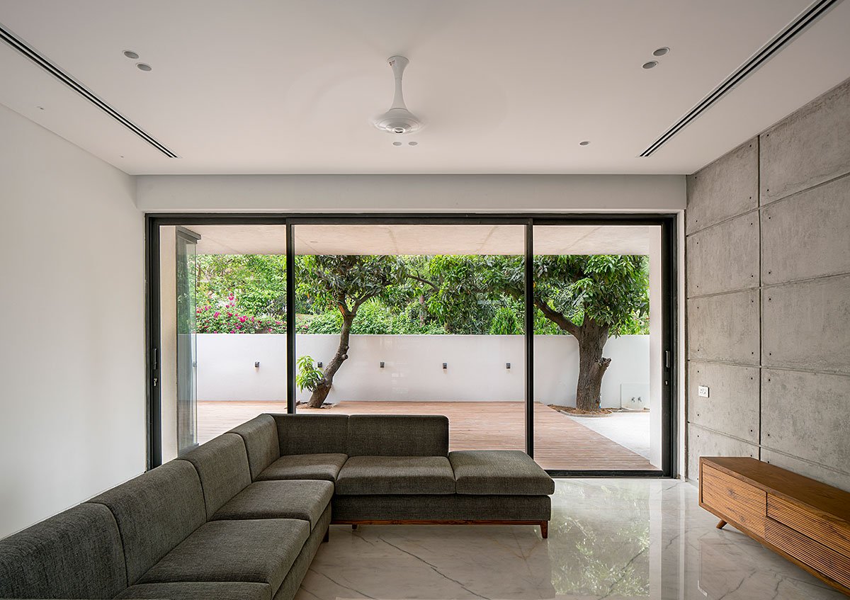The house greets visitors with its sweeping, curved concrete roof—a reinterpretation of Le Corbusier’s 1952 proposal for the Governor’s Palace. At a more eye-friendly elevation, a glass-encased, open ground-floor plan comes into view. This open plan creates an overlap between several interconnected volumes and outdoor spaces that allow for easy interaction between separate floors, complying with the highly cohesive lifestyles prevalent in multi-generational Indian families.
