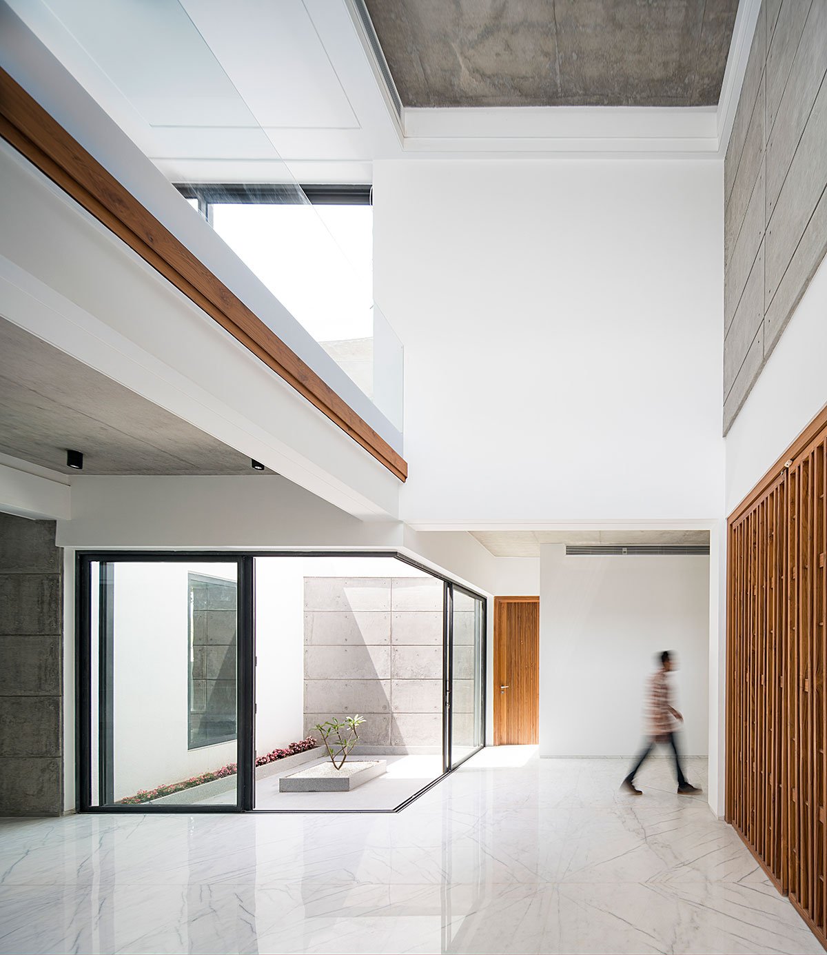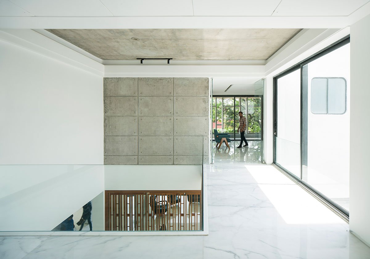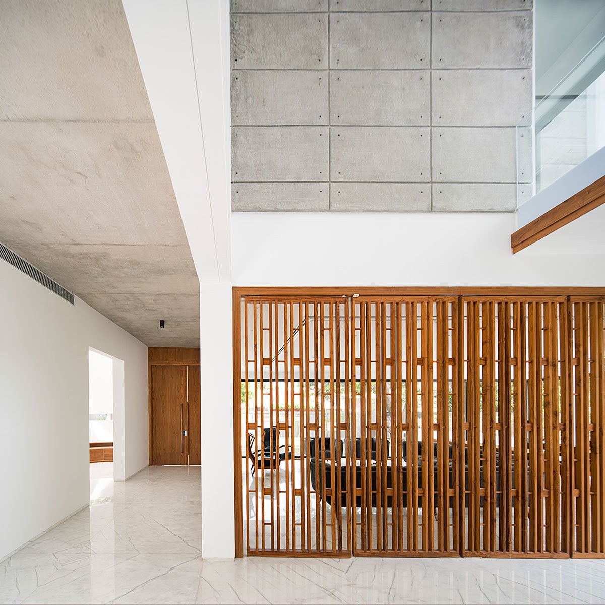 Nature becomes a part of the interior spaces through multiple courtyards and terrace gardens—interpreting traditional transitional spaces like verandahs into a modern context as a byproduct of the design process. As opposed to the common areas, the private rooms in the home are treated to interact differently with the outdoors. They open onto courtyards and deep verandahs with tall sun breakers that form the front facade, granting access to the outdoors while preserving privacy. Three other bedrooms—two for the children and one for guests—are situated on the upper floor.