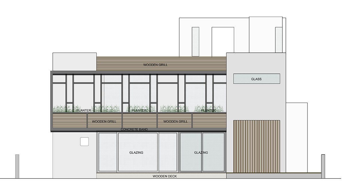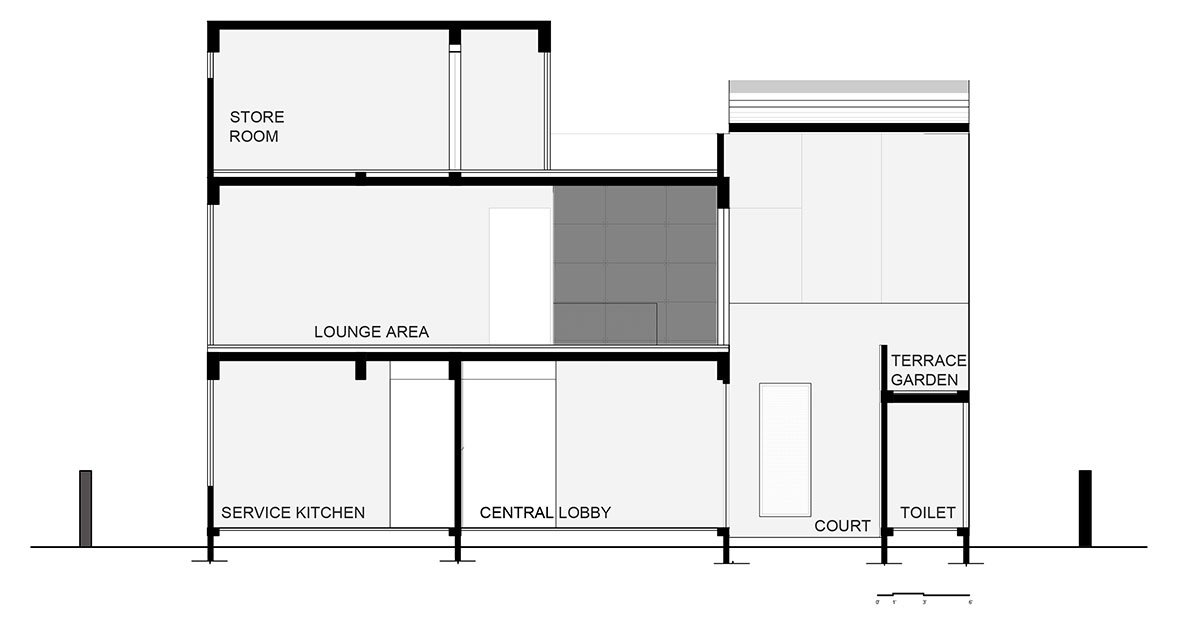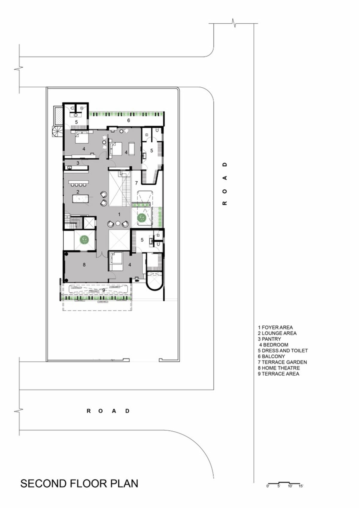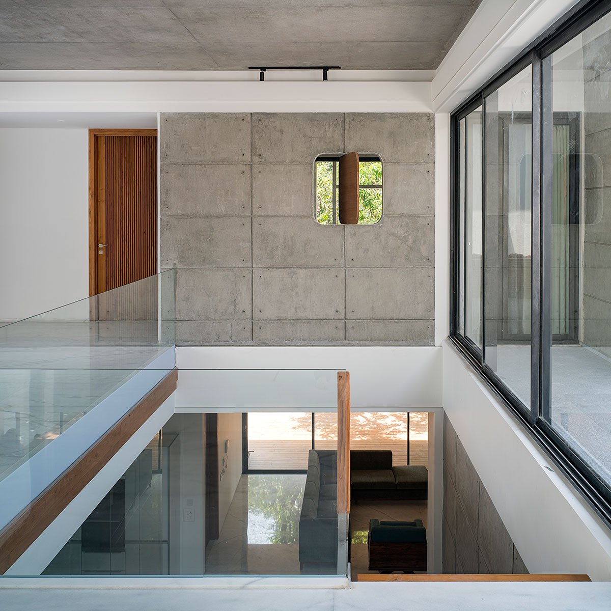Nature becomes a part of the interior spaces through multiple courtyards and terrace gardens—interpreting traditional transitional spaces like verandahs into a modern context as a byproduct of the design process. As opposed to the common areas, the private rooms in the home are treated to interact differently with the outdoors. They open onto courtyards and deep verandahs with tall sun breakers that form the front facade, granting access to the outdoors while preserving privacy. Three other bedrooms—two for the children and one for guests—are situated on the upper floor.