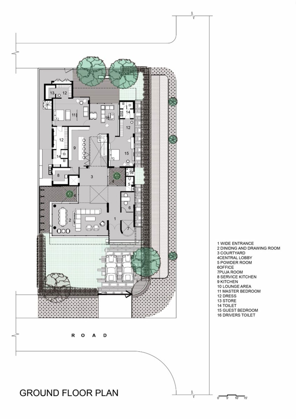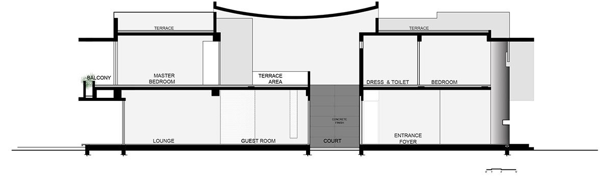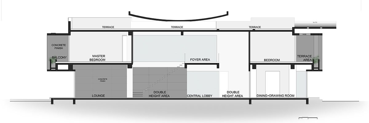 Excerpt: Residence 1065, designed by Charged Voids, greets visitors with its sweeping, curved concrete roof—a reinterpretation of Architect Le Corbusier’s 1952 proposal for the Governor’s Palace. The design for the home is driven by intersecting axes; the major axis is planned as an anchor for the central circulation while the minor axis connects the landscaped courtyards. Using an open plan and facades that appear to float, the home is designed for a multi-generational family and attempts to fuse traditional spatial planning with modern aesthetics.
