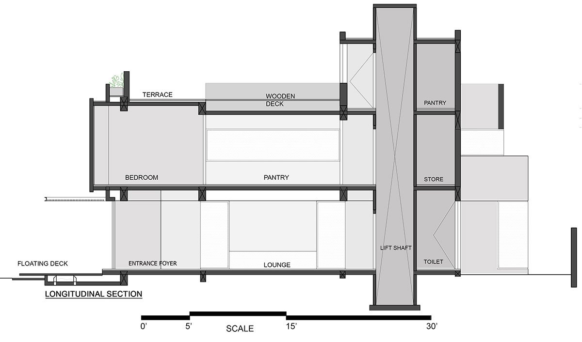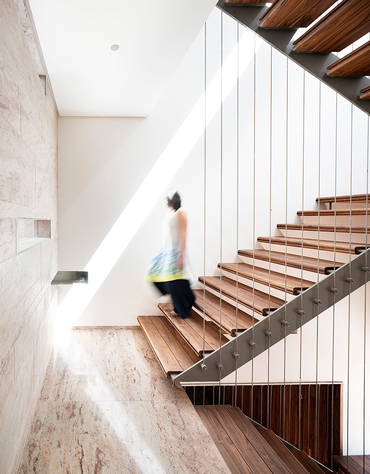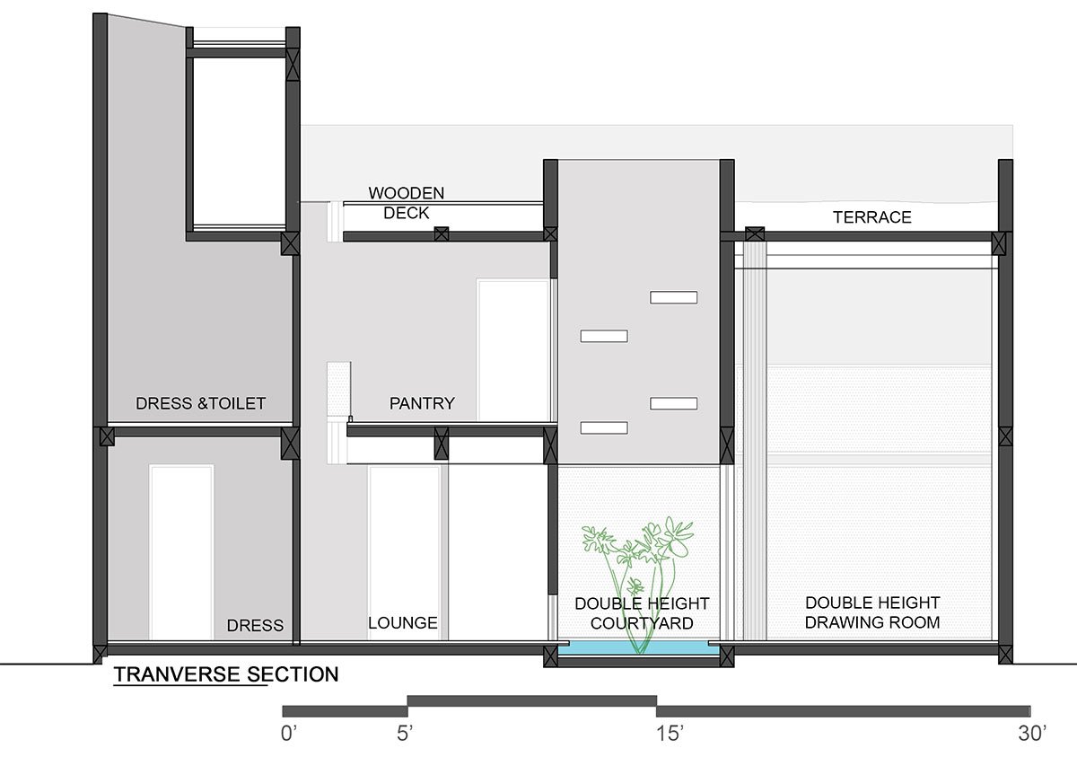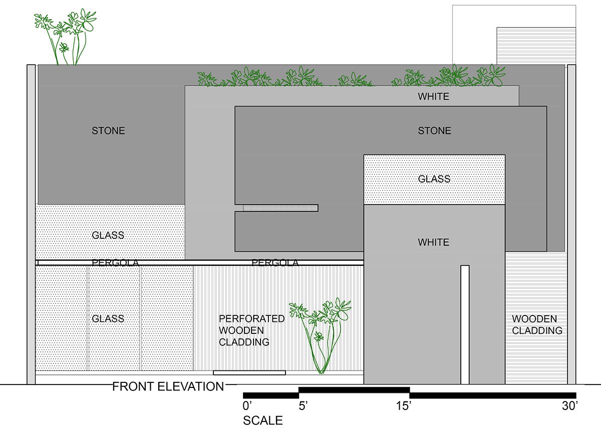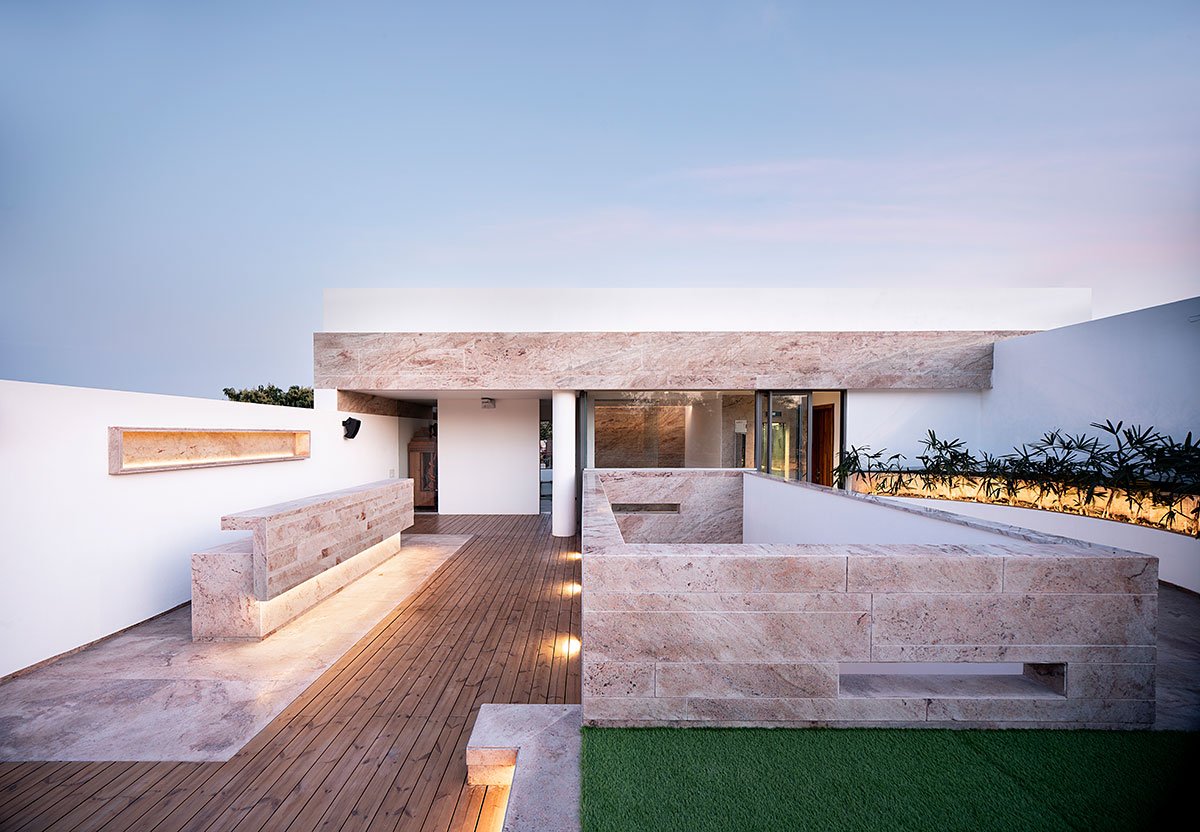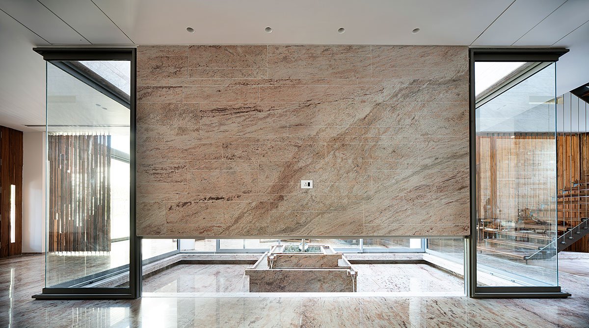 While the front of the house comprises monolithic walls in alternating neutral stone and plain white finish, the house itself is segregated into distinct public and private zones. A central open space, featuring a courtyard and vertical circulation, serves as the connection between the first two zones and facilitates natural ventilation throughout the house. Punctures in the built form derive from the locally prevailing wind flow pattern, and a sequential progression has been built between the different zones, with multiple solids and voids creating segmented layers of privacy and openness.
