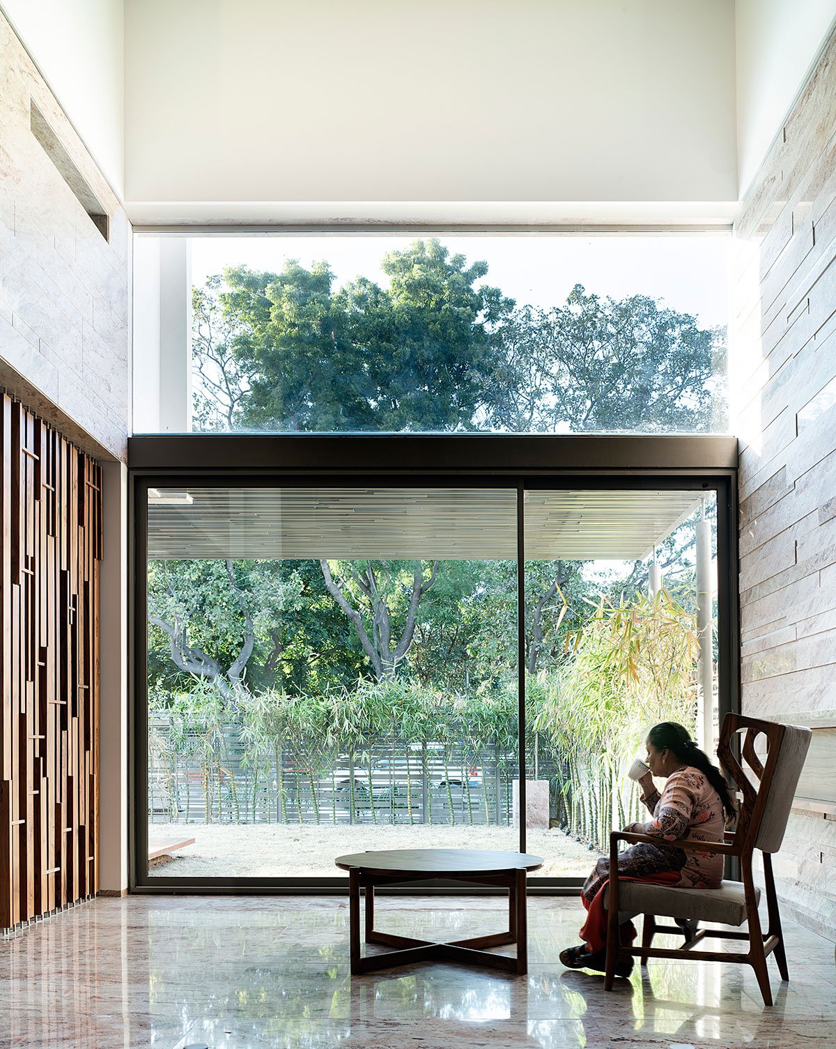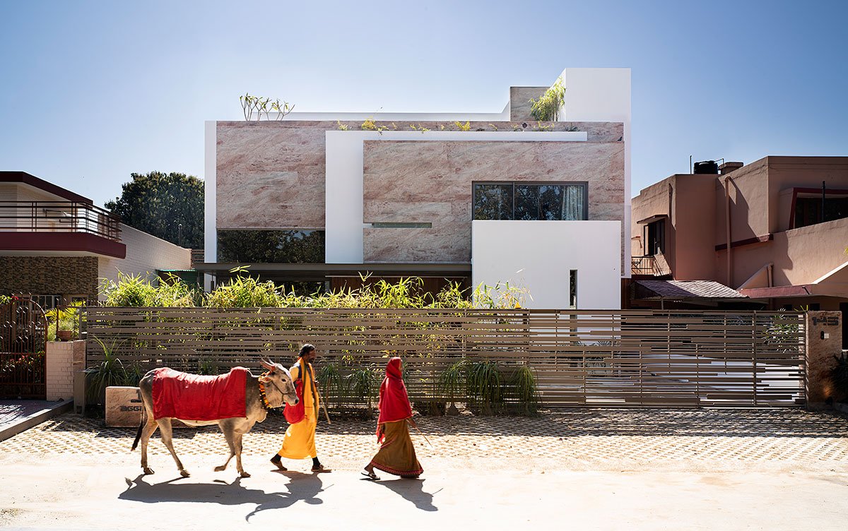 [Text as submitted by architect] Sited on a plot with challenging zoning and height restrictions in southern Chandigarh, Residence 145 is a play on the fundamentals of urban residential design. Conceptualised by Charged Voids for three generations of a family, the layout of the house is centred on the idea of connected living. A strong connection with the outdoors is established through internal courtyards, with the interior spaces framing sunny views of the landscape.
