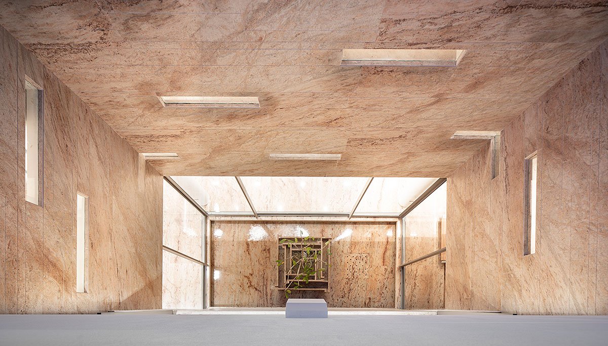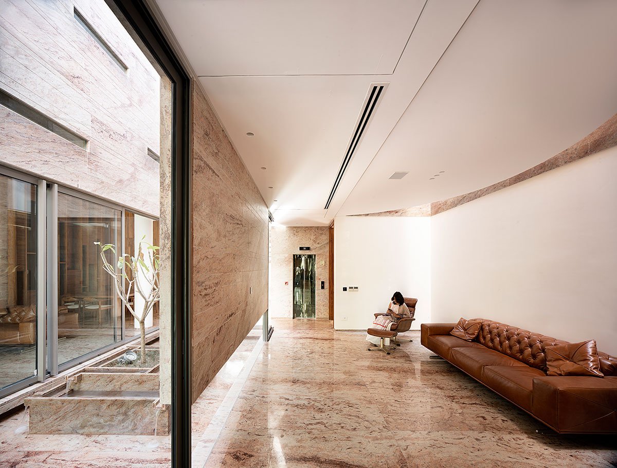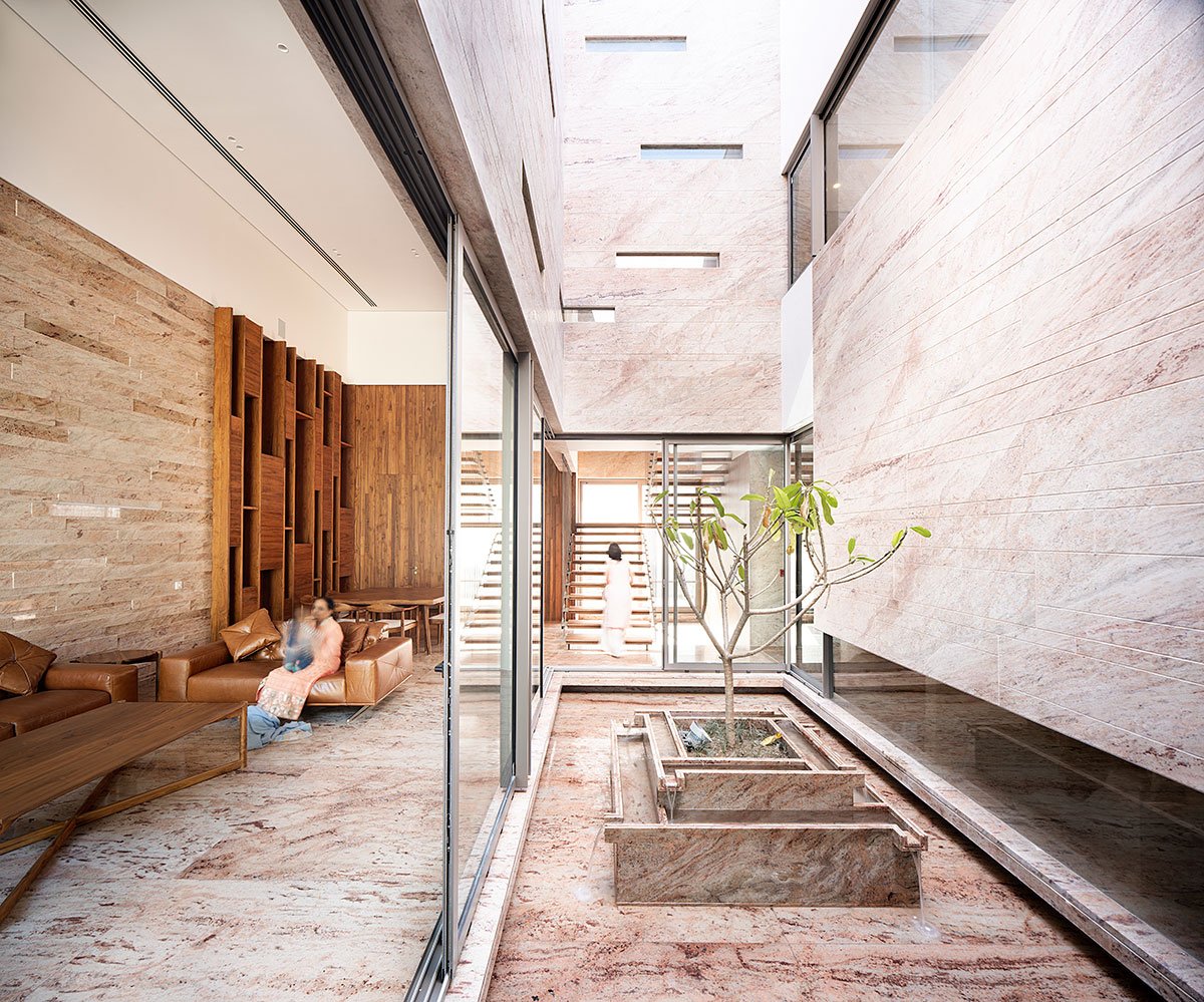 The ground floor consists of an open-plan, double-height living-cum-dining hall wrapped around the central courtyard, along with two bedrooms for the elderly members of the family. Two other bedrooms and an open kitchen overlooking the courtyard are organised on the second storey, which is accessed by a floating staircase. Along one edge of the kitchen is a curved wall with an opening the length of the wall, creating a slim lightwell that admits daylight from a puncture in the roof above. On the third level, an open bar and terrace provide a space for gatherings, along with other amenities and accommodation for the domestic help. The material palette is reserved to the bare minimum, with the same stone that is used for exterior finishes extending to the interior walls and flooring. The beige and white tones are accompanied by the warm colours of the millwork and furniture.