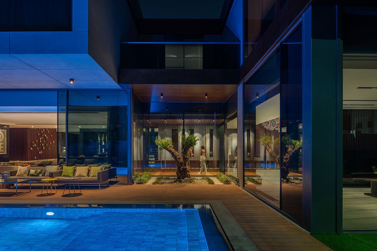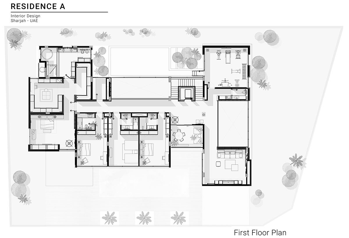 The villa spreads over three stories, offering different experiences with its surrounding environment. The ground floor expands to the outdoor pool and garden. It also hugs green lushes and trees adopting them as part of the house. One large marble slab covers the floor with levitated burn walnut elements dividing the different spaces. Furniture items are delicately placed benefiting from natural views and proper daylight.