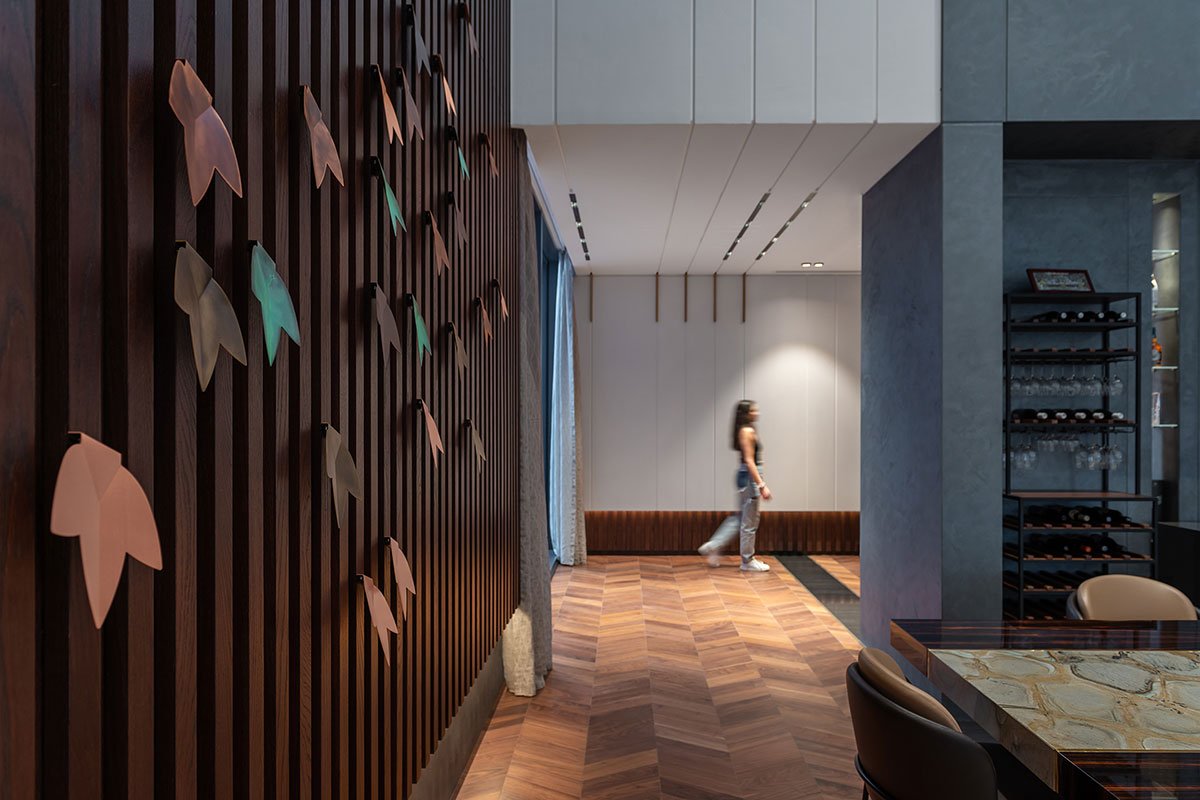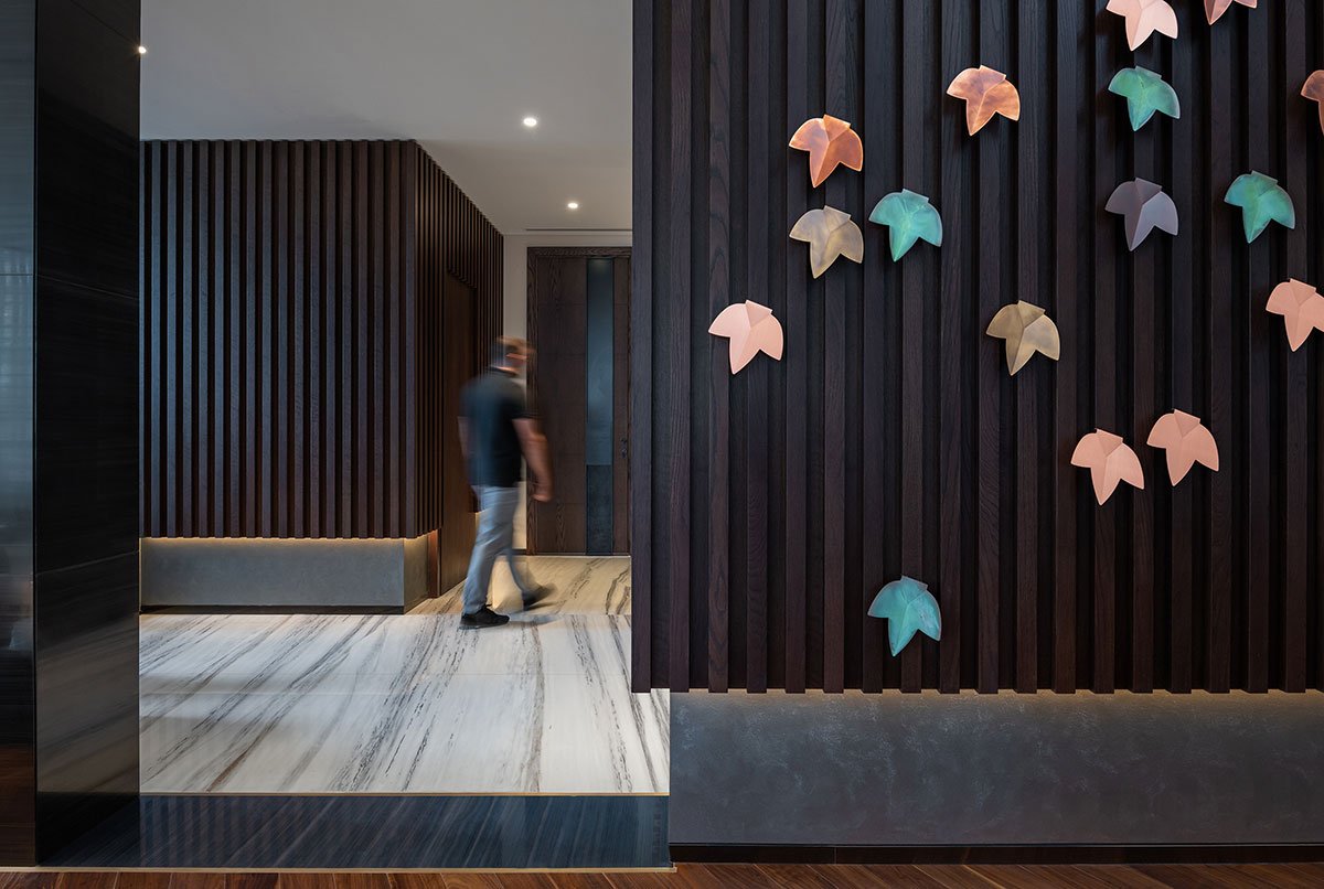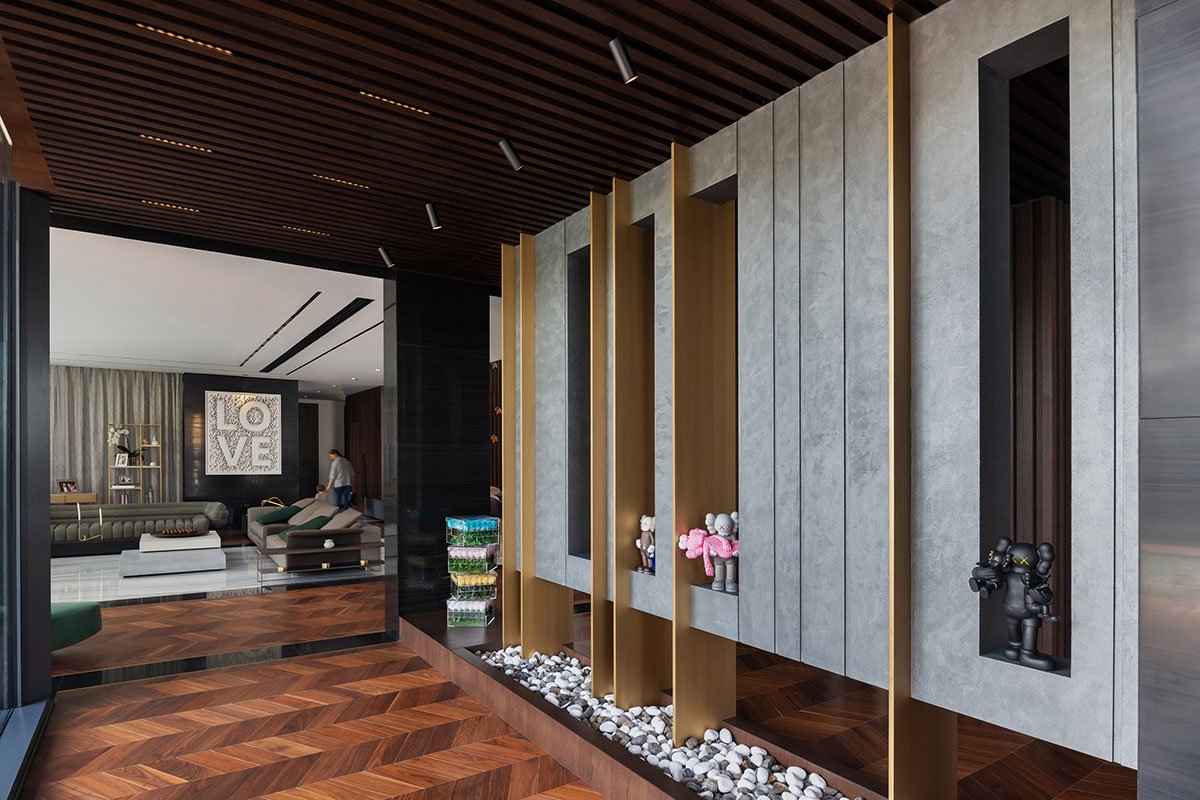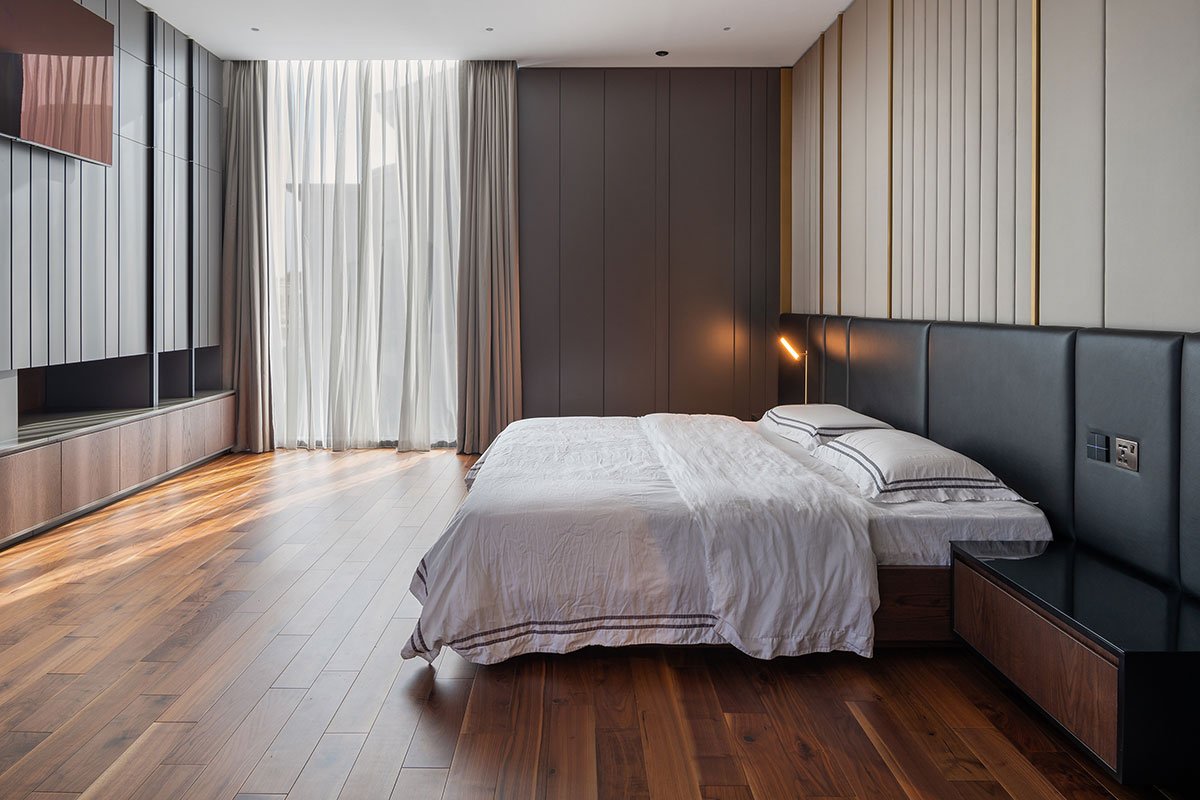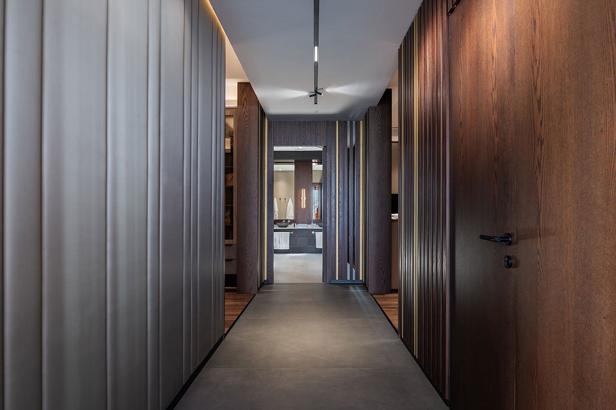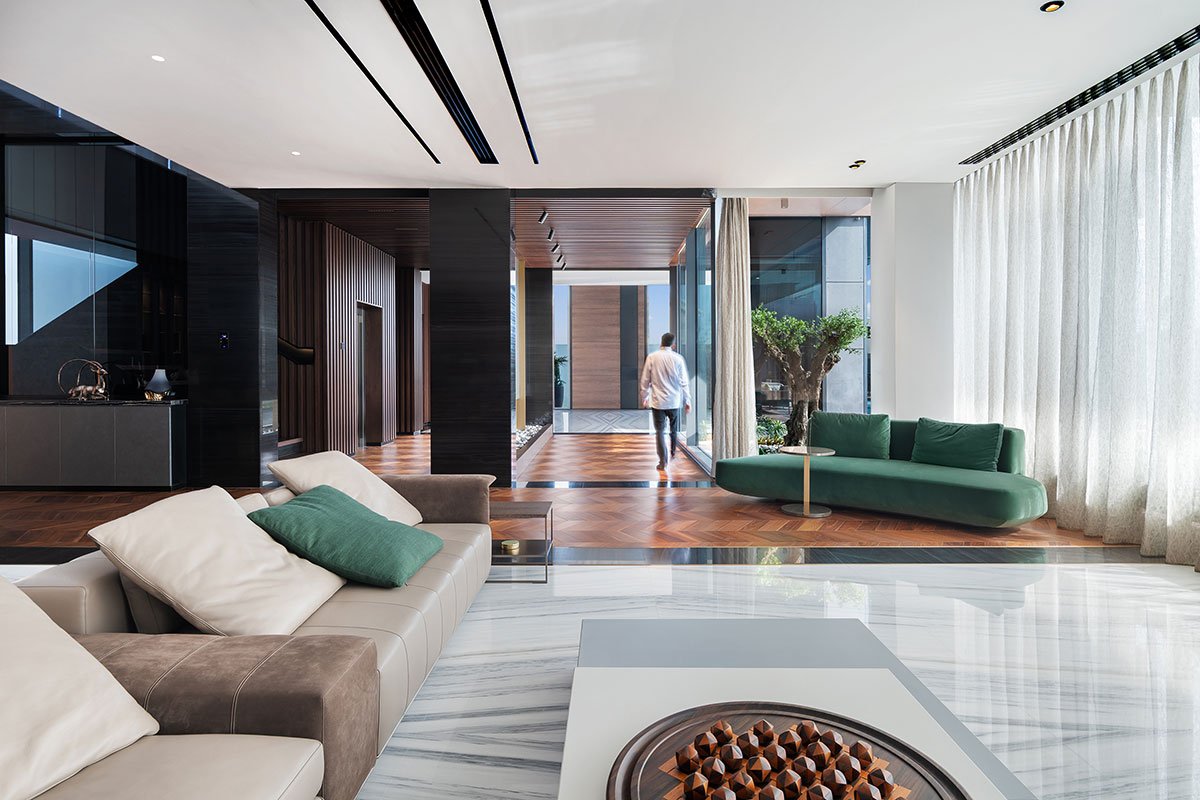 Excerpt: Residence A designed by IAIA – Idea Art Interior Architects spreads over three stories, offering different experiences with its surrounding environment. The ground floor expands to the outdoor pool and garden. It also hugs green lushes and trees adopting them as part of the house. One large marble slab covers the floor with levitated burn walnut elements dividing the different spaces.