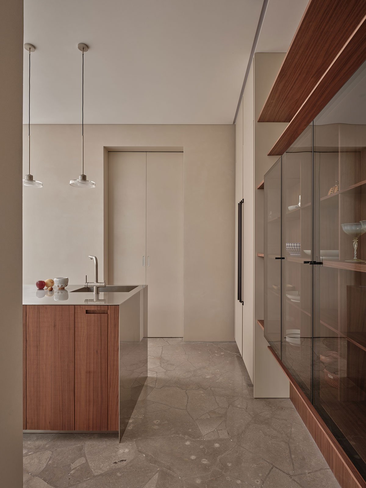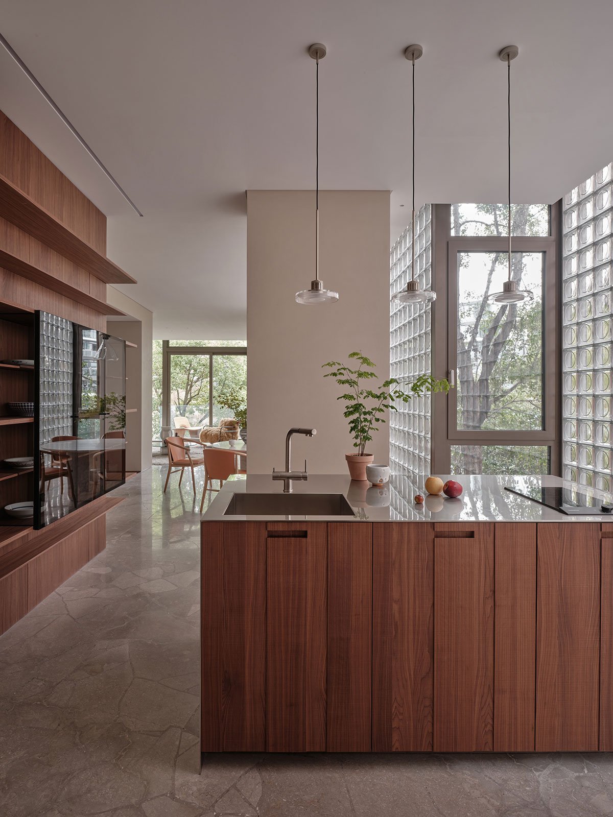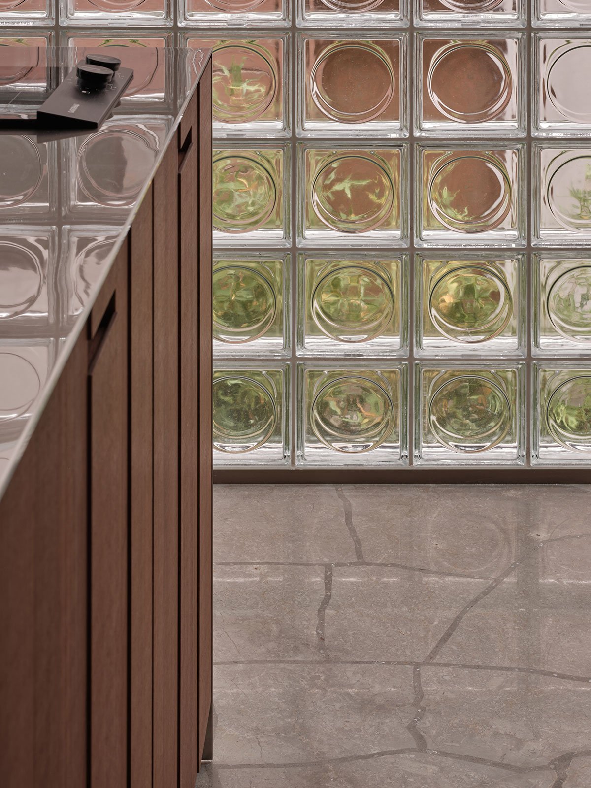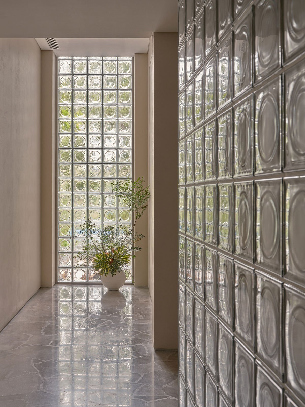 In terms of materials and craftsmanship, the architect crushed beige fine-grain veined marble as aggregate, mixing it with pebbles and pearl shells, and used a monolithic terrazzo casting process to create a textured floor with a unique visual quality. The facades feature frosted glass bricks, natural black walnut wood, and cement. Light and materials are interwoven, creating a calming, soft, and serene atmosphere.