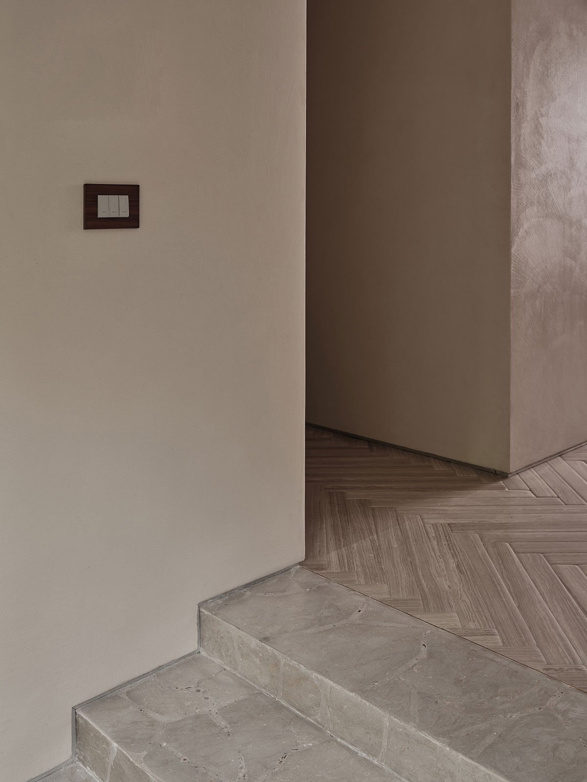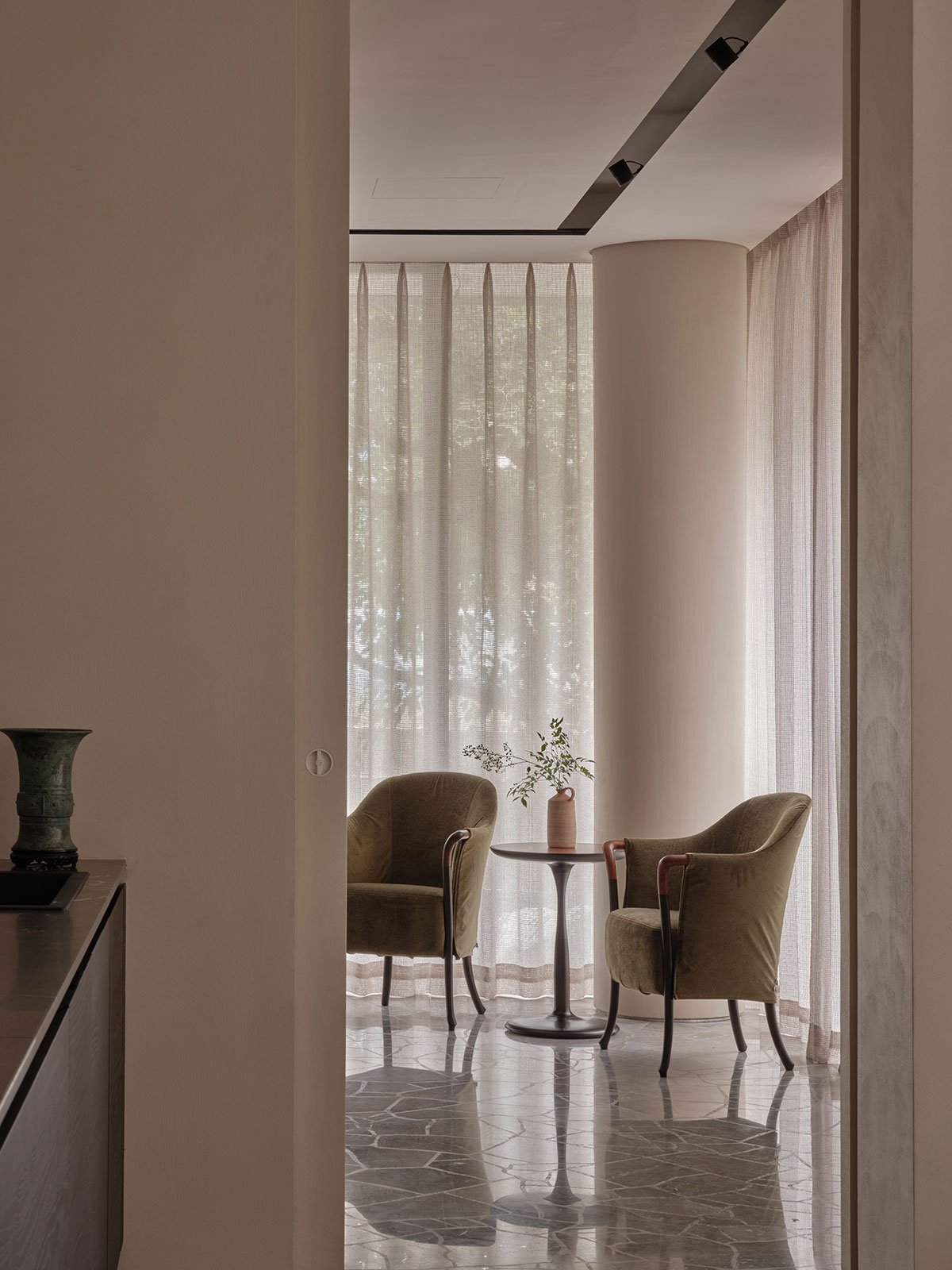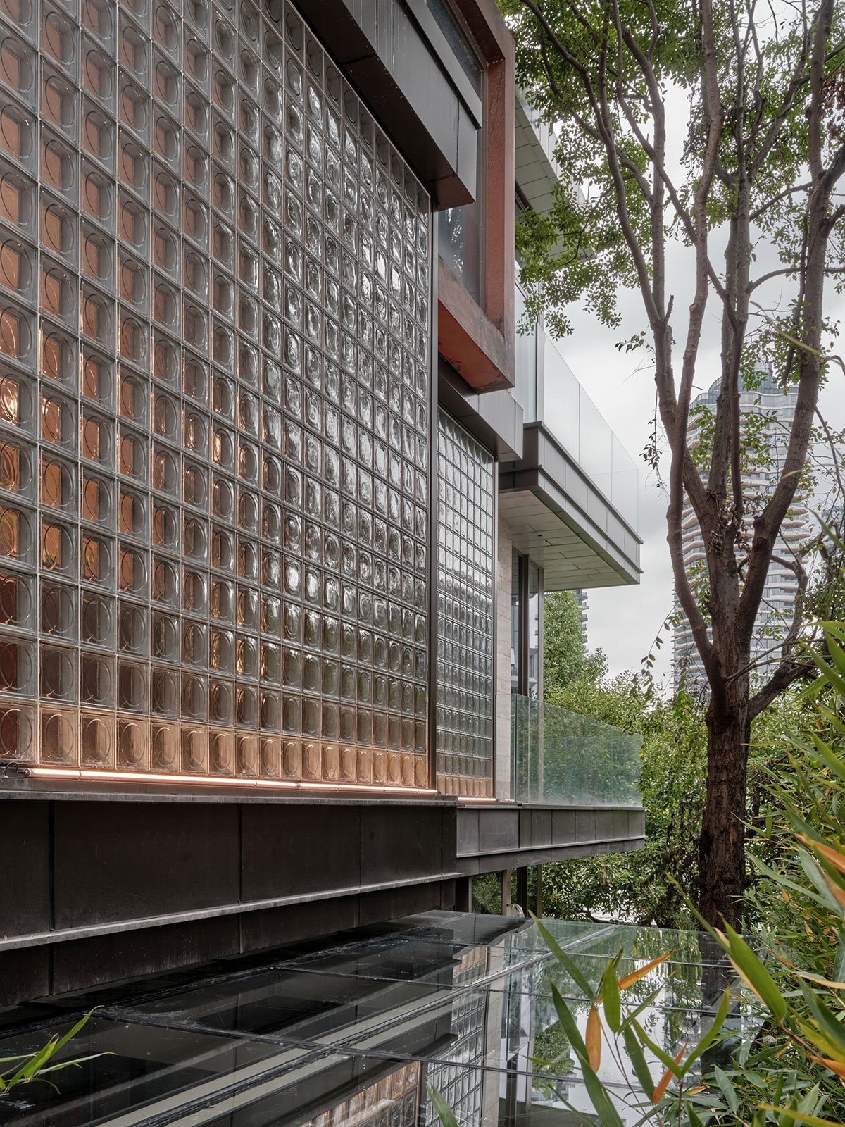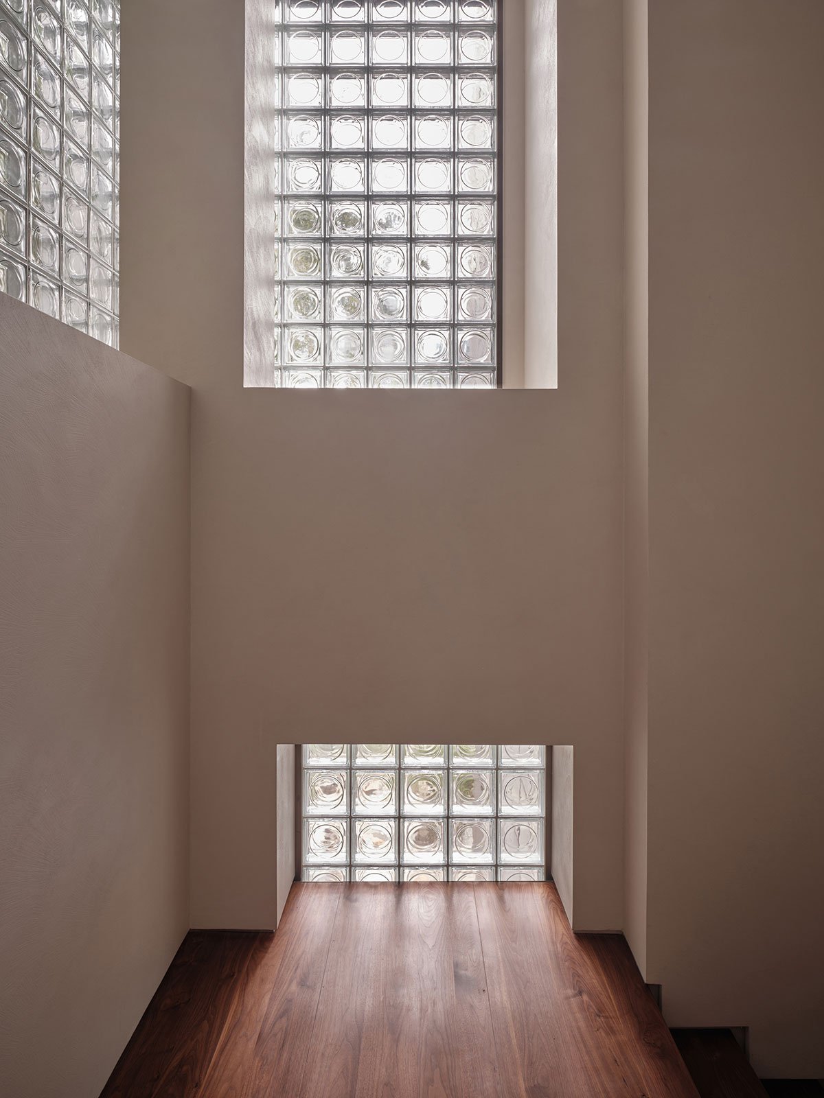 In terms of materials and craftsmanship, the architect crushed beige fine-grain veined marble as aggregate, mixing it with pebbles and pearl shells, and used a monolithic terrazzo casting process to create a textured floor with a unique visual quality. The facades feature frosted glass bricks, natural black walnut wood, and cement. Light and materials are interwoven, creating a calming, soft, and serene atmosphere.