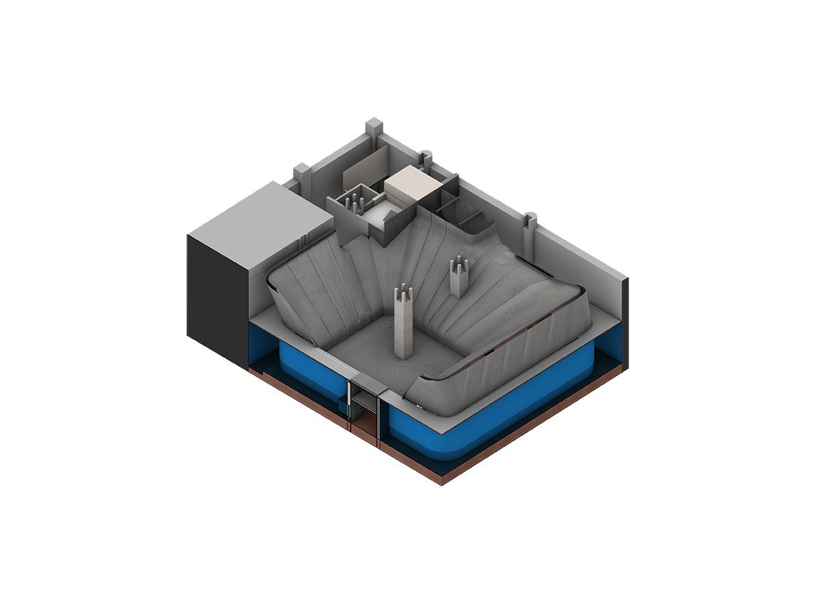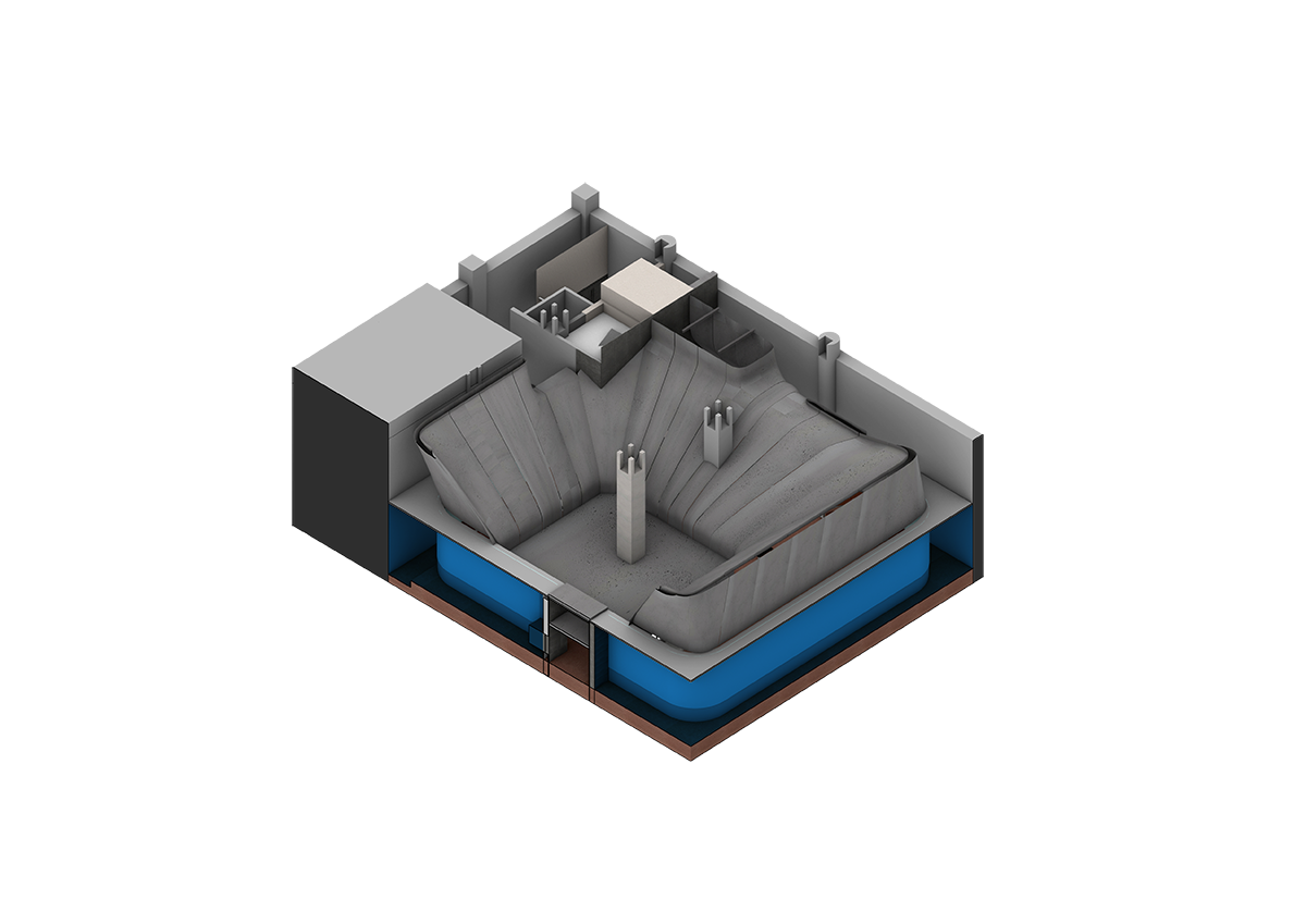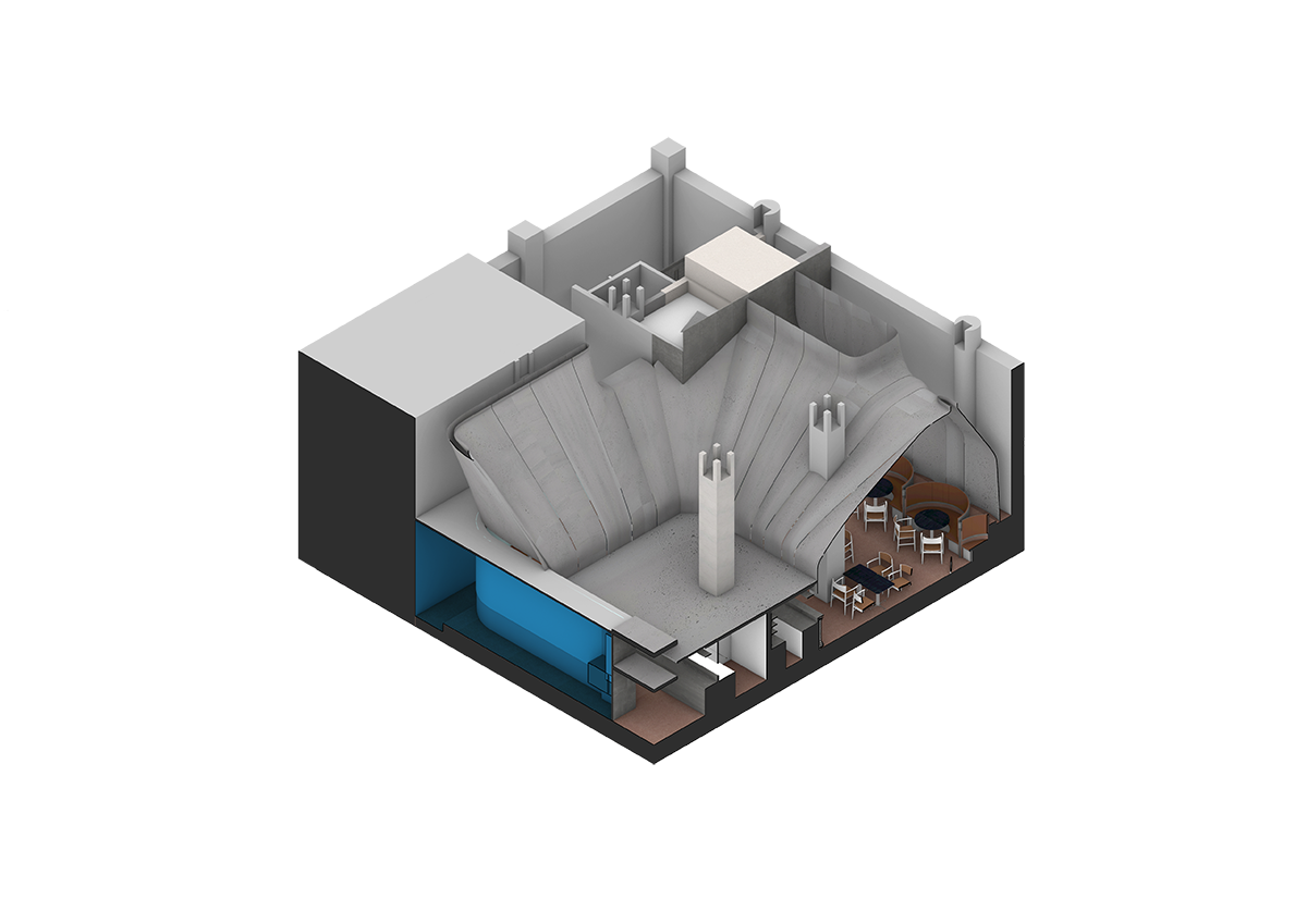The bar counter is the centre of this rectangular space. Apart from the water tanks, it’s the only primary light source in the space. Filled with dim and warm light, it’s hoped to be the guests’ company for resisting the feeling of loneliness in the “deep sea”. The top of the bar counter extends upwards and connects to the ceiling and interior facades, forming a curved structure. The structure creates a primitive cave-like space, where only a part of the “cave wall” is exposed. The inside area where light doesn’t reach is almost in empty darkness.