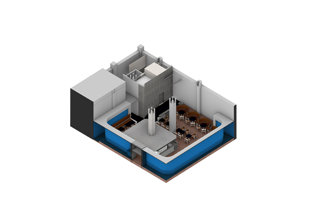 The restaurant is located on the first underground floor in a shopping mall, and it has an independent entrance. The space was formerly an aquarium. The original cast walls, structural beams, and columns formed an ample, dark underground hollow space.