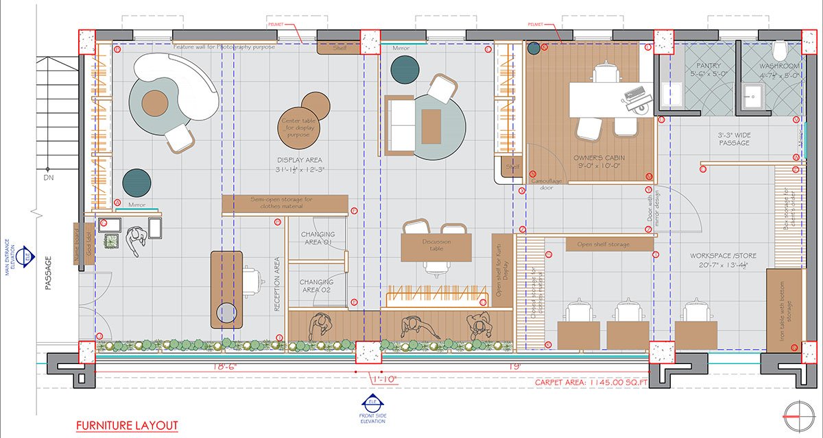 Introduction of focal points such as a centrally located display area or a statement lighting fixture draws attention and creates visual interest. The reception area is positioned near the entrance, adjacent to the display area, to greet customers and provide assistance as needed. The display area is strategically positioned near the entrance & reception area to immediately captivate customers’ attention upon arrival.