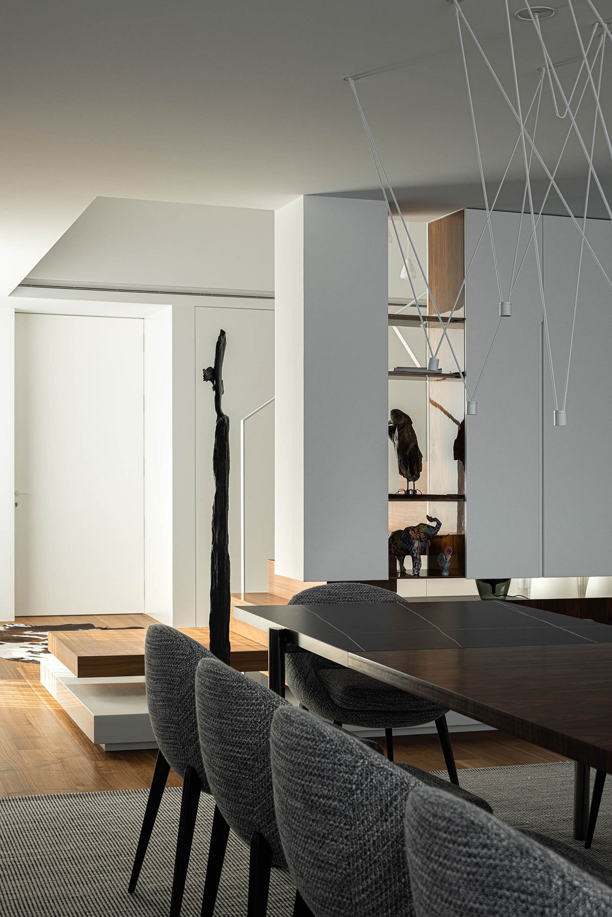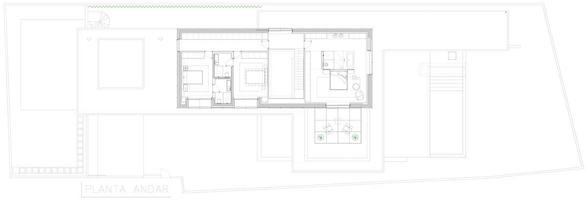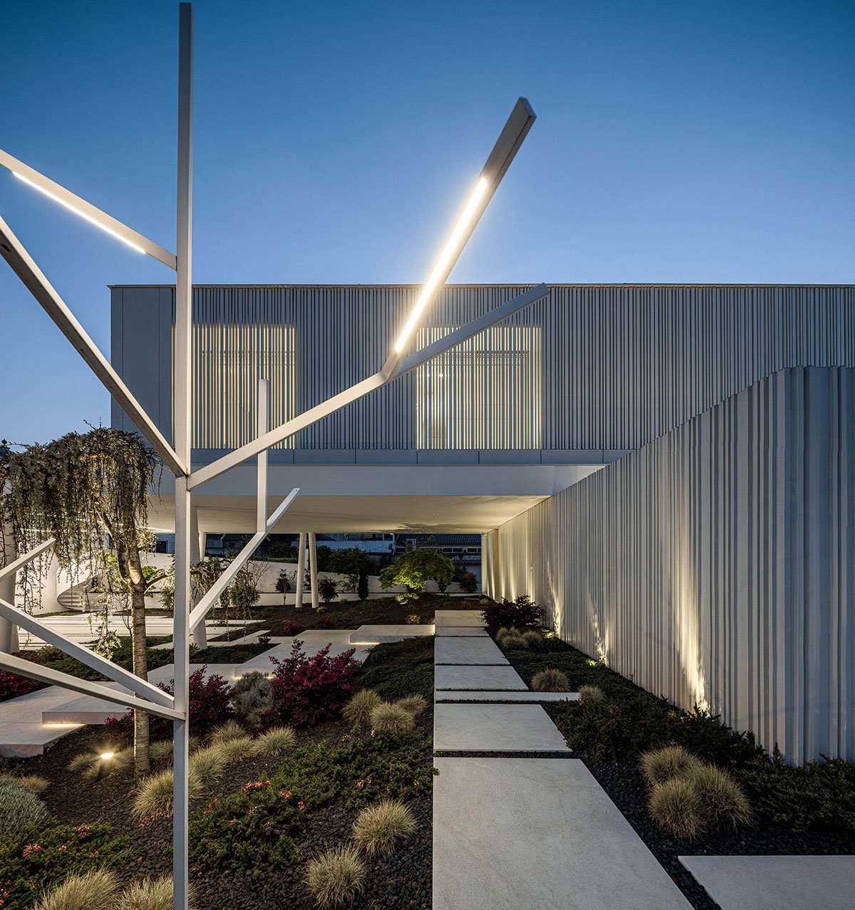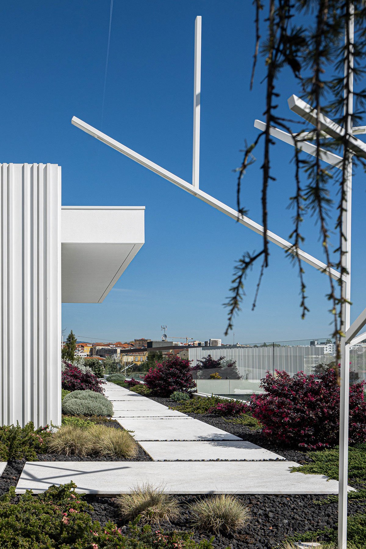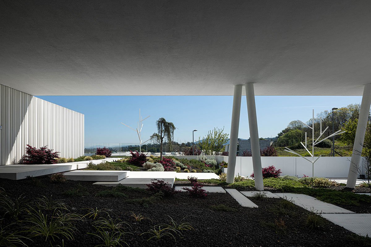 RiscoWhite appears as a striped white concrete block, torn silently, that extends along the lowest platform, where the volumes gravitate in the serenity of the place, in a game of two heights that enjoys its immense landscape.