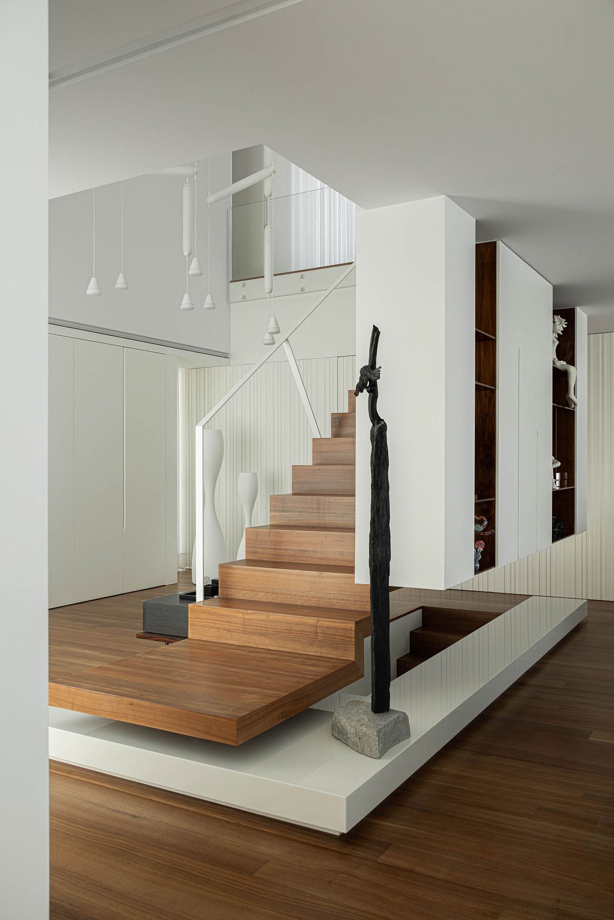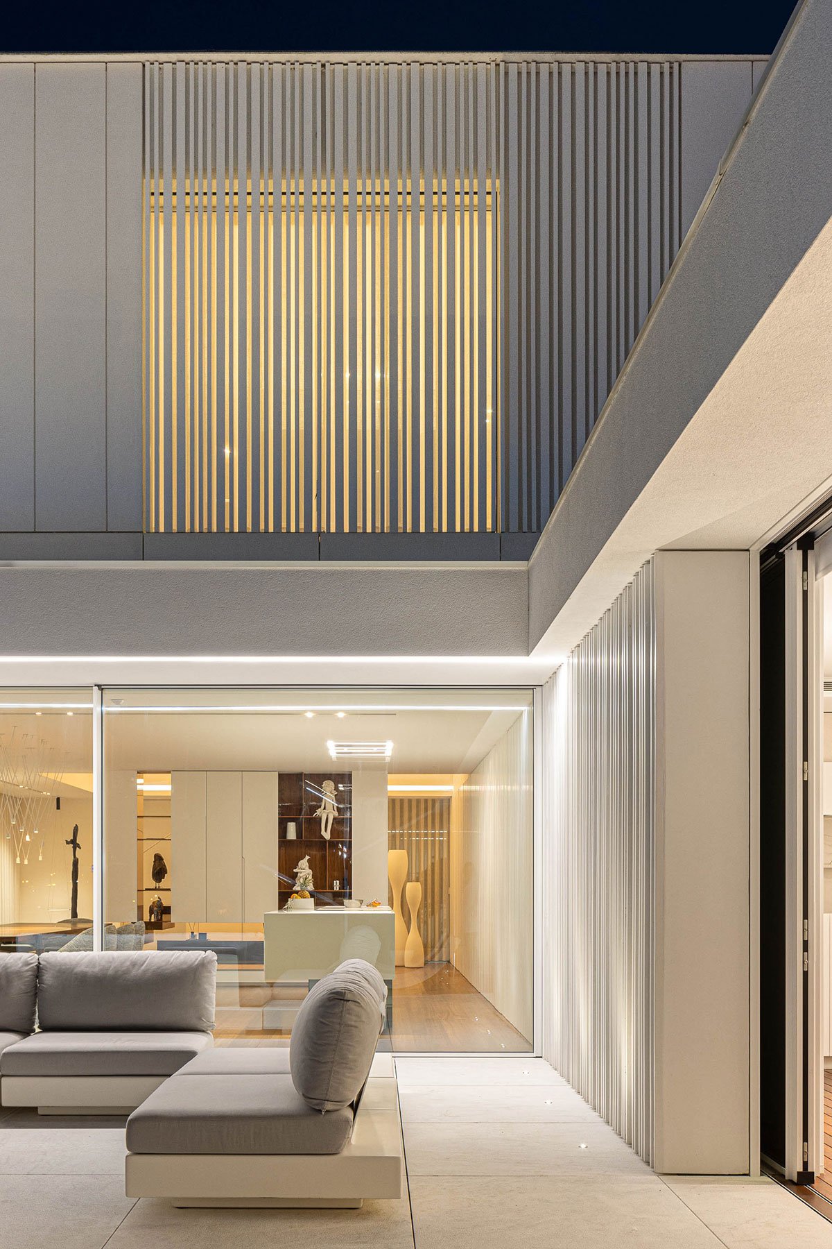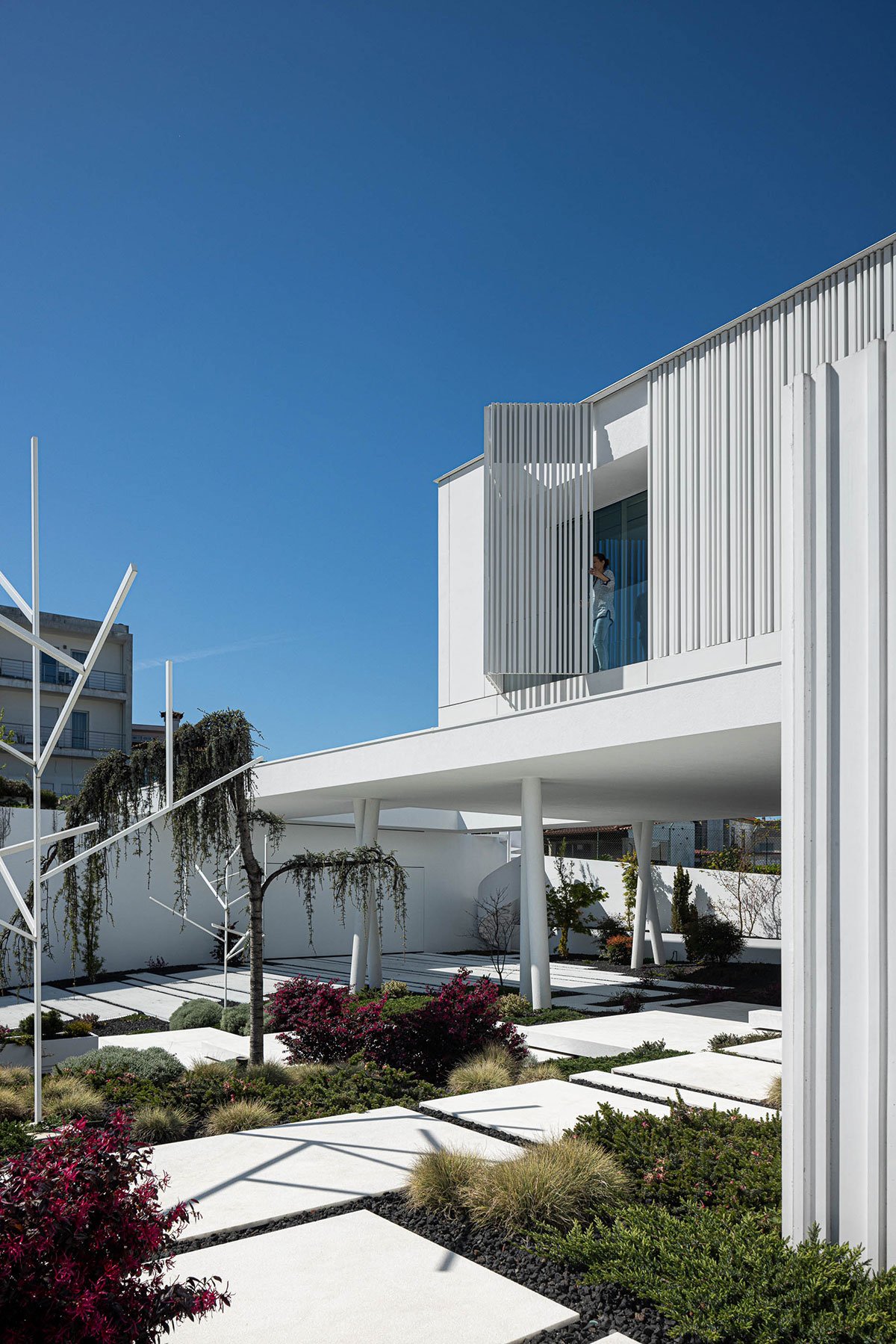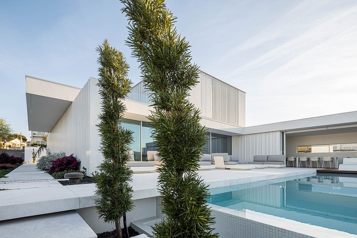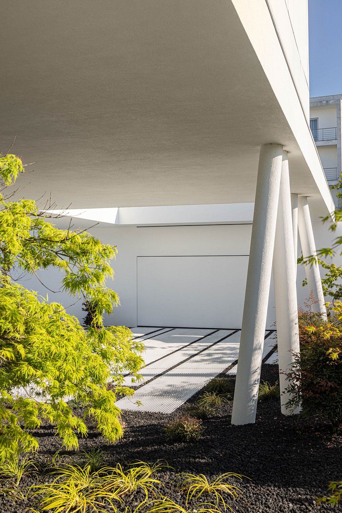 Excerpt: The residence Riscowhite, designed by Risco Singular – Arquitectura, Lda, resembles a striped white concrete block that is elevated on two levels to capture the beauty of the surroundings. An attempt to convey the existing language—a small housing unit—was designed as part of transmitting the site’s natural condition, the architecture, and acknowledging the site and its historical legacy.