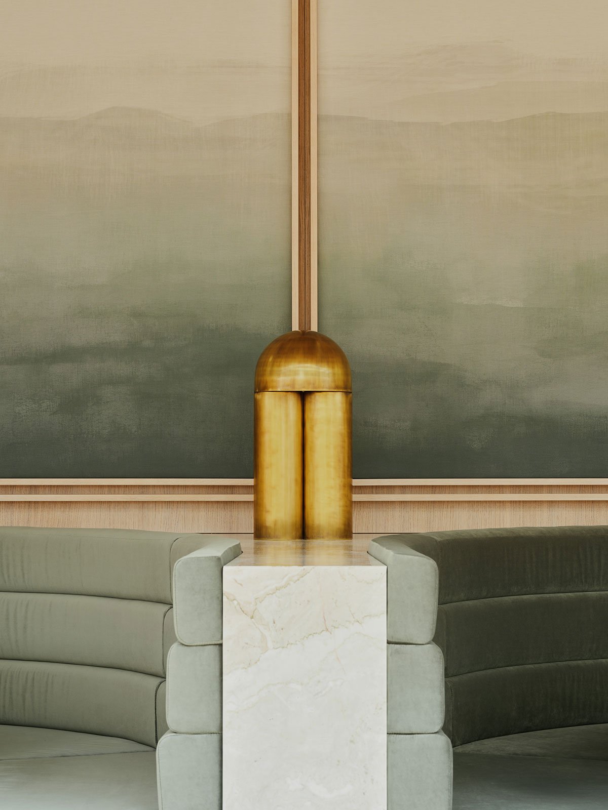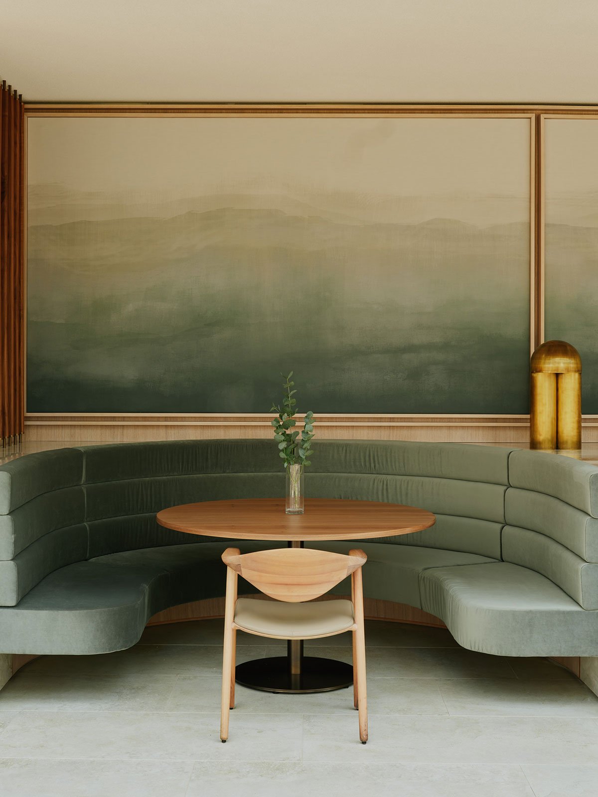 HENN used artisanal touches and hand detailing to create a sense of haptic-luxury. The walls are clad in gray travertine; in the entryway, Bocci Series 73 pendant lights, made of irregularly dimpled glass, create subtle asymmetry and plays of shadow; the entryway and lounge carpets were hand-knotted to HENN’s specifications by Reuber & Henning, a Berlin-based design firm; warm wood panels and hand-troweled plaster work add warmth and tactility; the curving, 16m Walter Knoll rug was hand-knotted from silk, wool and nettle; Paul Matter Monolith Table lamps add a subtle gleam of brass; and the acoustic wall panels are wrapped in a custom-printed textile, made from original watercolor paintings by HENN.