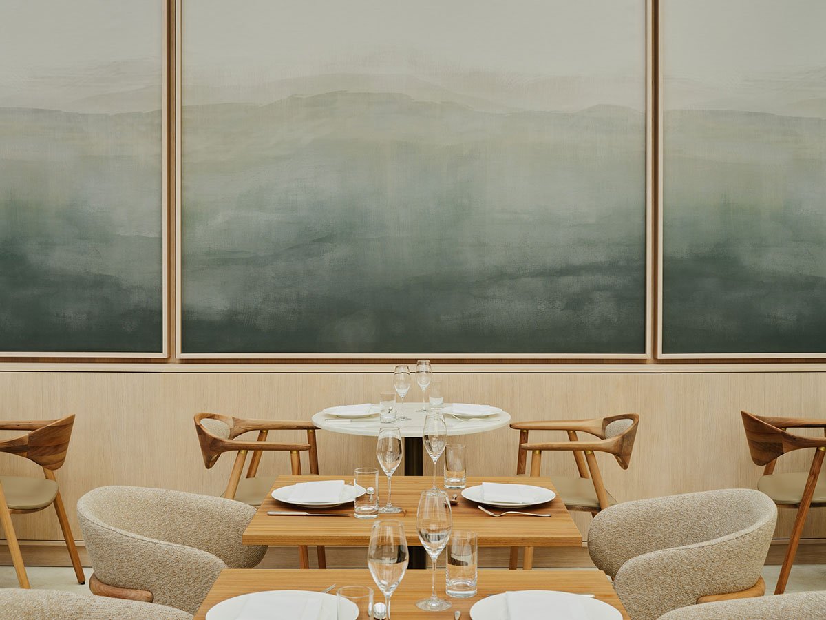 Excerpt: Ritz-Carlton AURA Restaurant, an interior design project by HENN, features a blend of light colors and natural materials, creating a warm ambience. Within the arcing steel and glass space, HENN designed a flexible layout with three distinct spatial zones, each evoking a transition from sandy dunes to pebbled shoreline. Each band of space uses a nuanced material palette and offers a unique dining experience.