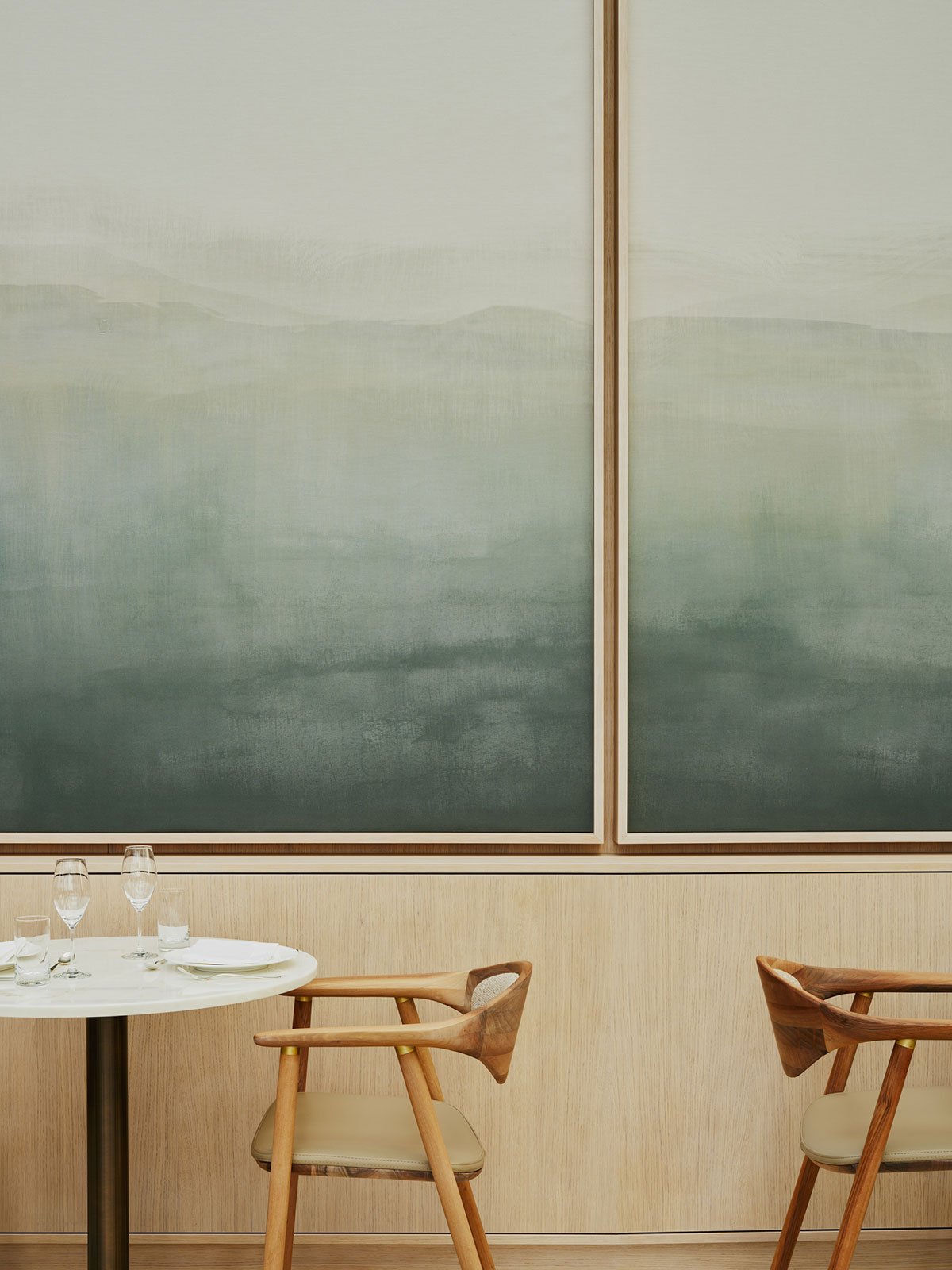 [Text as submitted by architect] Located on the Mittelland Canal of the Volkswagen Autostadt, the Ritz-Carlton AURA restaurant offers unique views of the VW Kraftwerk power station. Characterized by light-colors and natural materials, the warm restaurant interior creates a striking contrast with its industrial setting.