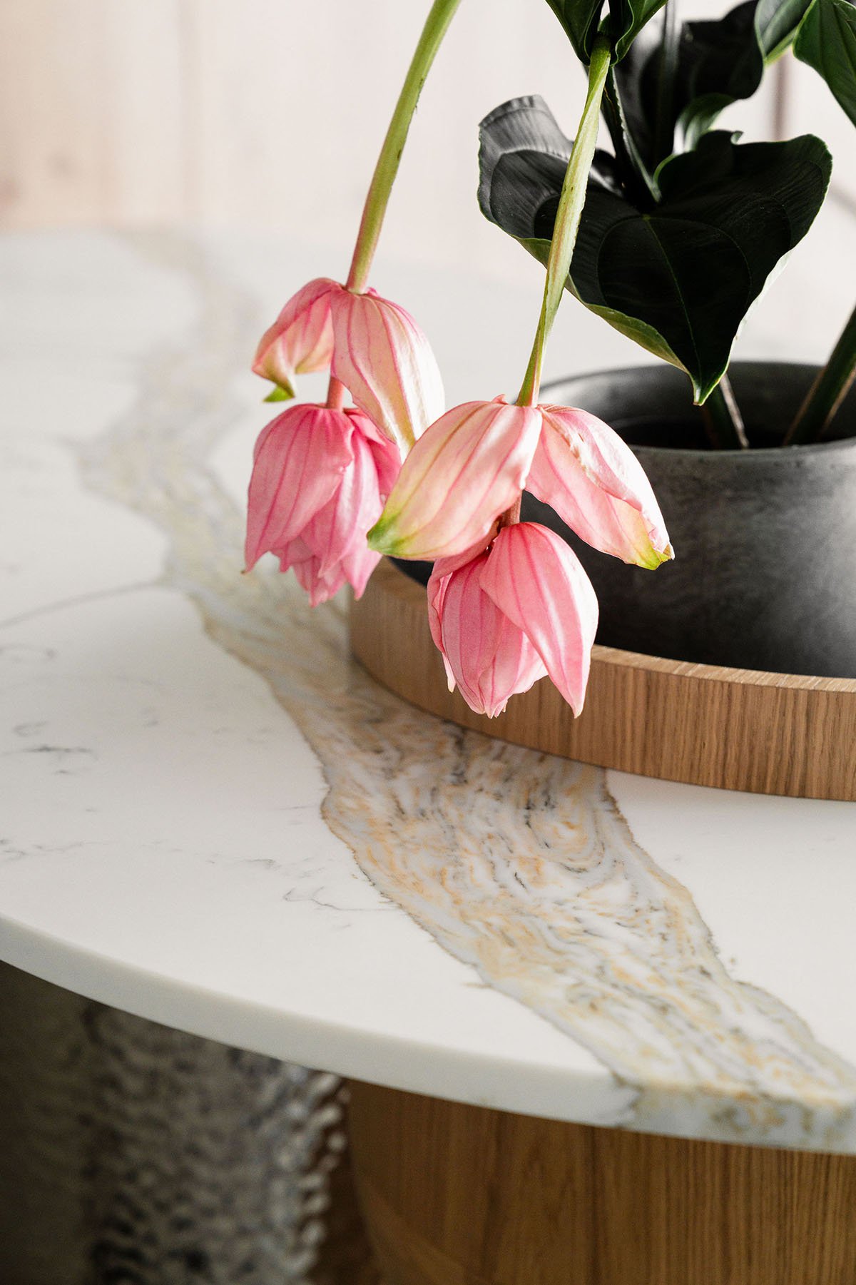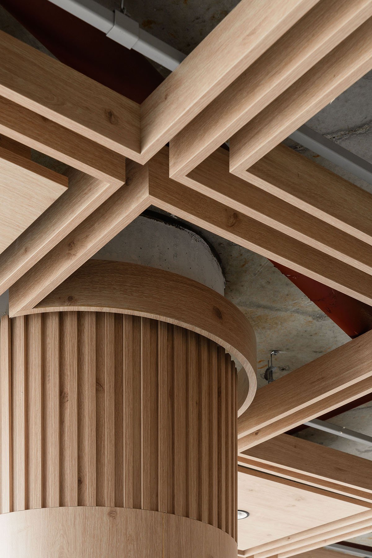 Every detail of the interior was thoughtfully designed. From the heavier, sculptural semi-cylindrical leg of the kitchen island made from solid wood, to Stokowski’s paintings, the illuminated mirrored ceiling, and the subtly embedded Rock Capital logo in the wooden structure—these elements not only define the aesthetic but also build the identity of the space.