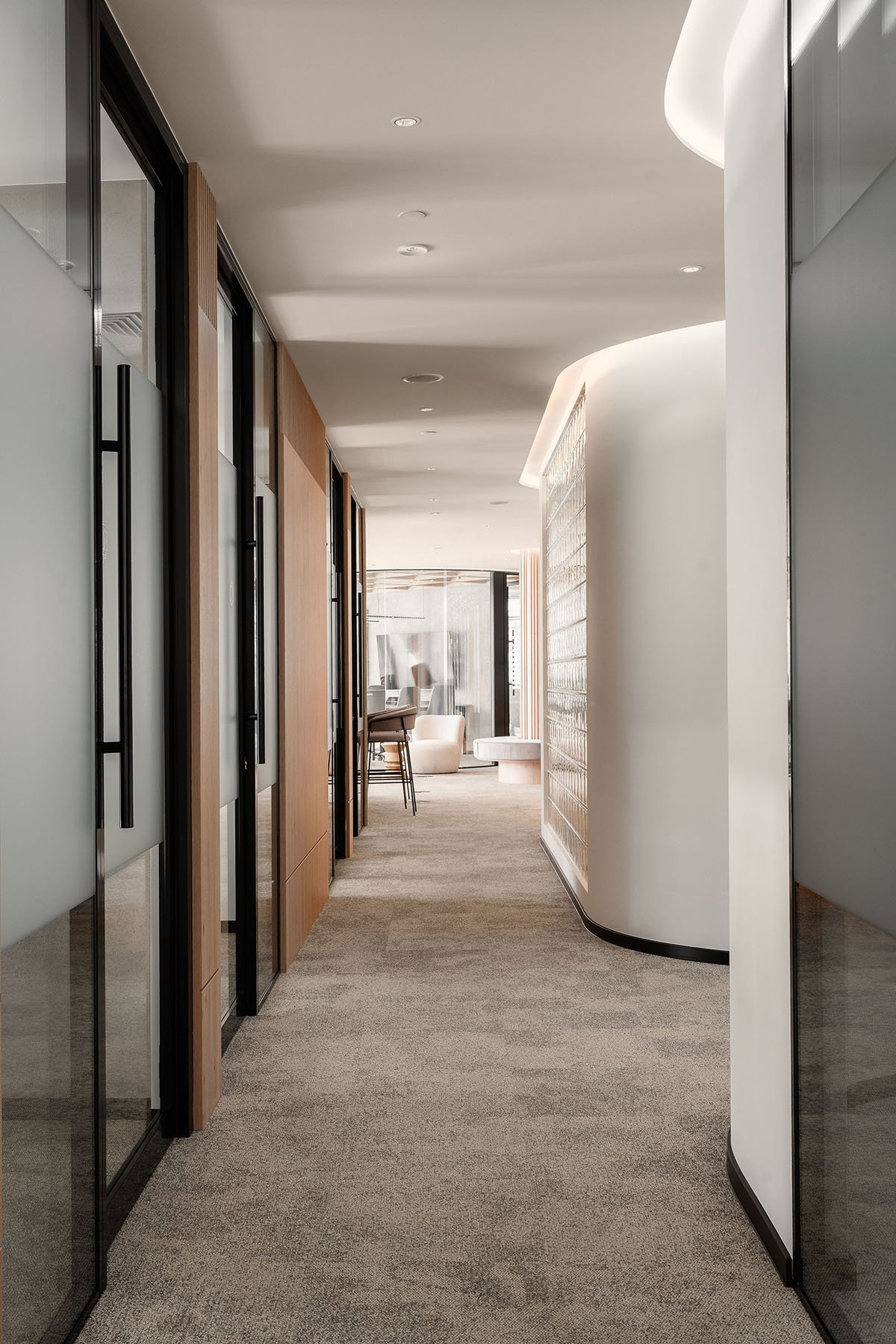 Art as an integral part of the space: Throughout the office, a light, warm color palette prevails—muted beiges, soft greys, and subtle wall textures create a calm and elegant atmosphere. Complemented by localized, delicate lighting designed for ambiance and function, this minimalist foundation forms the perfect backdrop for bold artworks that dominate the space—not only energizing it but also defining its character.