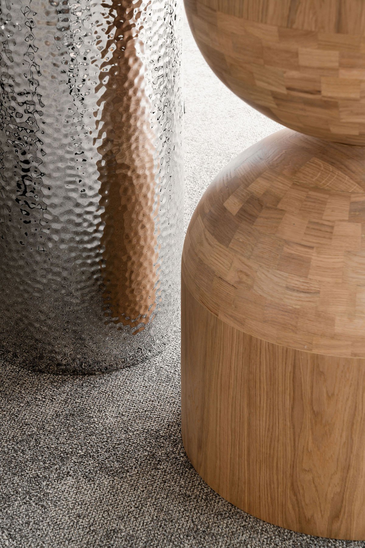 This zone features tables for informal meetings, soft poufs, and a sofa, seamlessly connecting to the kitchen area separated by sliding doors. It is more than just a reception area—it’s also a social space that encourages conversation and togetherness. A standout feature is the hanging piece RONDO by Oskar Zięta in the kitchen—polished stainless steel shaped into a deformed circle, introducing a play of reflections that individualize the surroundings and add artistic depth. It subtly continues the mirrored ceiling motif from the entrance zone, unifying the space and creating a visual rhythm of light throughout.