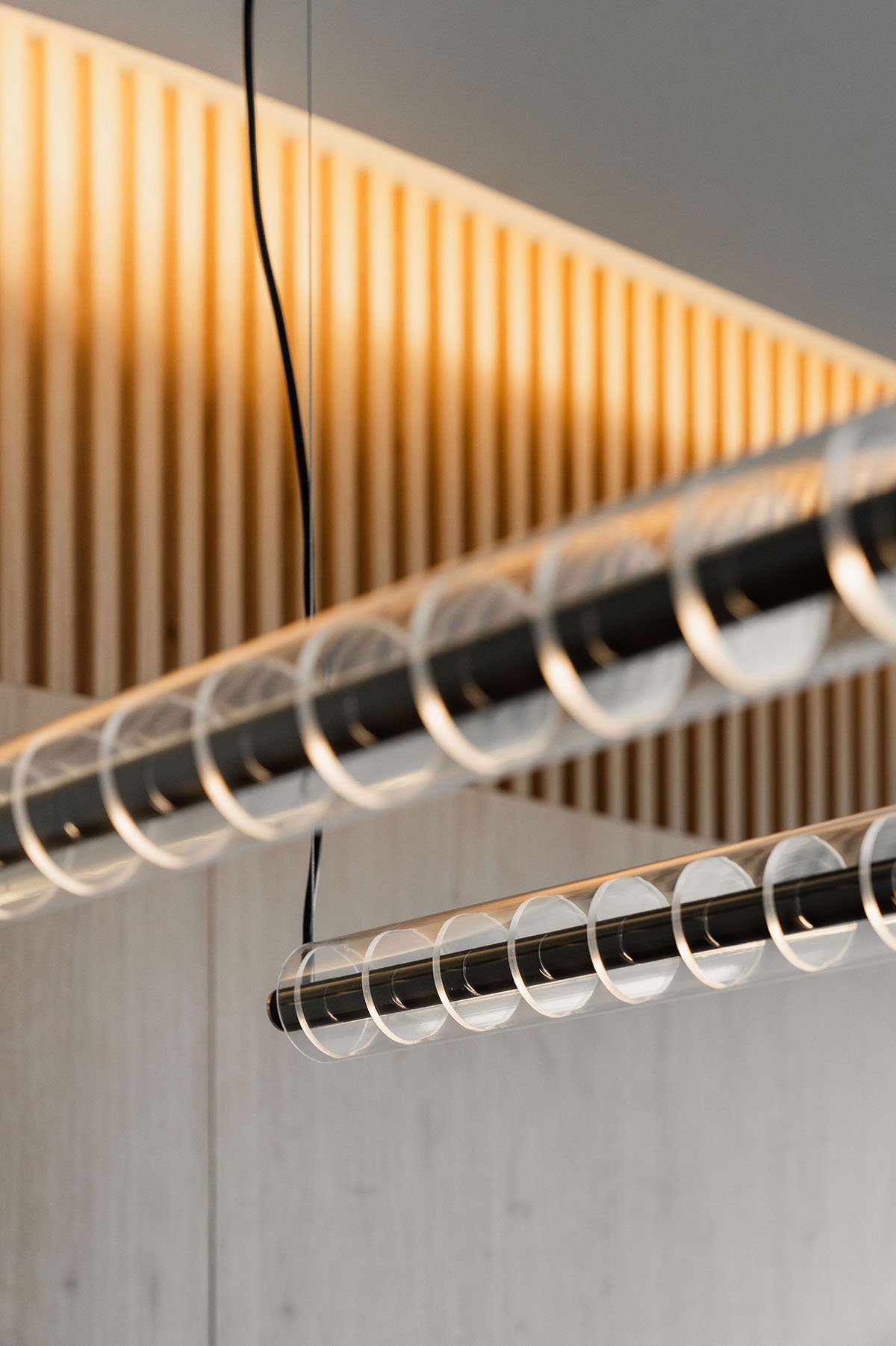 Light and rhythm: From the entrance hall, one enters the representative area—the conference room designed for meetings with external partners. A key element of this interior is the ceiling composed of wooden slats with discreetly integrated lighting. A large table made of sintered stone mimicking natural stone was custom-made for the space—the same material is used in the waiting area, creating visual coherence.