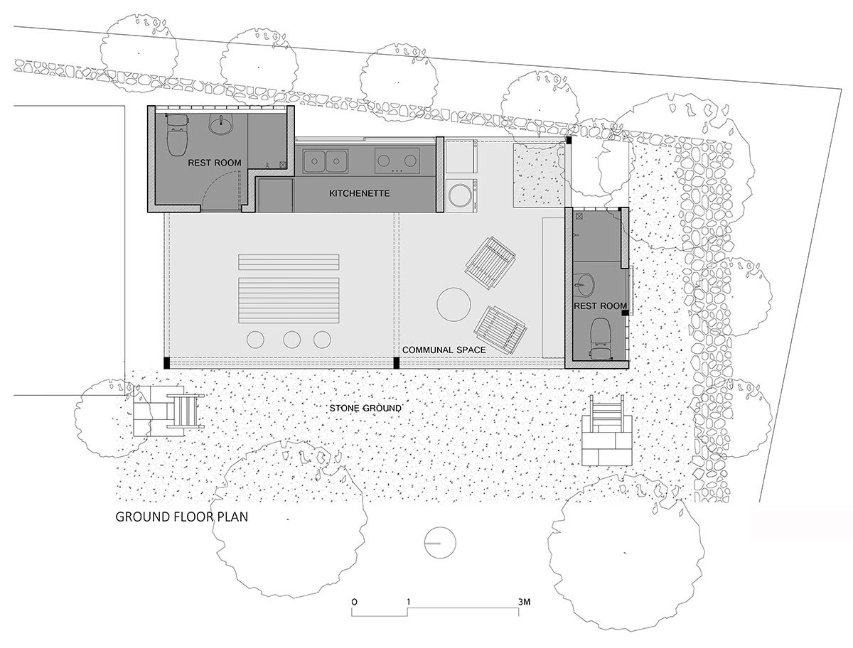 The concept of ‘connection’ is realized by alternating the volumes and creating gaps between them to encourage interaction. the arrangement of the separated volumes – hosting sleeping spaces, rest rooms and the kitchenette – along two stories, created the open volumes that include the common spaces, terraces and voids. through these gaps, people can enjoy the communal areas and the surrounding greenery all under the same roof with skylights.
