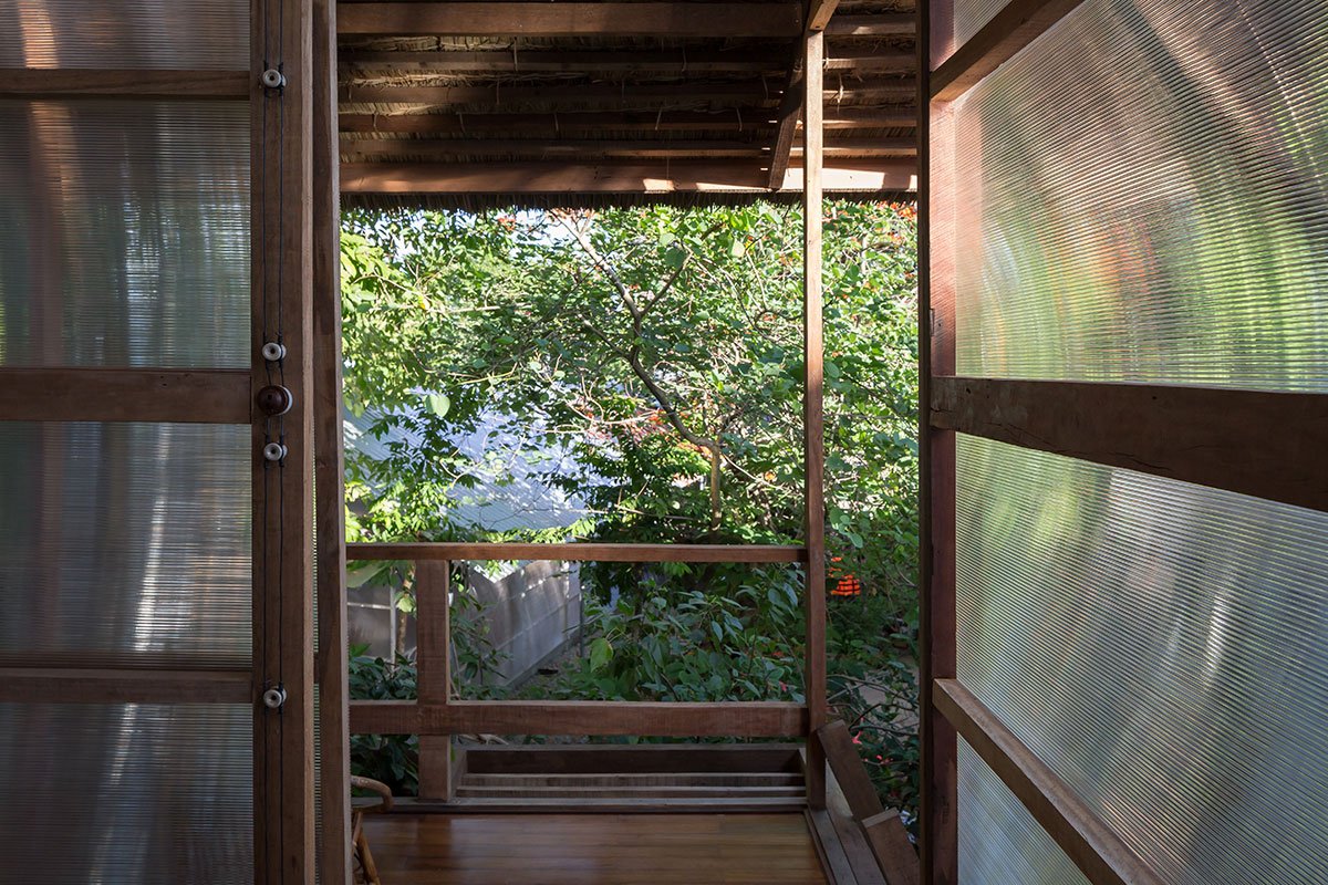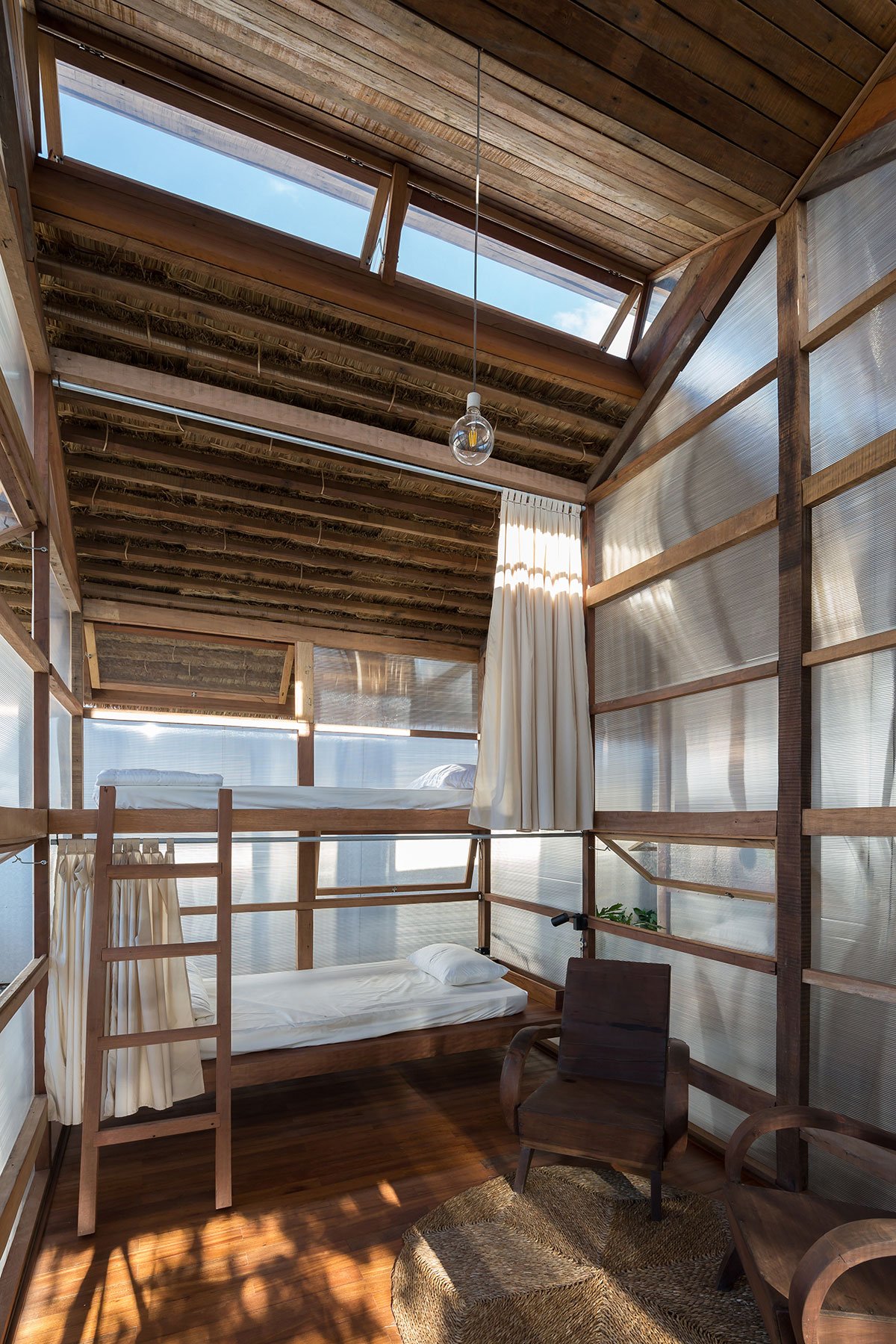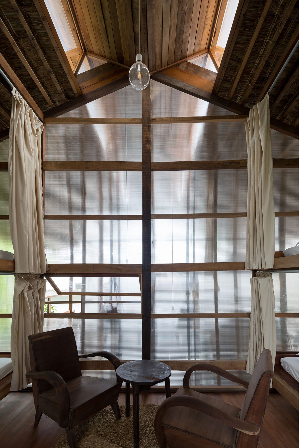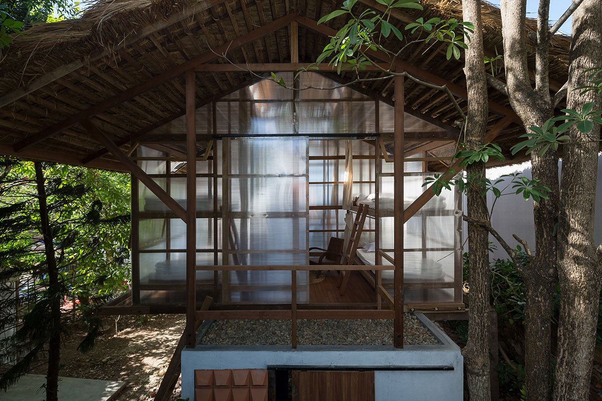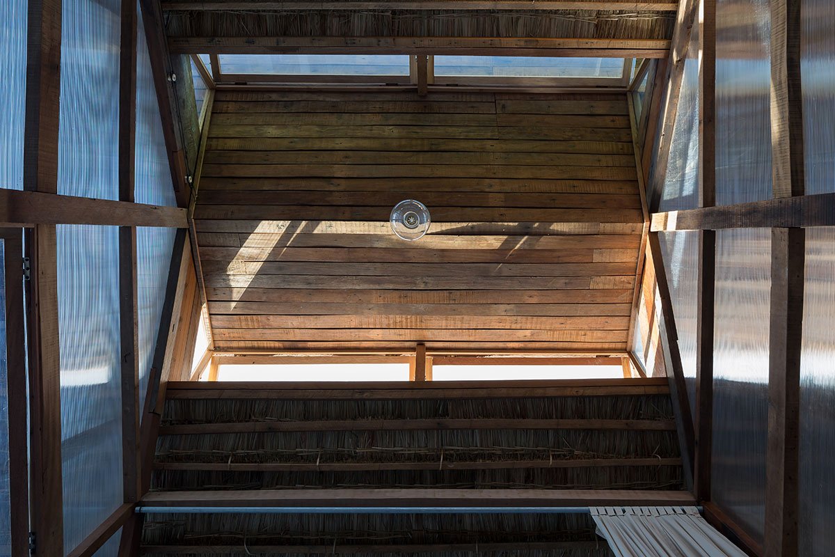 Reclaimed wood and thatch are used for the main frames and roof cover of the hut. Polycarbonate panels cover the sleeping spaces, and help blur the boundaries of the hut. This material provides a translucent barrier that connects the interior spaces with the exterior garden by bringing in natural light and color, yet keeps the spaces closed and private.