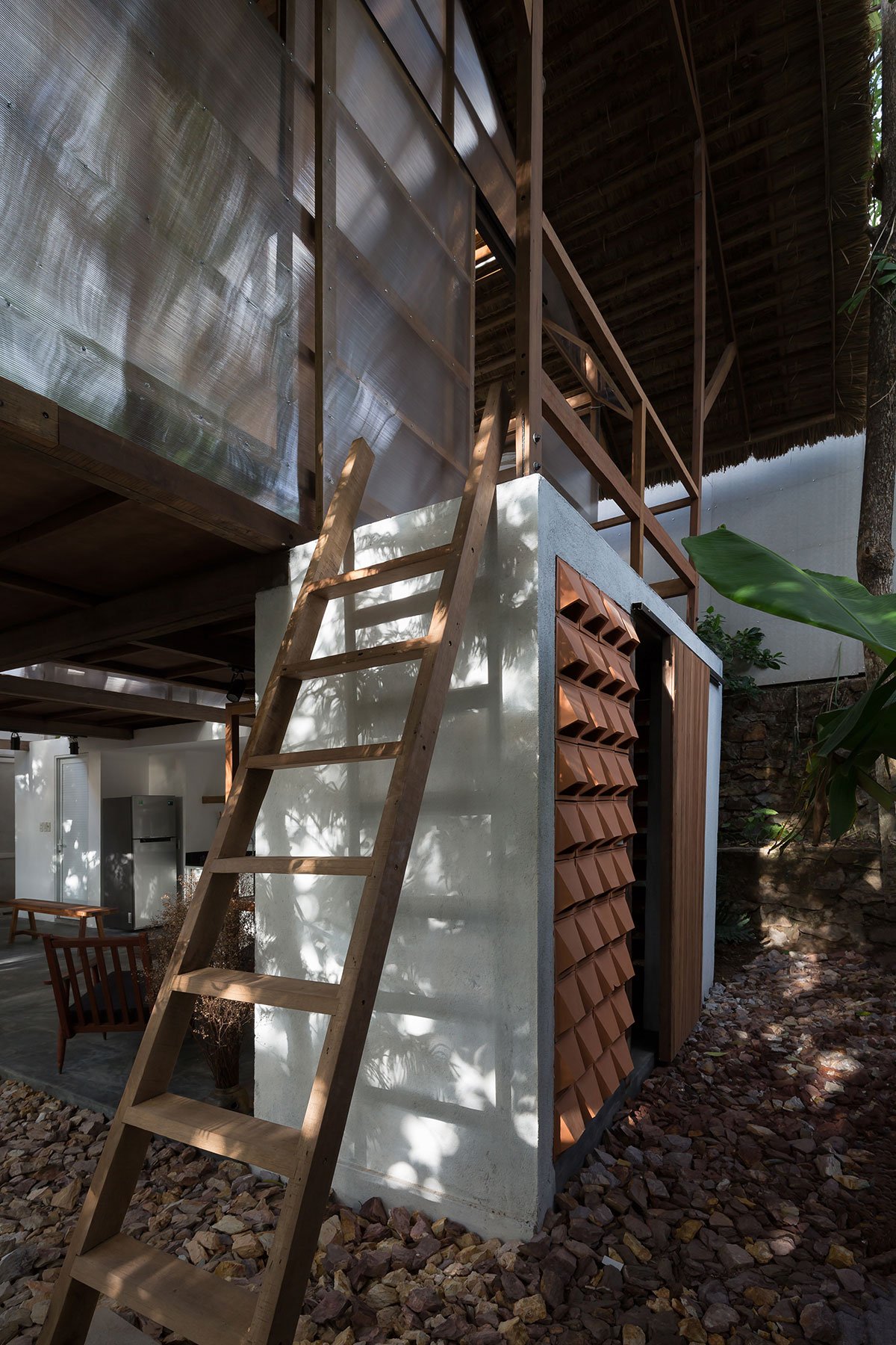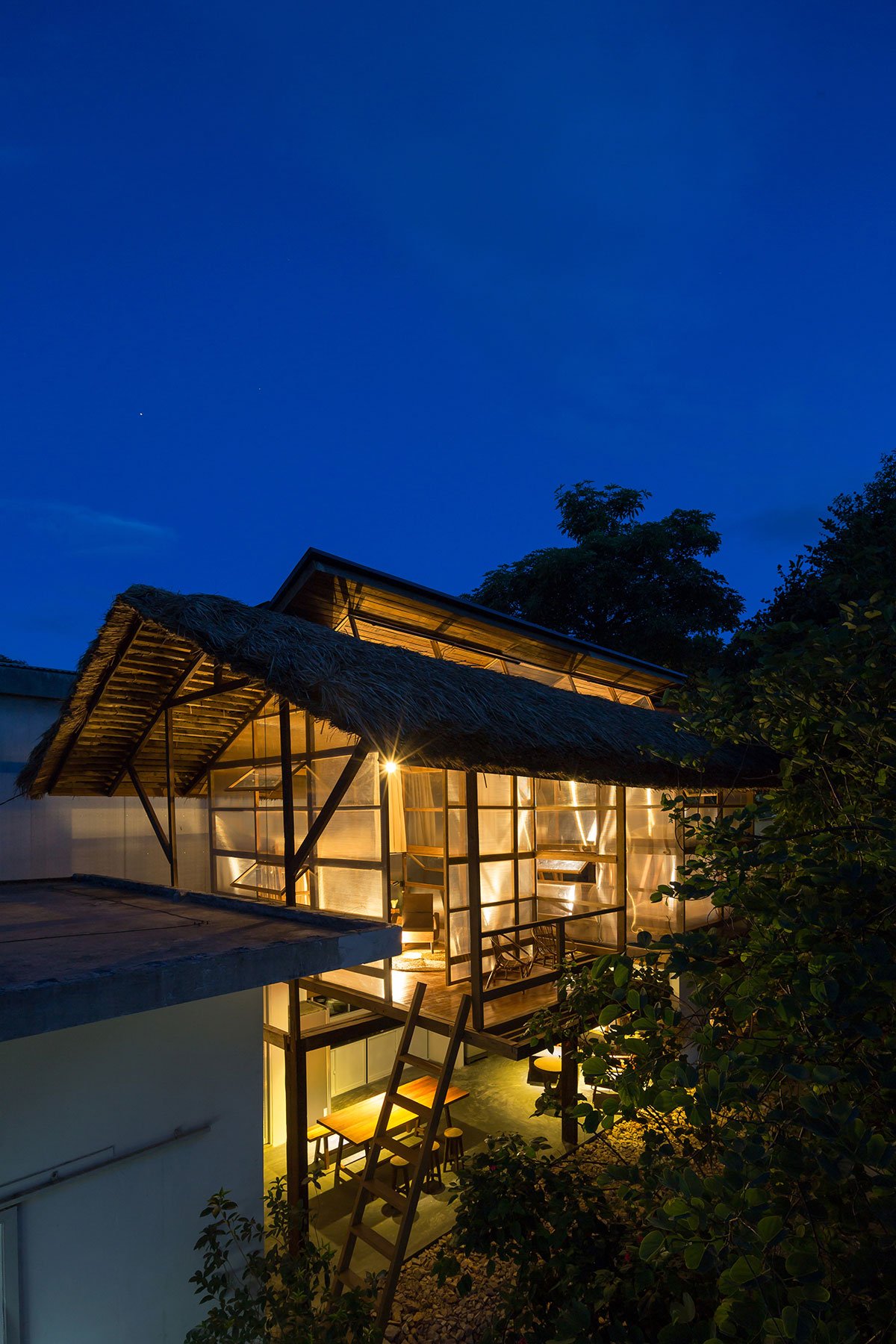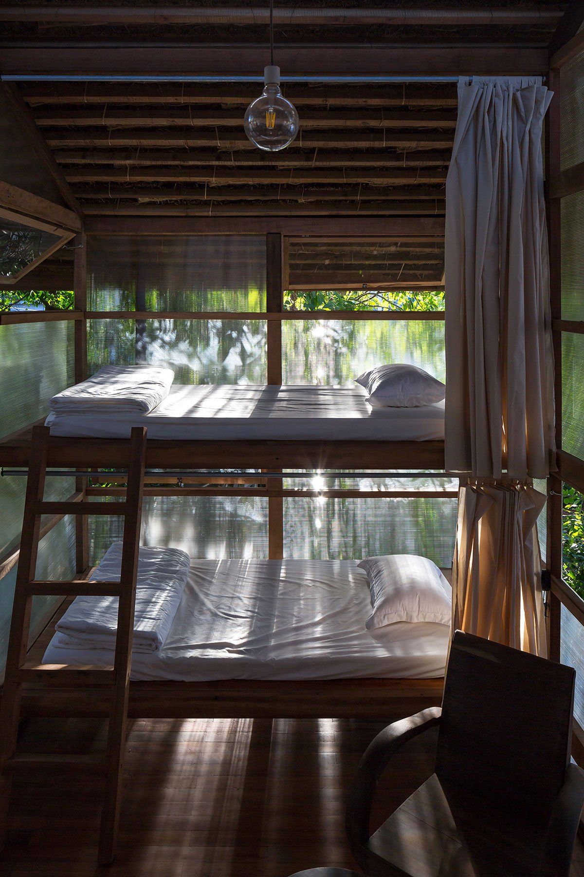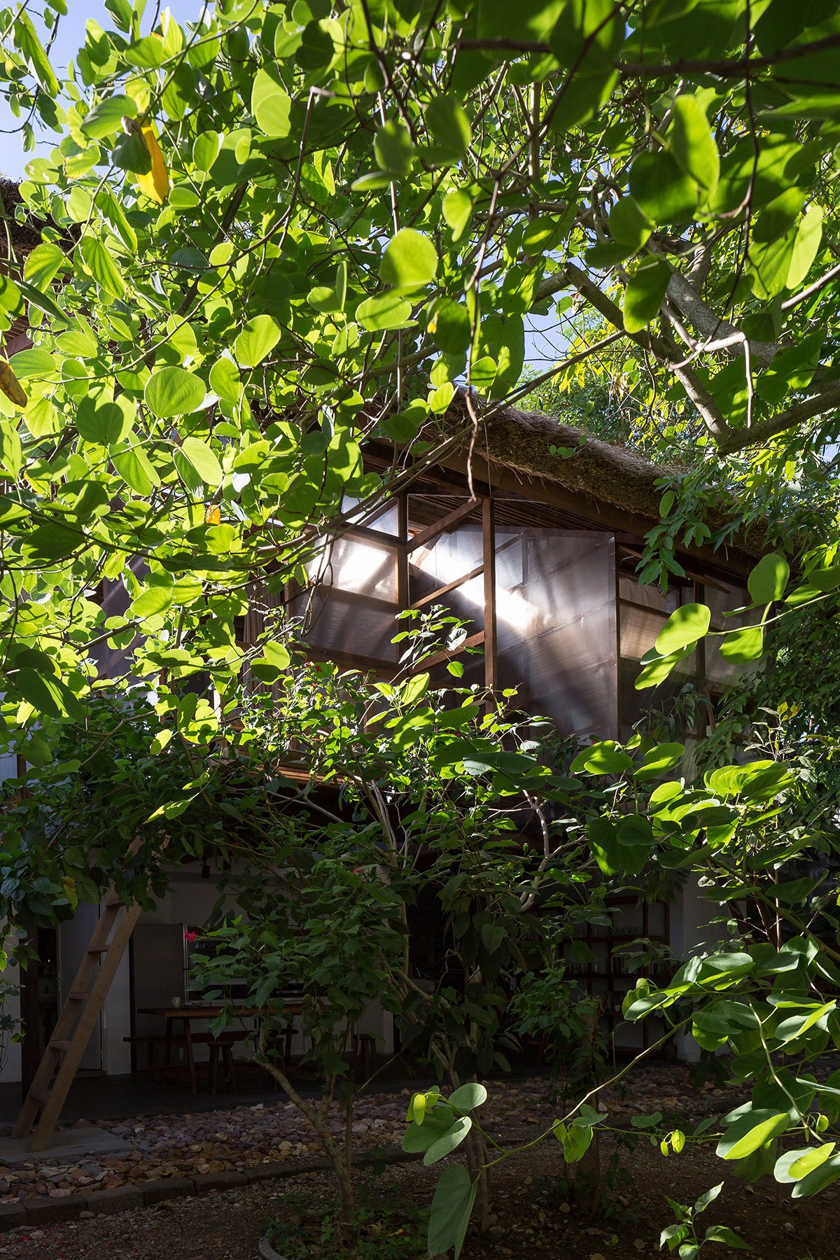 Reclaimed wood and thatch are used for the main frames and roof cover of the hut. Polycarbonate panels cover the sleeping spaces, and help blur the boundaries of the hut. This material provides a translucent barrier that connects the interior spaces with the exterior garden by bringing in natural light and color, yet keeps the spaces closed and private.