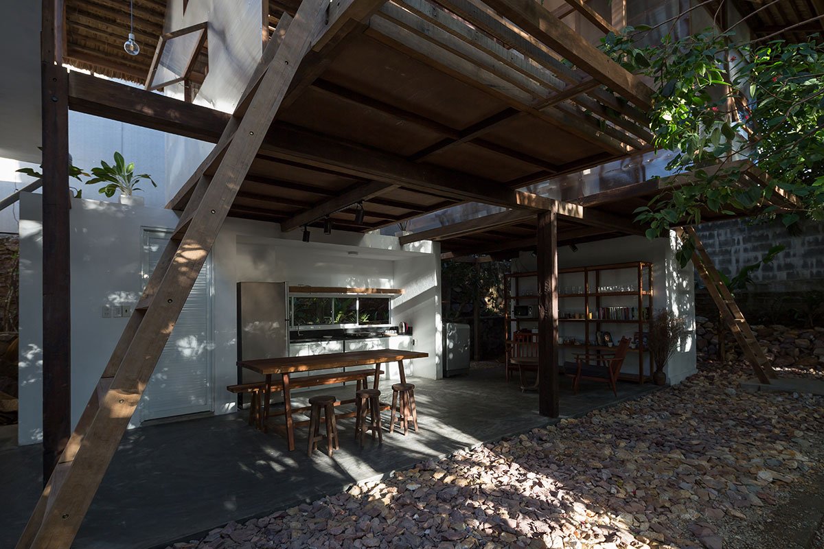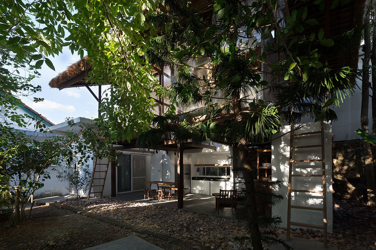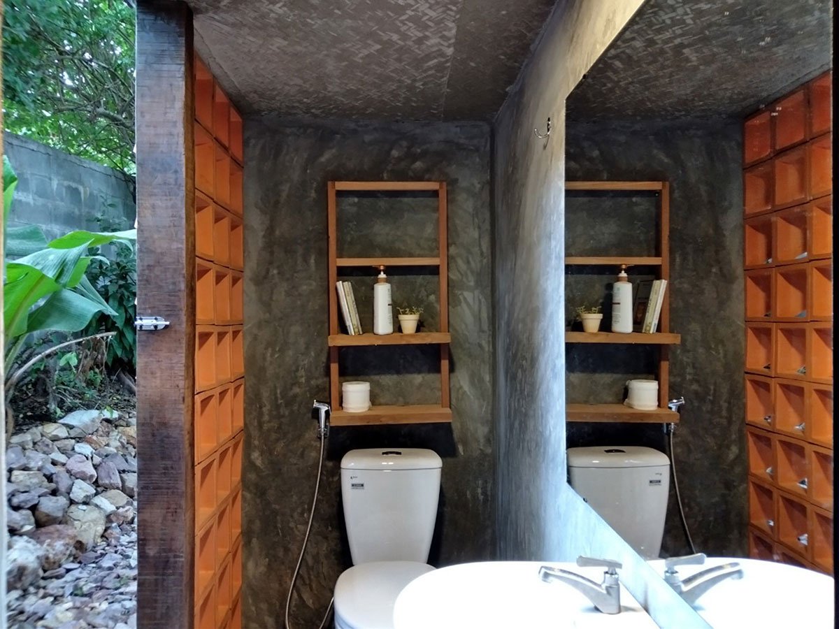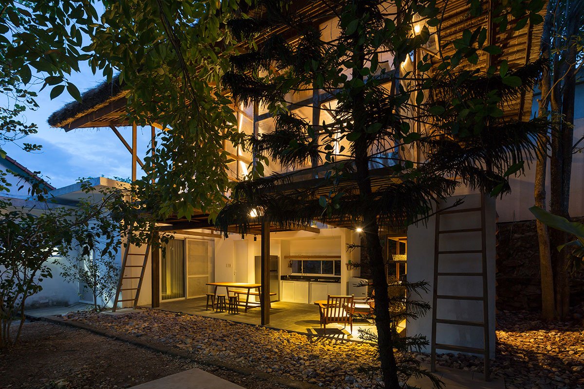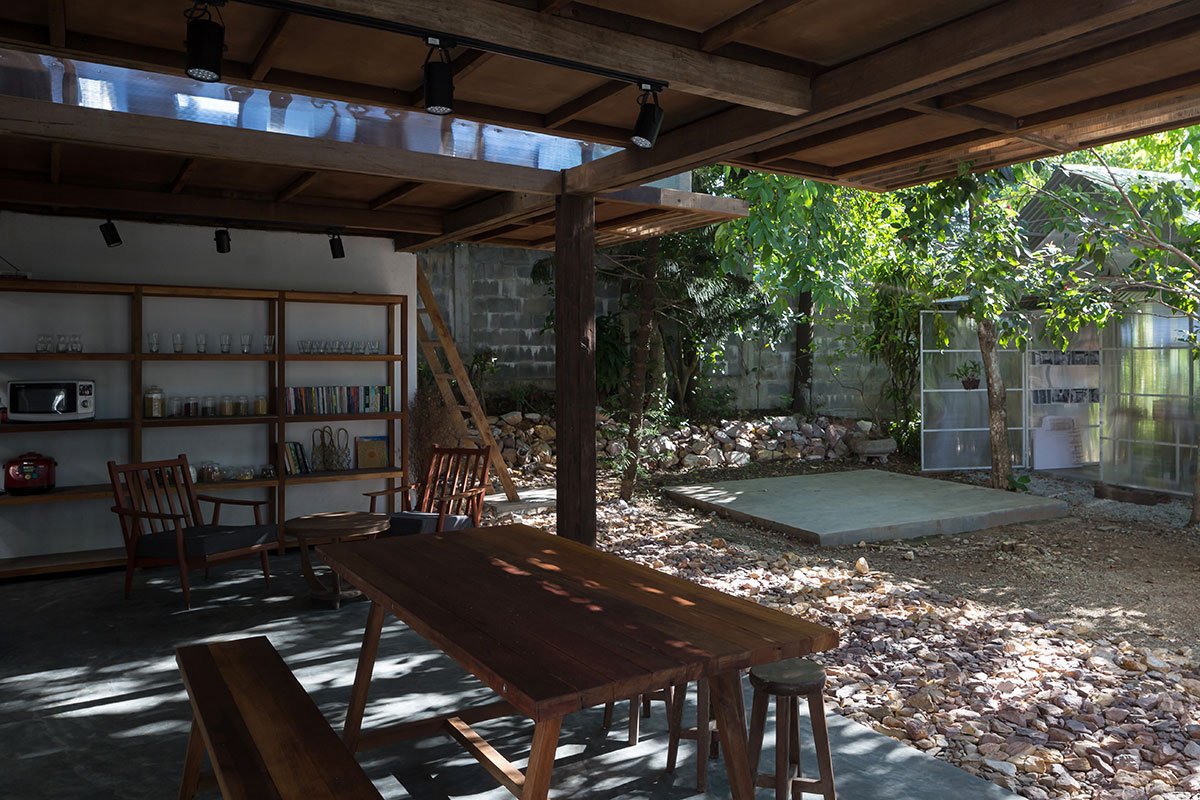 Reclaimed wood and thatch are used for the main frames and roof cover of the hut. Polycarbonate panels cover the sleeping spaces, and help blur the boundaries of the hut. This material provides a translucent barrier that connects the interior spaces with the exterior garden by bringing in natural light and color, yet keeps the spaces closed and private.