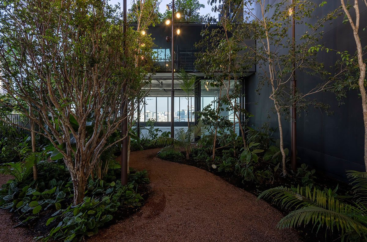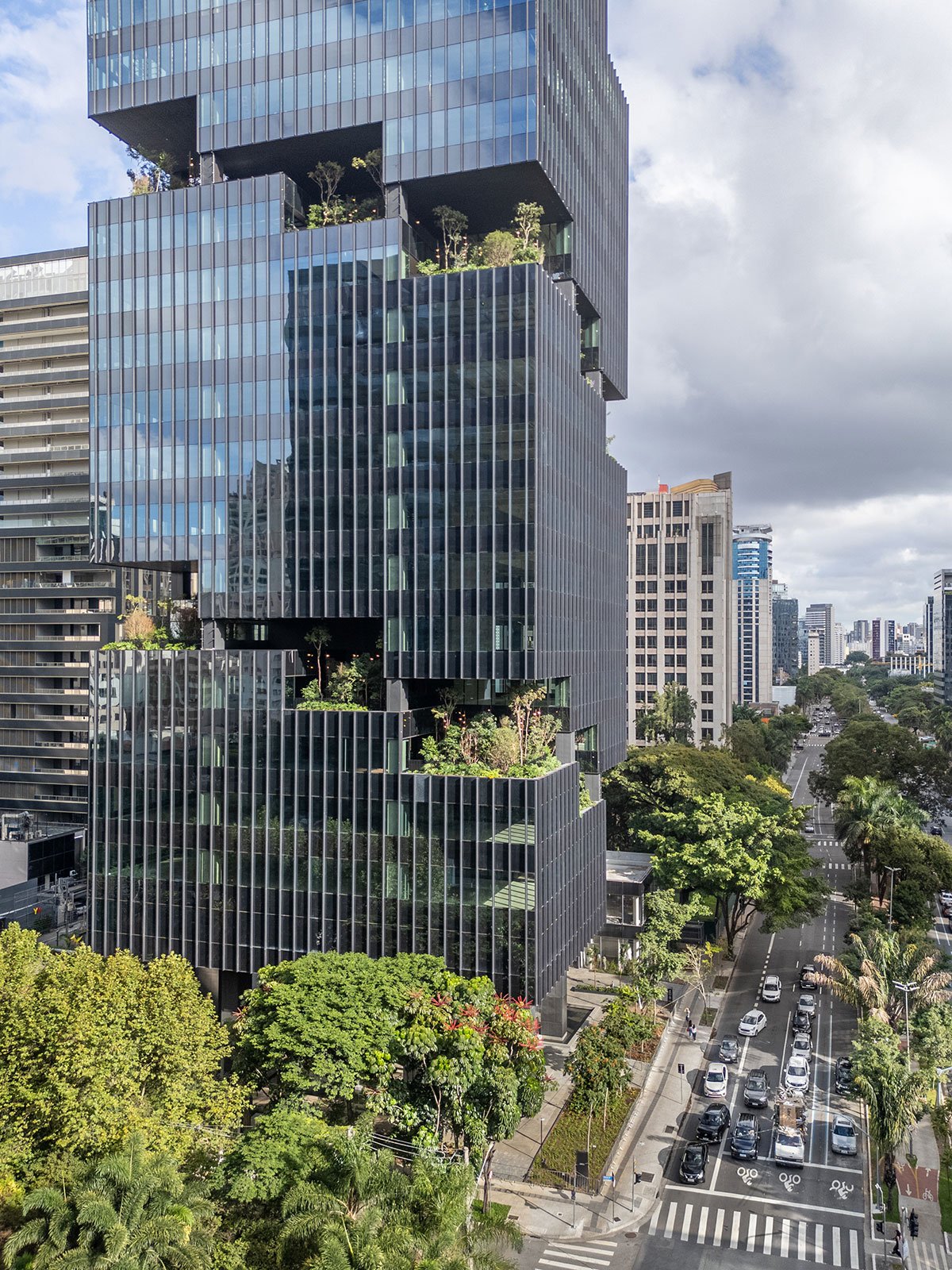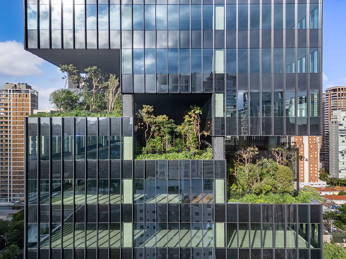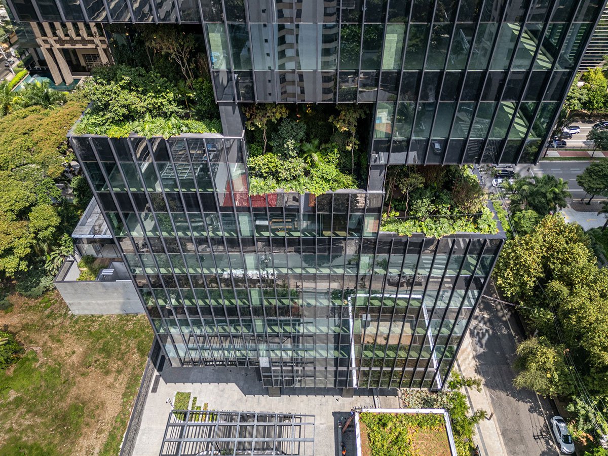 One of the most distinctive features of this project is the presence of 110 m2 woods with double height ceilings on all floors. These spaces were conceived in a spiral arrangement around the central core of the building, which houses the elevators and stairs. With a total area of 1760 m2 of vertical forest, this innovative approach provides invigorating environments in the middle of Av. Faria Lima, as the woods acts as a thermal insulator, acoustic barrier and generates a pleasant microclimate to the tower’s internal spaces, providing a new experience in the way of working.