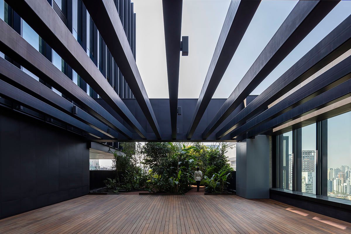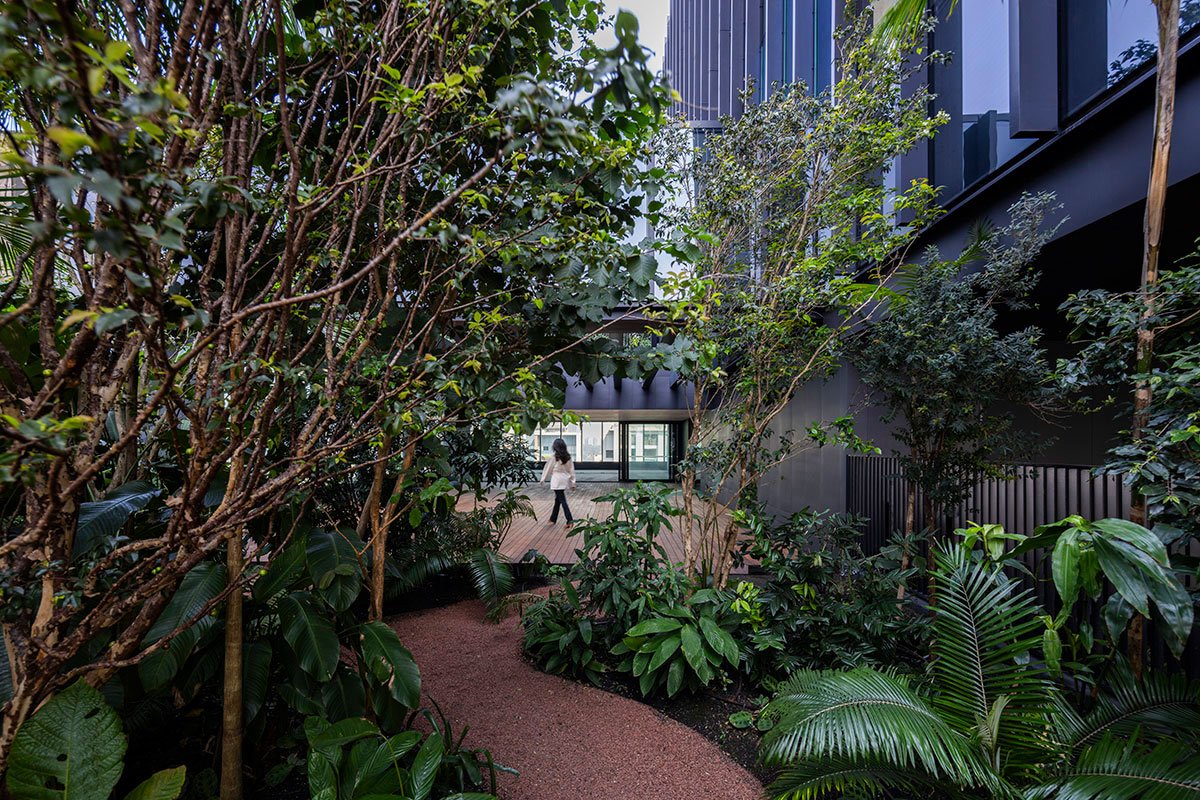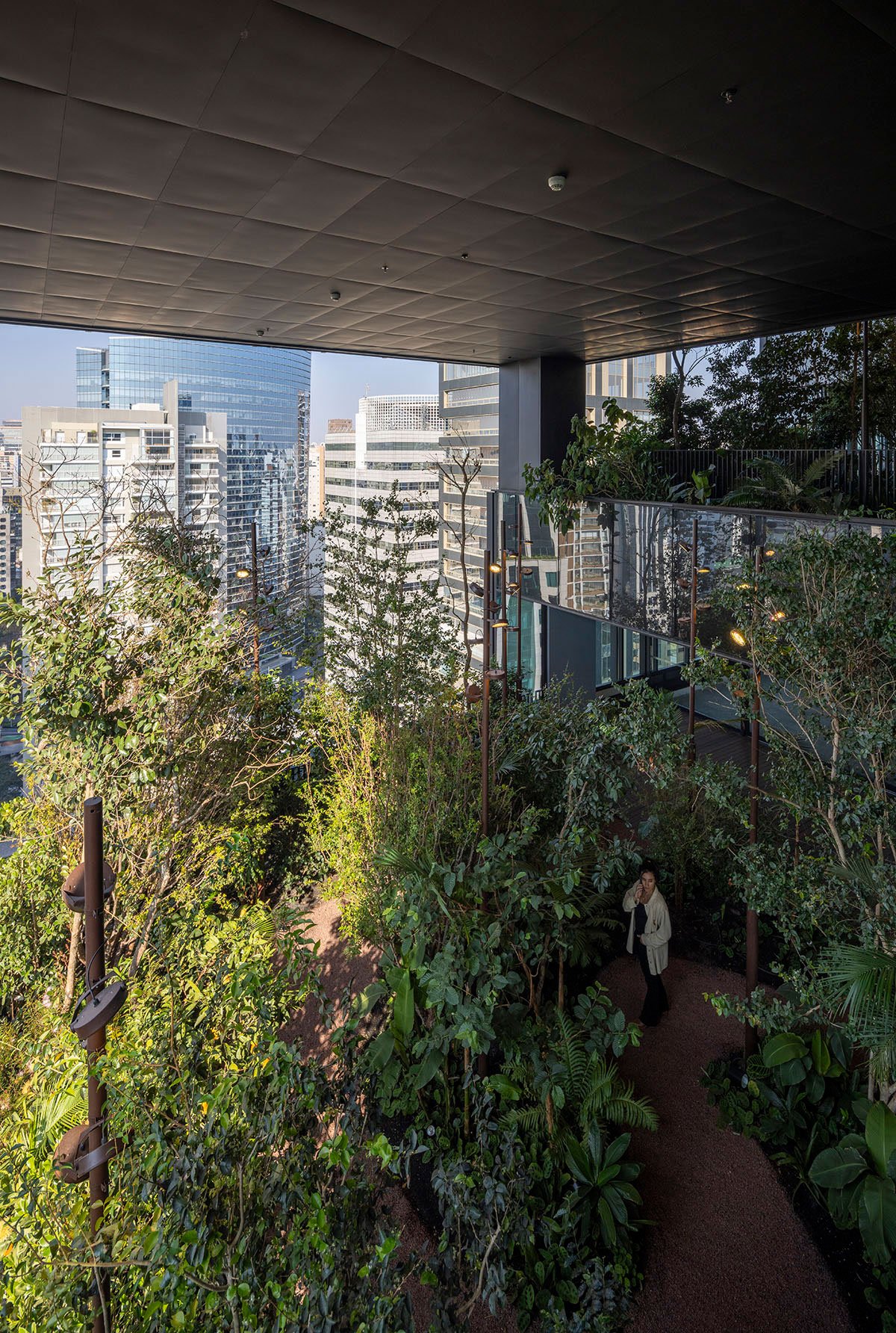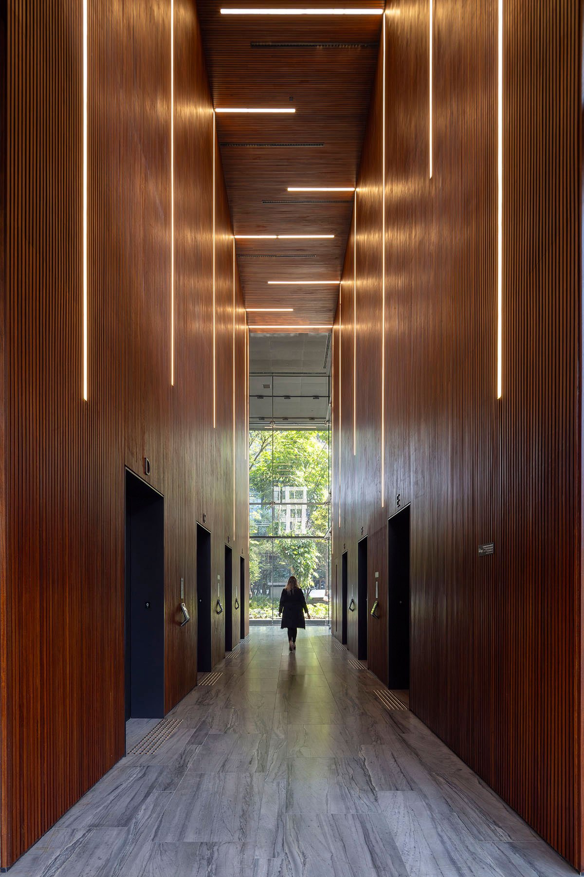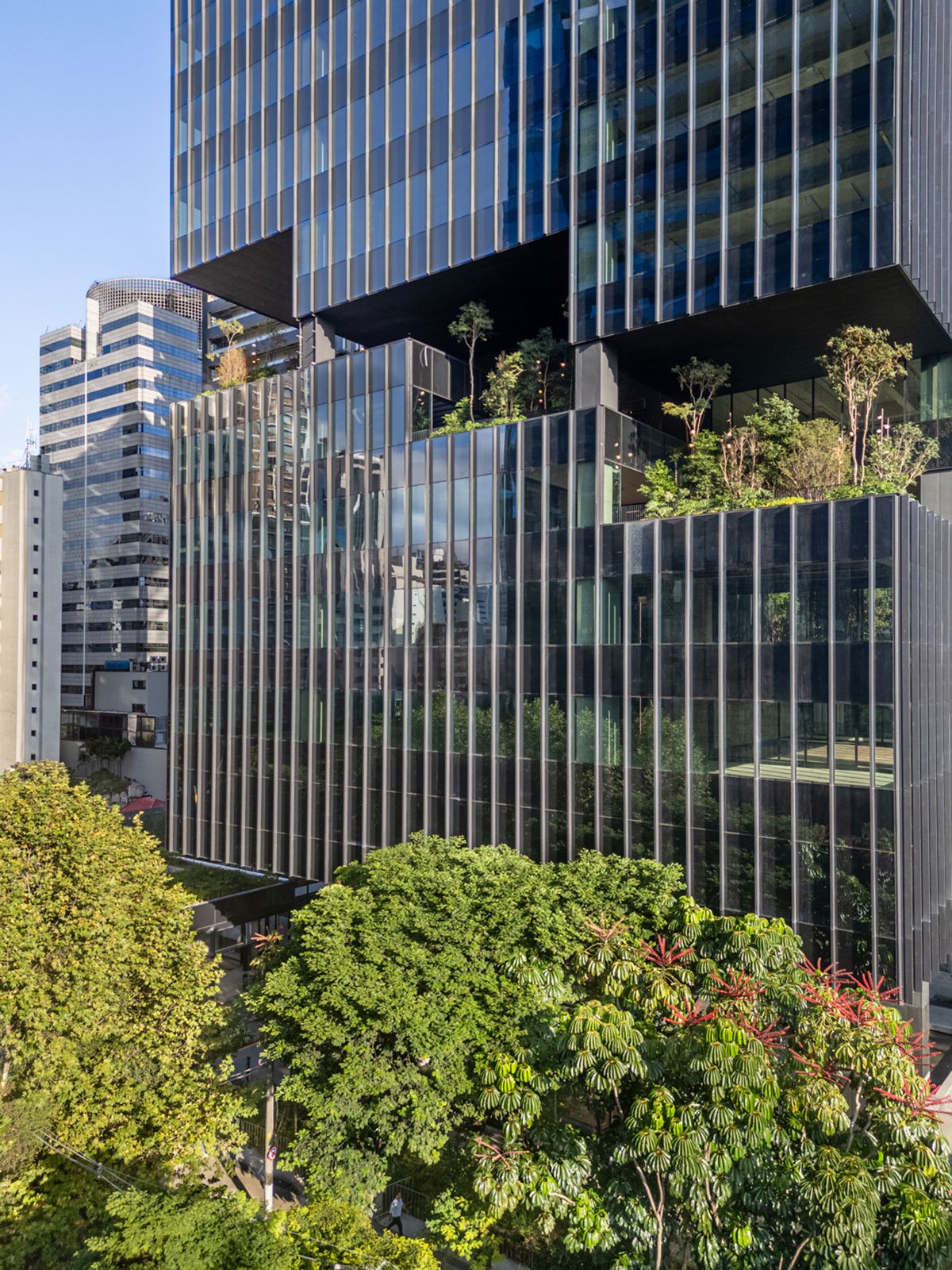 One of the most distinctive features of this project is the presence of 110 m2 woods with double height ceilings on all floors. These spaces were conceived in a spiral arrangement around the central core of the building, which houses the elevators and stairs. With a total area of 1760 m2 of vertical forest, this innovative approach provides invigorating environments in the middle of Av. Faria Lima, as the woods acts as a thermal insulator, acoustic barrier and generates a pleasant microclimate to the tower’s internal spaces, providing a new experience in the way of working.