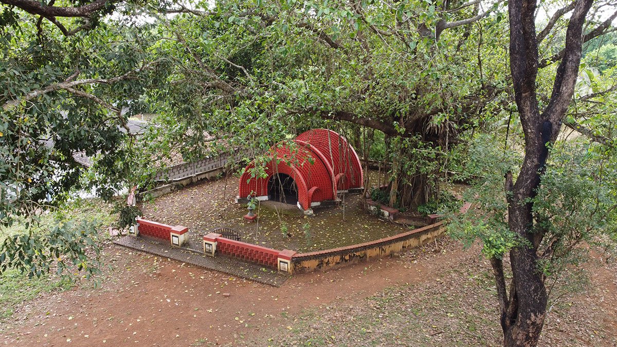In the design process, careful deliberation was given to reduce the number of lines in the plan yet creating a stacked volume inside-out. Having to build an intricate form needed a rigid and stable structural format at the same time using lesser tools, materials and workmanship, which paved the way for Arches. Arches were erected using “Hurudies” porous bricks made of clay, intentionally to integrate the harmonious pattern of voids that are extending radially to infinity of the surrounding. Each arch is made on top of the spine arches, so to minimize the need for shuttering and providing a reference line throughout. Enhancing the outward flow of positive energy originating from the sanctum. Places of culmination and gatherings have originated from the caves, the structure invites its user to experience the same. Entrance is oriented towards east, where the voids of the hurudies bring light and guides the wind through the structure. To embrace the context of the structure a fabric of earthen brick jallies were placed as the pavement filled with rock chips. Which also provides a medium for the water to drain through.