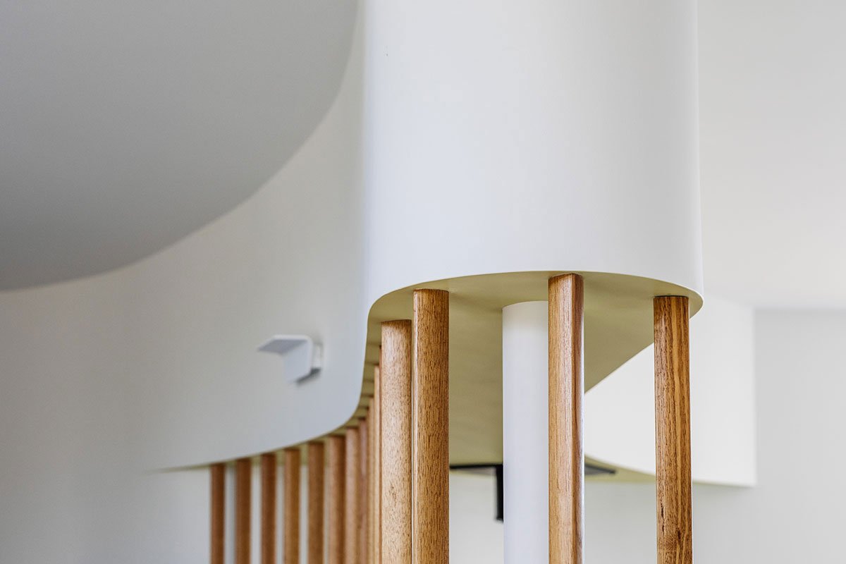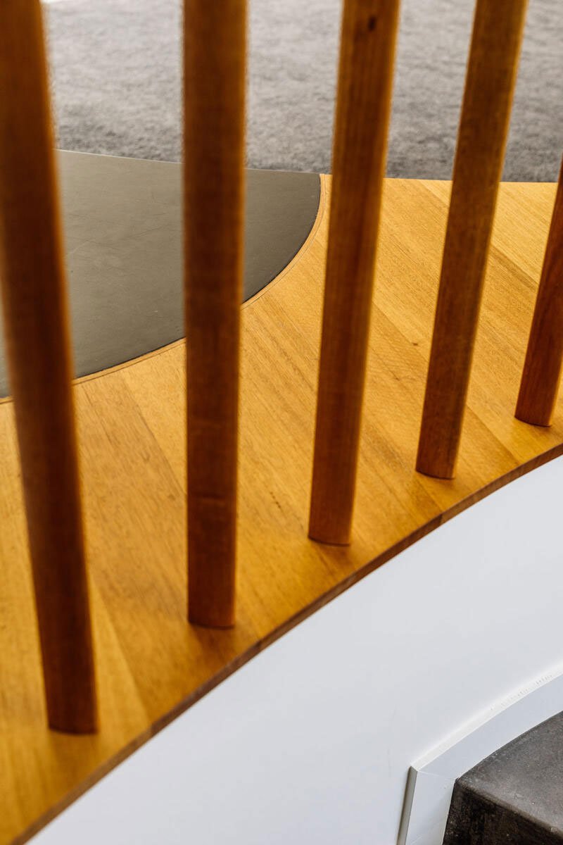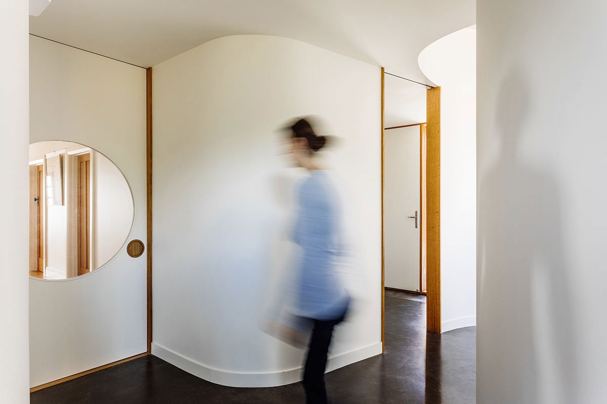 The new service spaces sit in between the new living spaces and the bedrooms, acting as a threshold between public and private. The new living spaces step up the site to relate to the adjacent outdoor levels, while internally the level changes delineate between spaces, creating opportunities for cosiness in an open plan layout. The curvaceous walls wrap the extension around the north-facing garden externally; while internally they allow for an easy, relaxed movement. The large east-facing window of the Lounge admits morning sun and affords views to the River Derwent. The window has been detailed to conceal the frame internally, so that the window itself disappears and the room feels like it is open to the outside.
