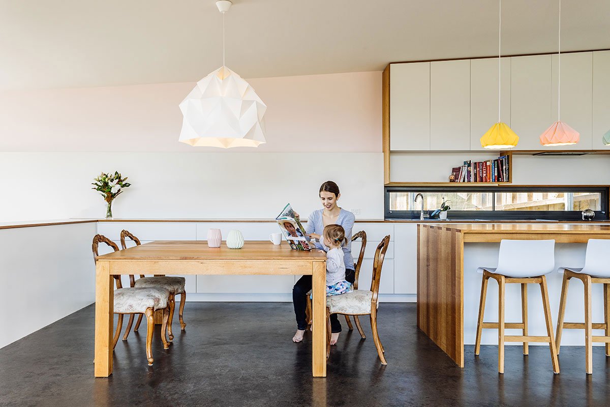 The Lounge is arranged to feel sunken, to create a feeling of warmth and enclosure, while still being connected to the Kitchen and Dining. The Kitchen and Dining space allows for flexible use – whether sitting at the dining table, at the island bench, on the floor or in the window recess – patterns of use can change as the children grow; and large gatherings of family and friends can be accommodated while it remains a comfortable scale for one or two people. The in-slab hydronic heating provides discrete warmth while the glazing has been arranged to capture sun throughout the day.